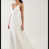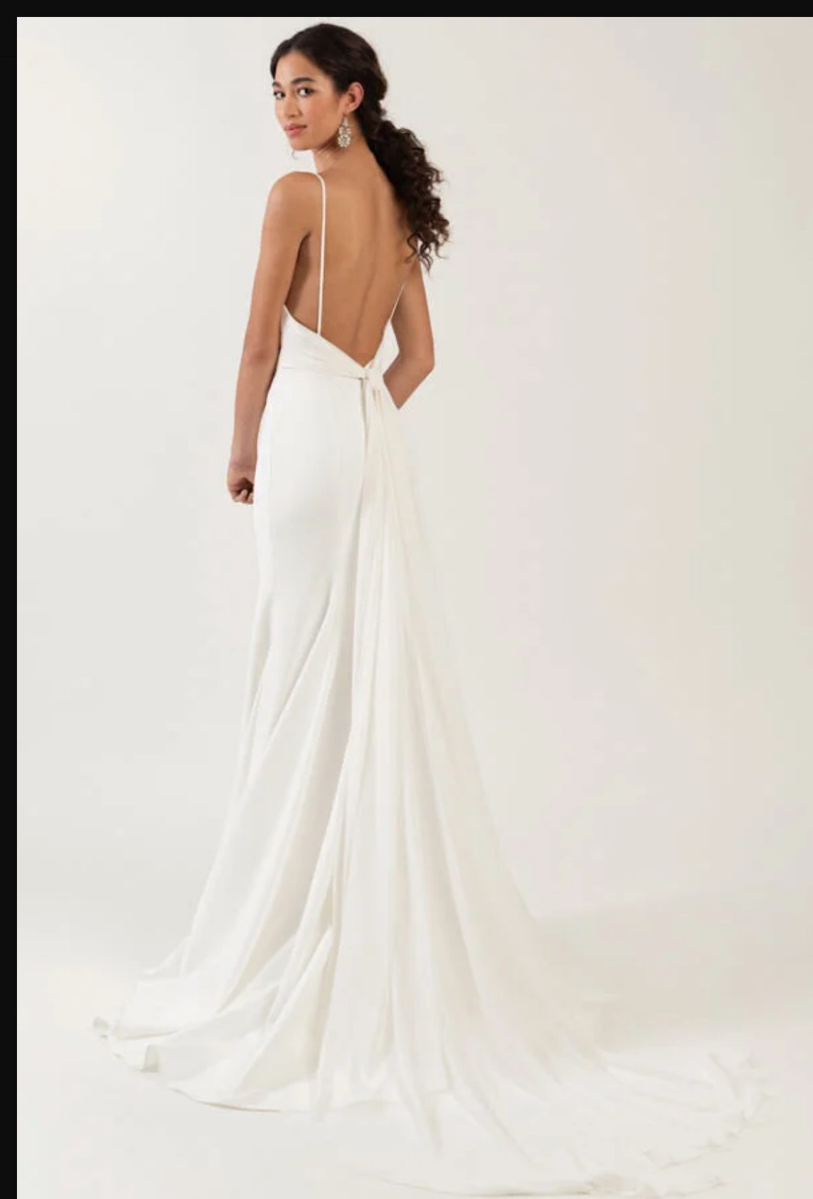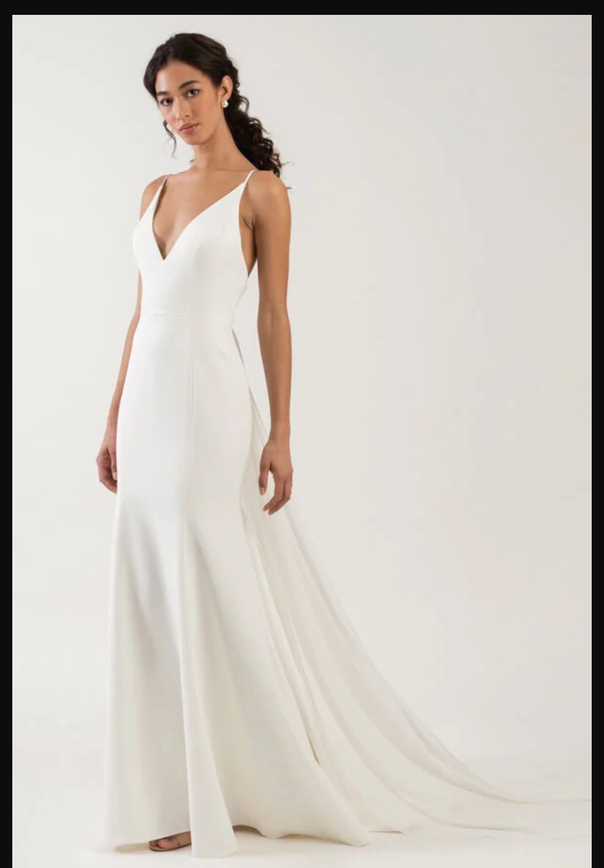 From website: The Marley V-neck bridal gown is as chic as she is simple. The classic fit and flare silhouette effortlessly flatters your curves, and the bodice tapers up to a delicate spaghetti strap to highlight your shoulders beautifully. The open back gives way to a chiffon tie that lends a dramatic finish to this modern gown.
