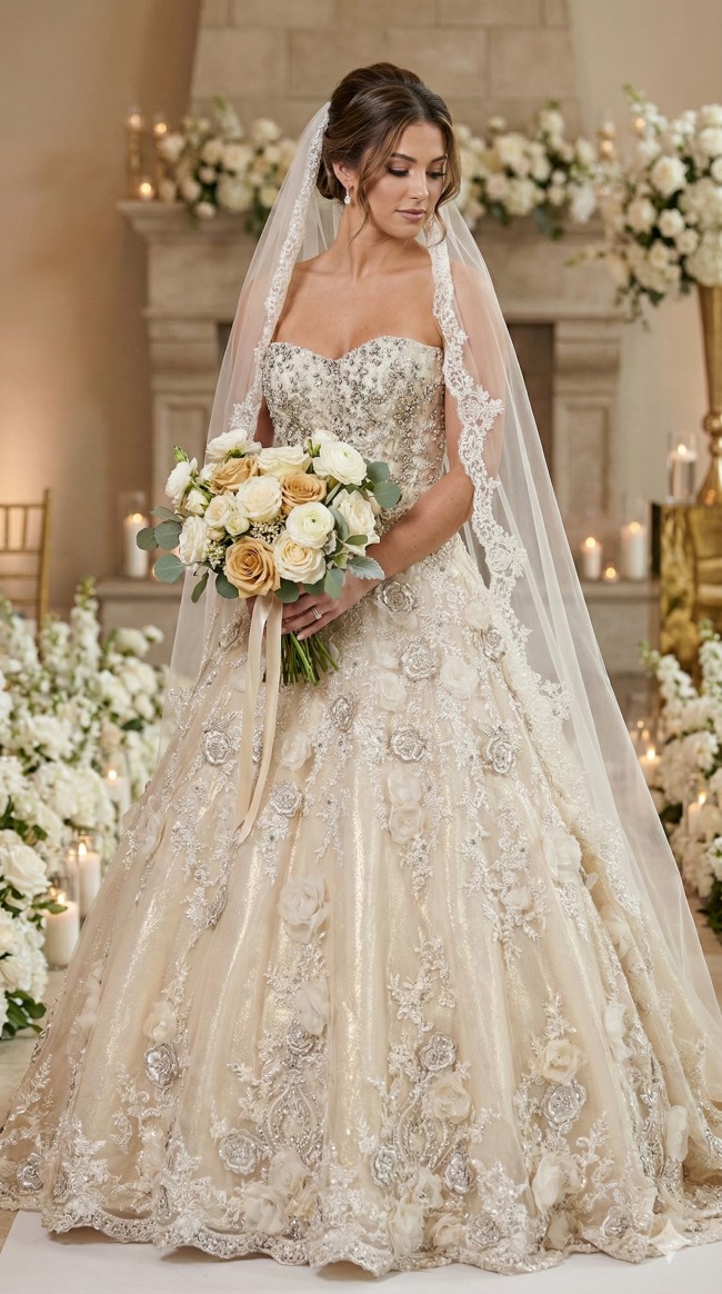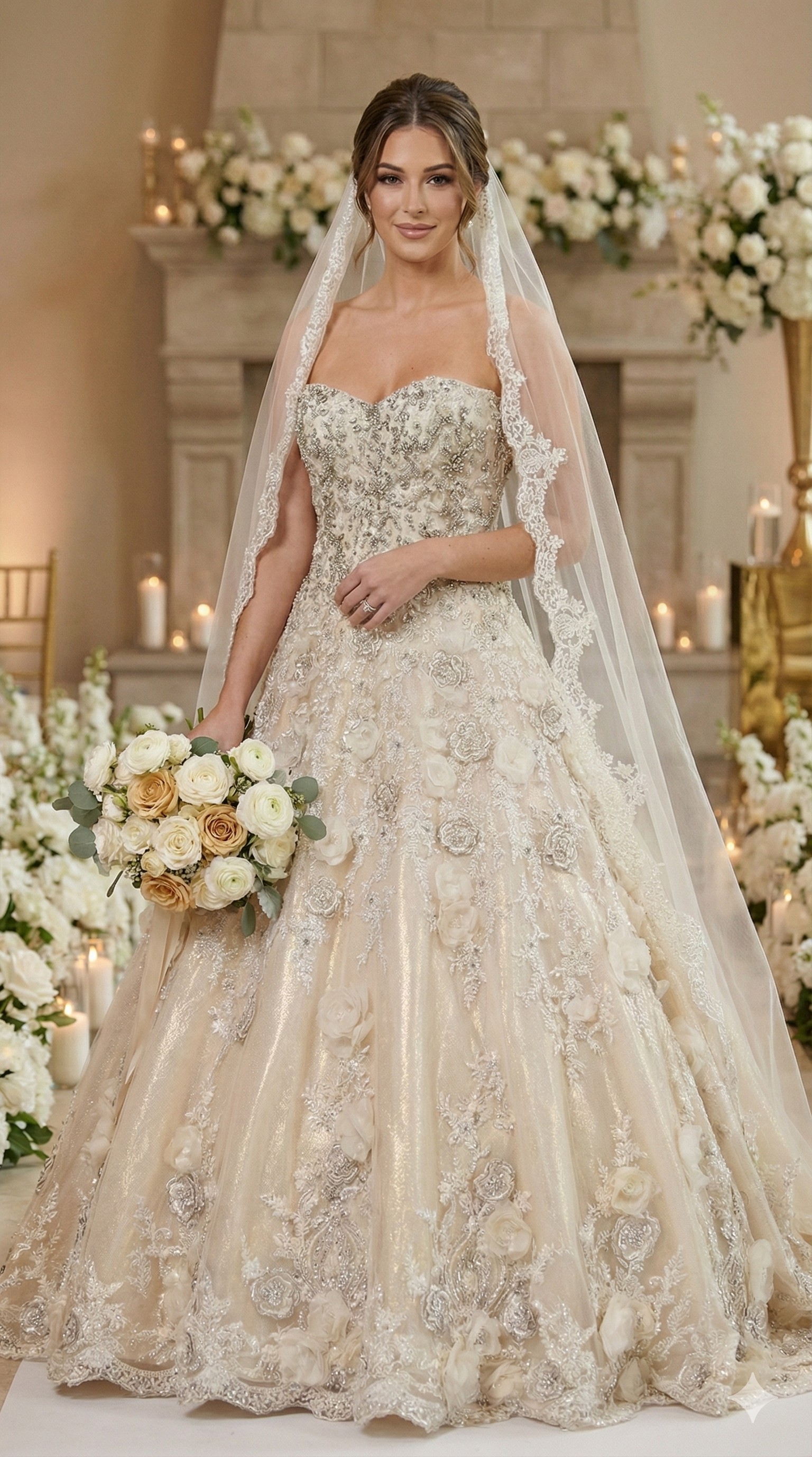 🔹️Silhouette: Regal ball gown with a structured, corset-style bodice and a full, sweeping skirt