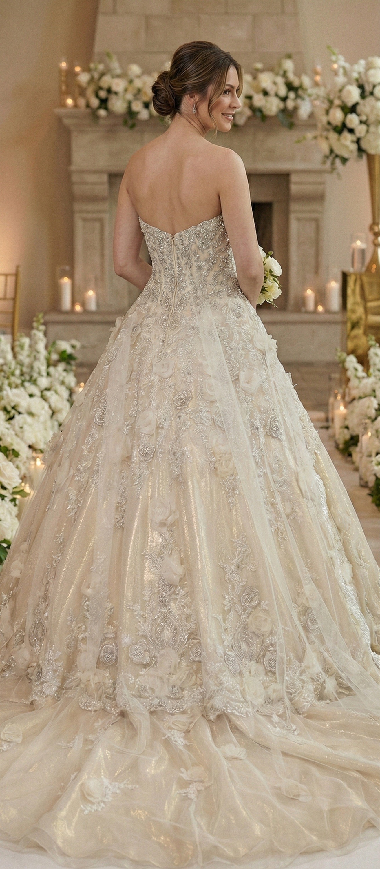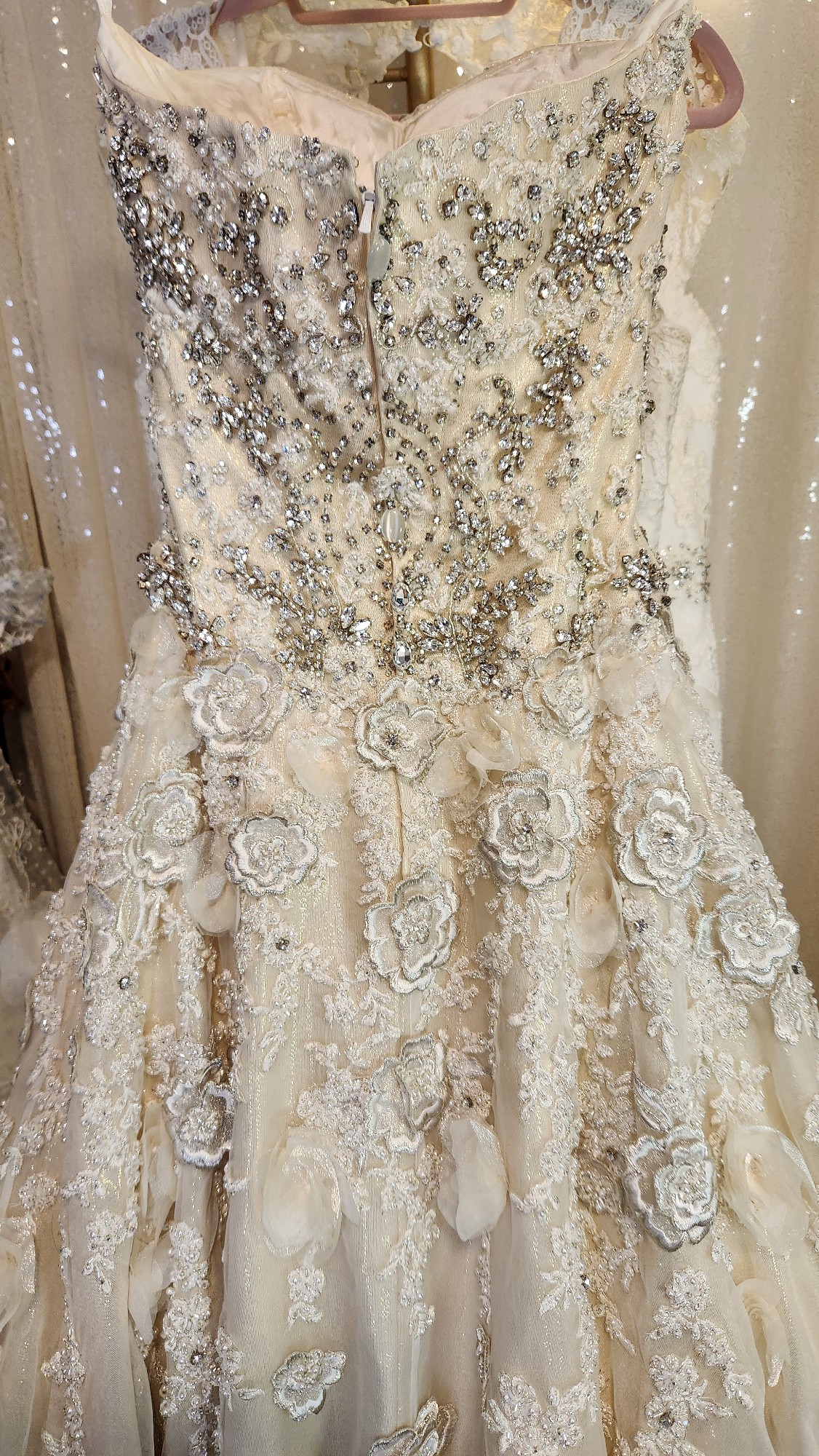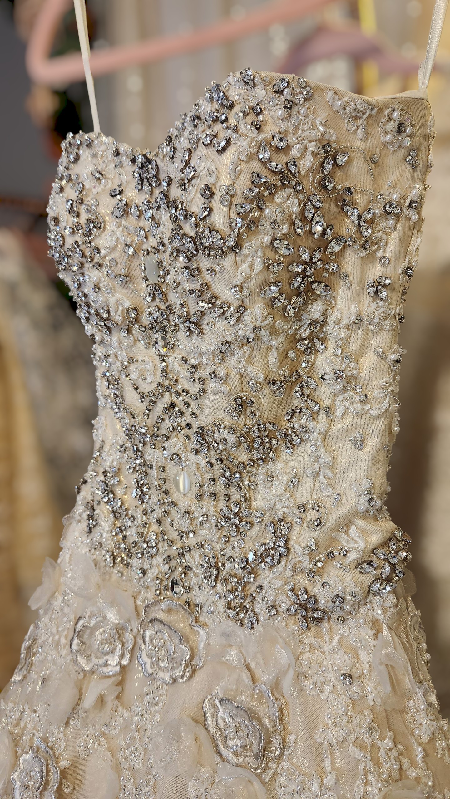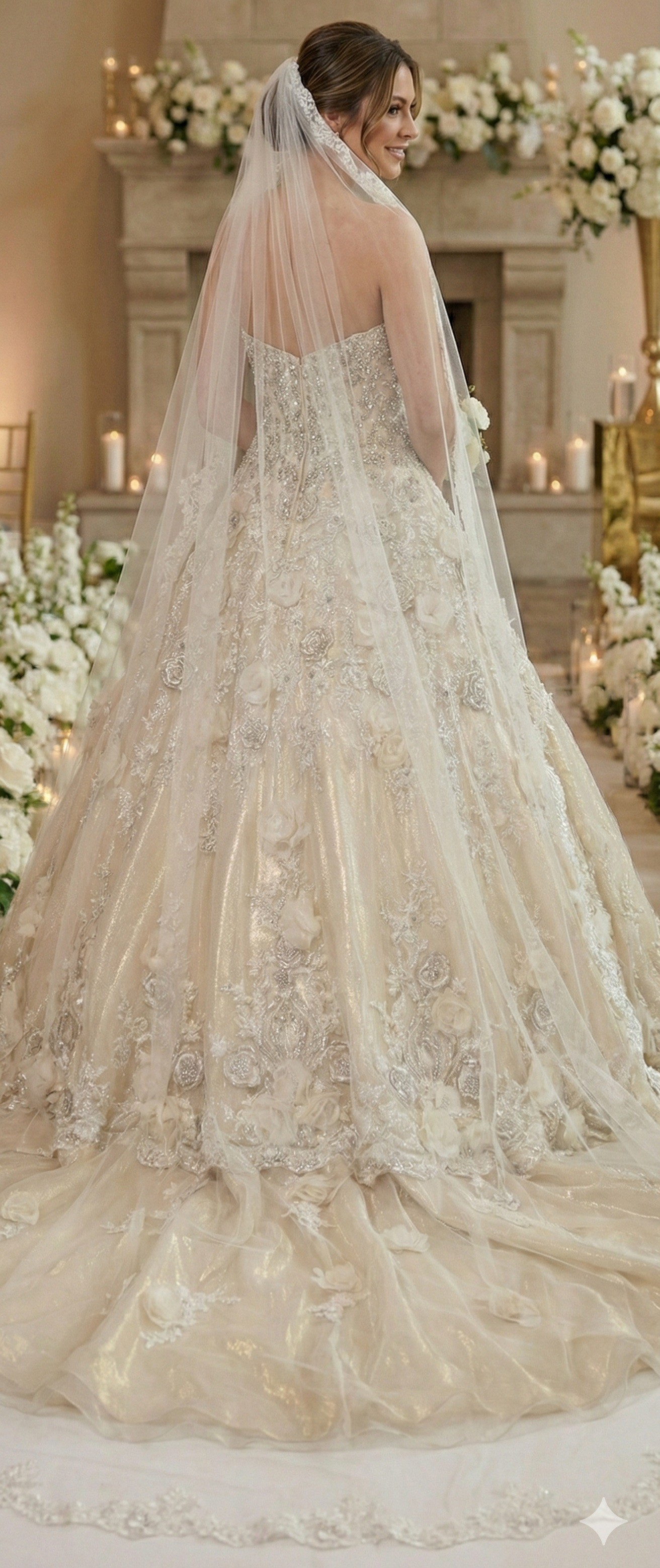 This is not your average ivory dress. This is a one-of-a-kind heirloom piece—a couture gown handcrafted with the precision of art and the soul of poetry. Every flower blooms with dimension. Every bead catches the light like a glinting teardrop. The gown glows softly with every movement, a perfect harmony of glamour, romance, and timeless drama.
