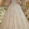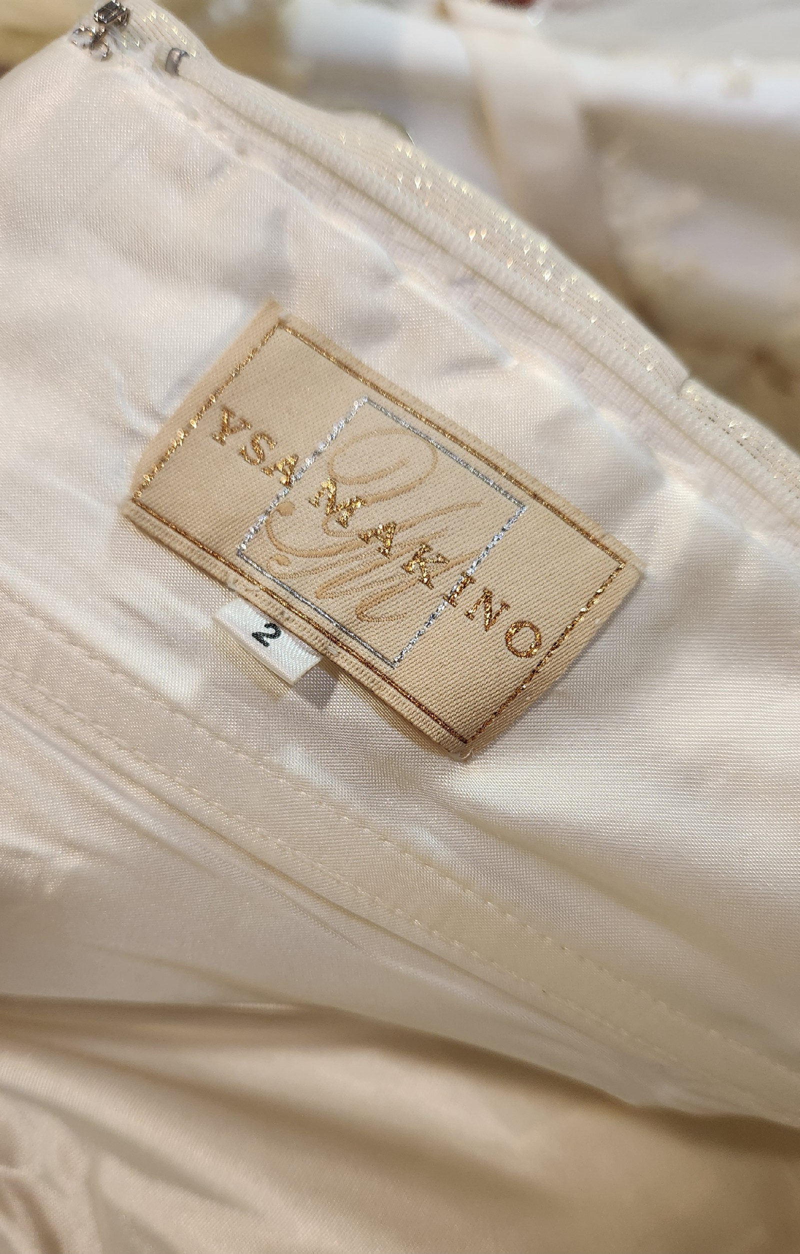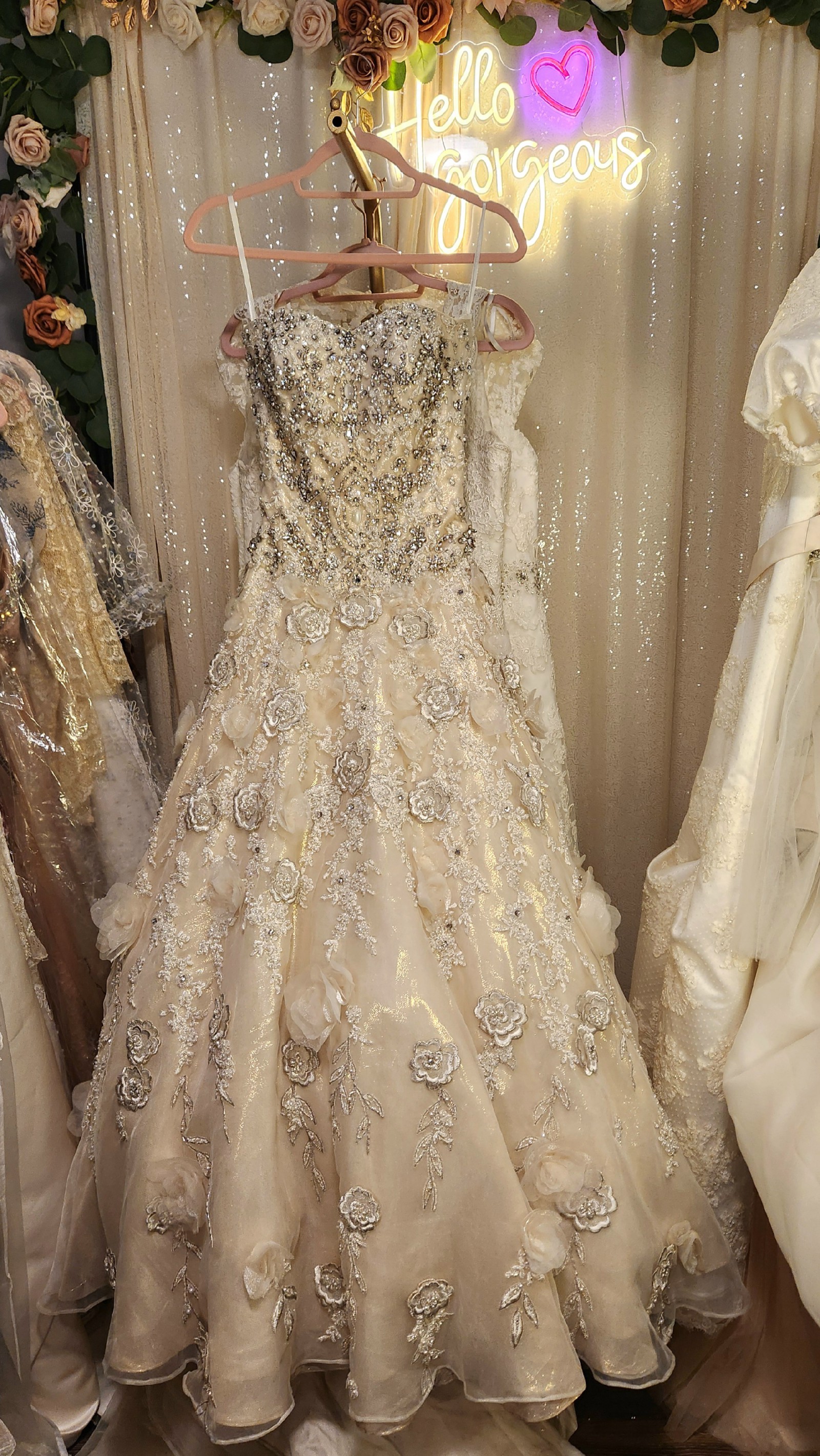A breathtaking fairytale woven in silk and shimmer—this Ysa Makino couture ball gown is a celestial vision of romance, refinement, and radiant opulence. Gilded in tones of soft champagne and light gold, this rare masterpiece is adorned with hand-sewn 3D floral appliqués, pearlescent beading, and crystal embroidery that cascades like stardust across every inch of the gown.