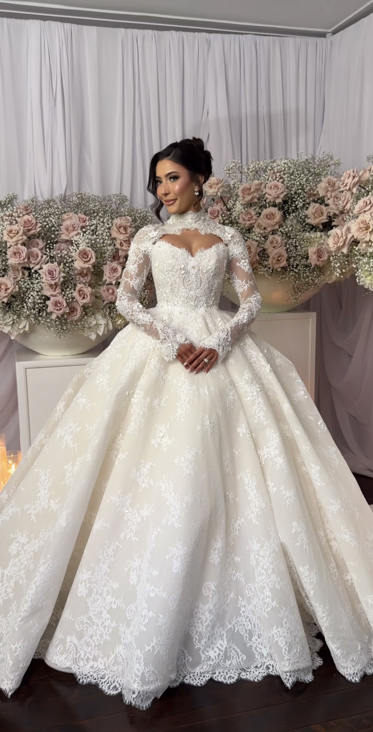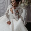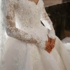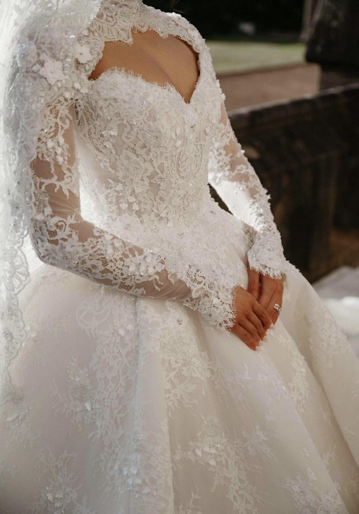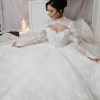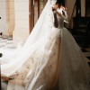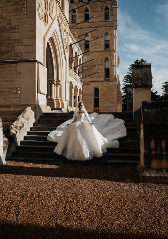 The long lace sleeves are delicately finished with scalloped edges, adding refined sophistication, while the 3-metre dramatic train creates a breathtaking moment from every angle.