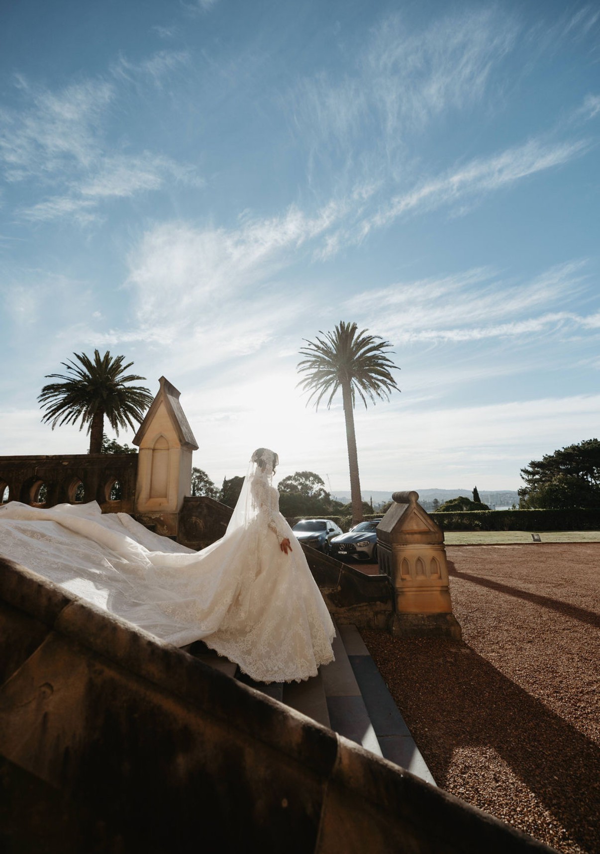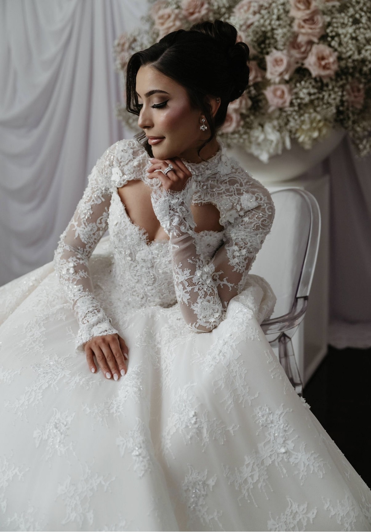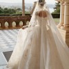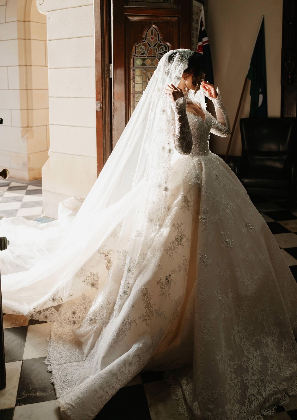 The long lace sleeves are delicately finished with scalloped edges, adding refined sophistication, while the 3-metre dramatic train creates a breathtaking moment from every angle.
