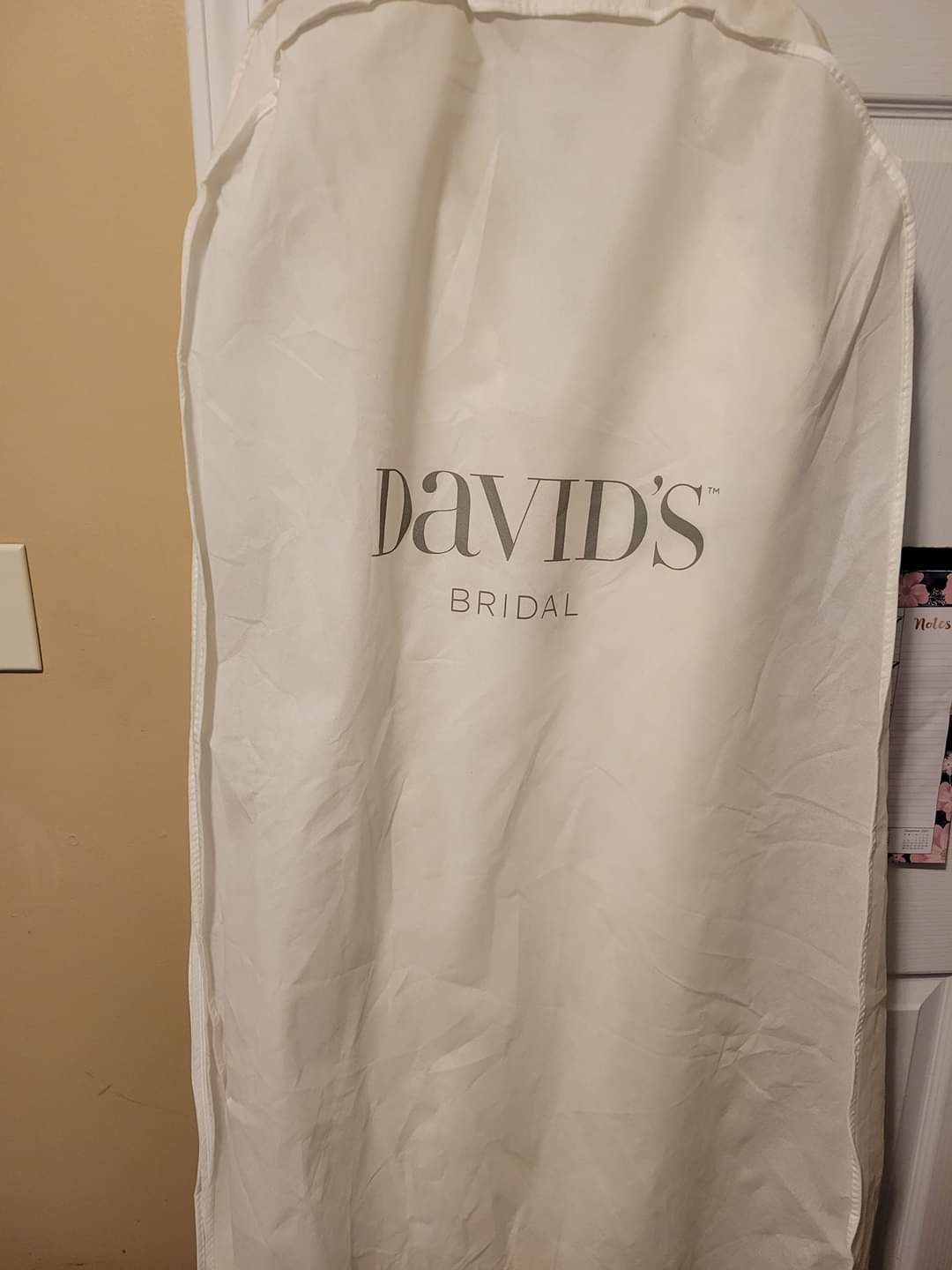 It is in its original David's Bridal bag and has never been worn, tried on, or altered. It has been stored in a closet in a smoke free and cat free home. There are dogs present but the dress is stored in a closet away from them. This style has been discontinued.