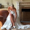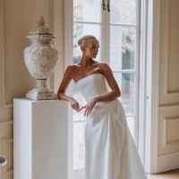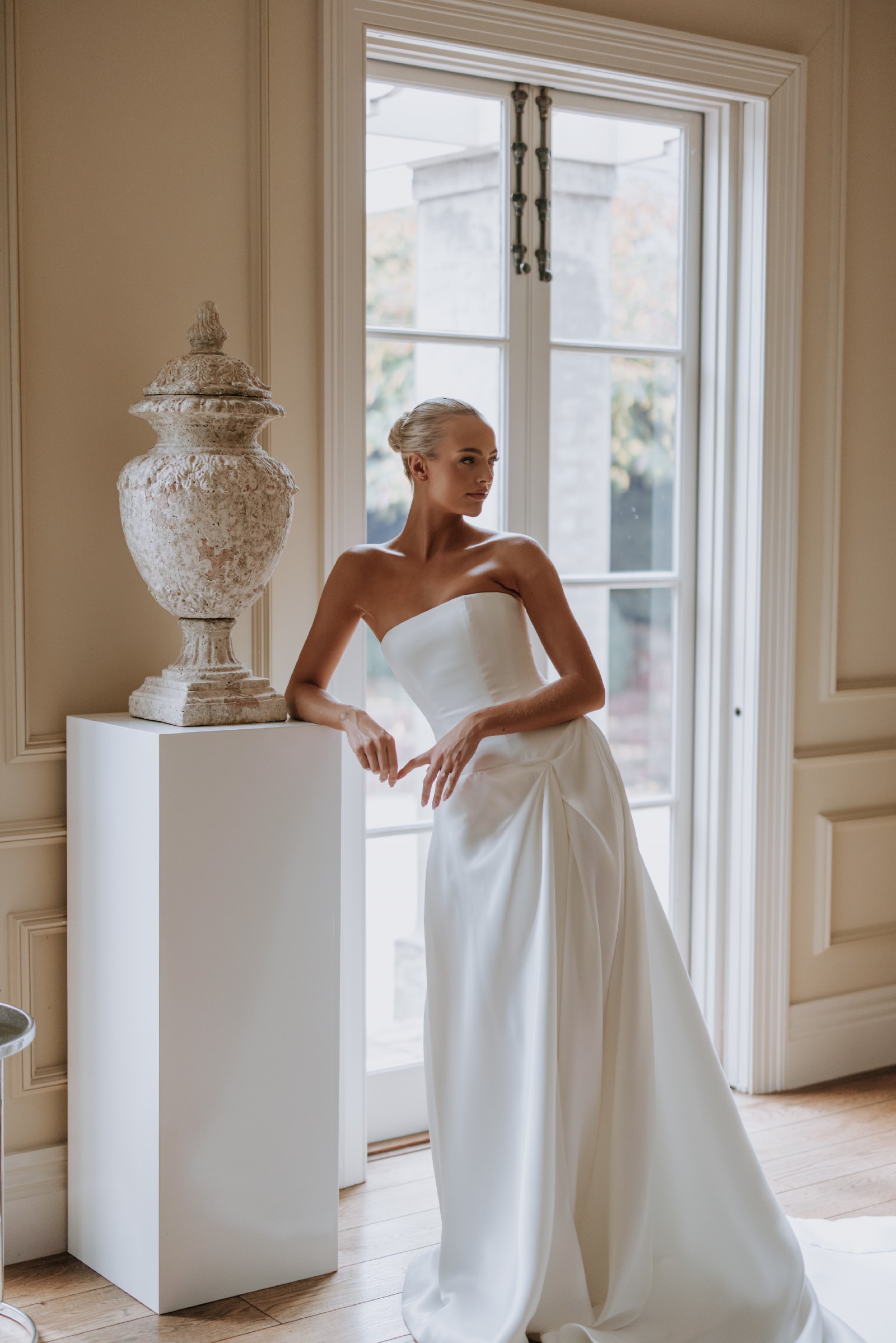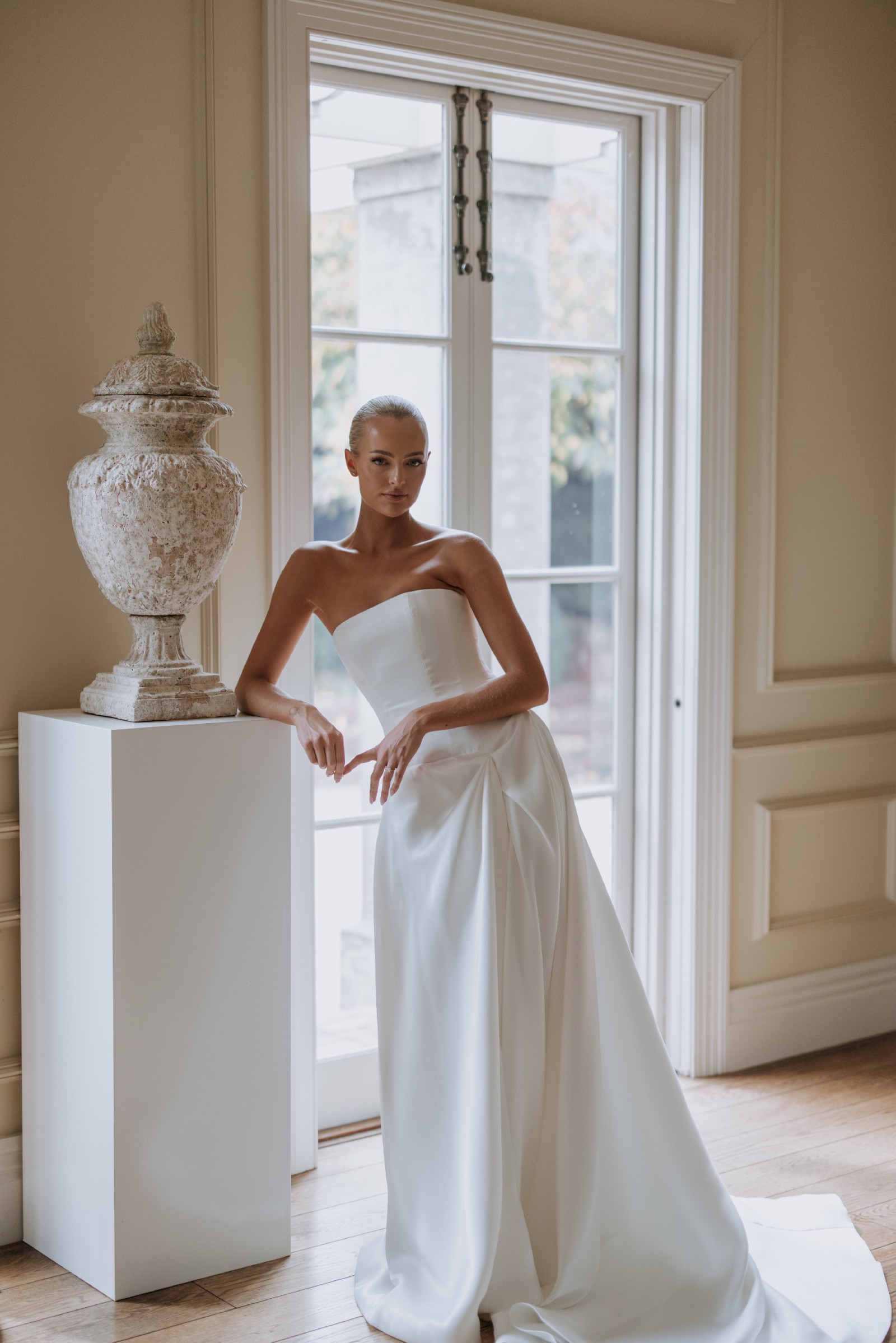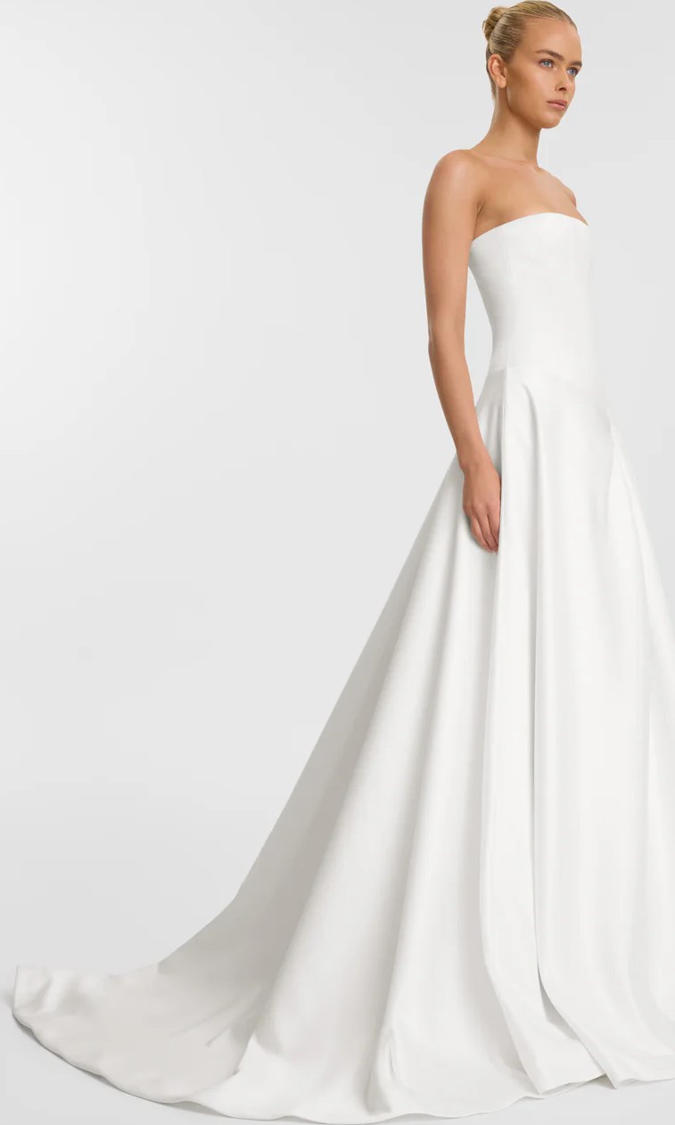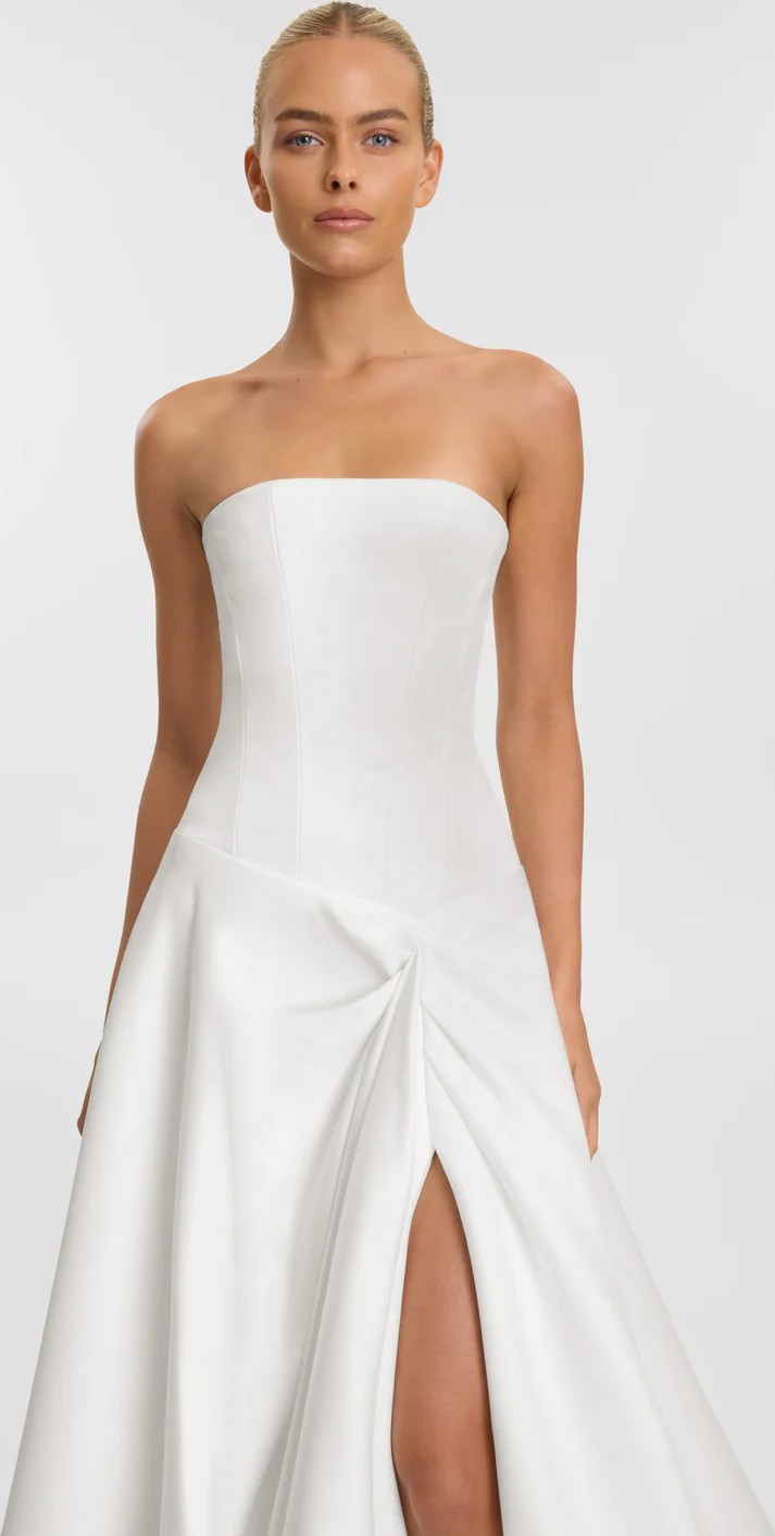 Meet Aspen, your sure-fire sartorial showstopper. Crafted from a luxe and luminous duchess satin, Aspen brings a Y2K refresh to a ballgown aesthetic. A straight neckline, dropped waist bodice sculpts the figure, whilst a soft A-line skirt sits effortlessly at the low waist. Finished with a drape detail at the asymmetric dipped waist, Aspen skirt has a beautiful split.