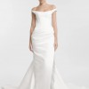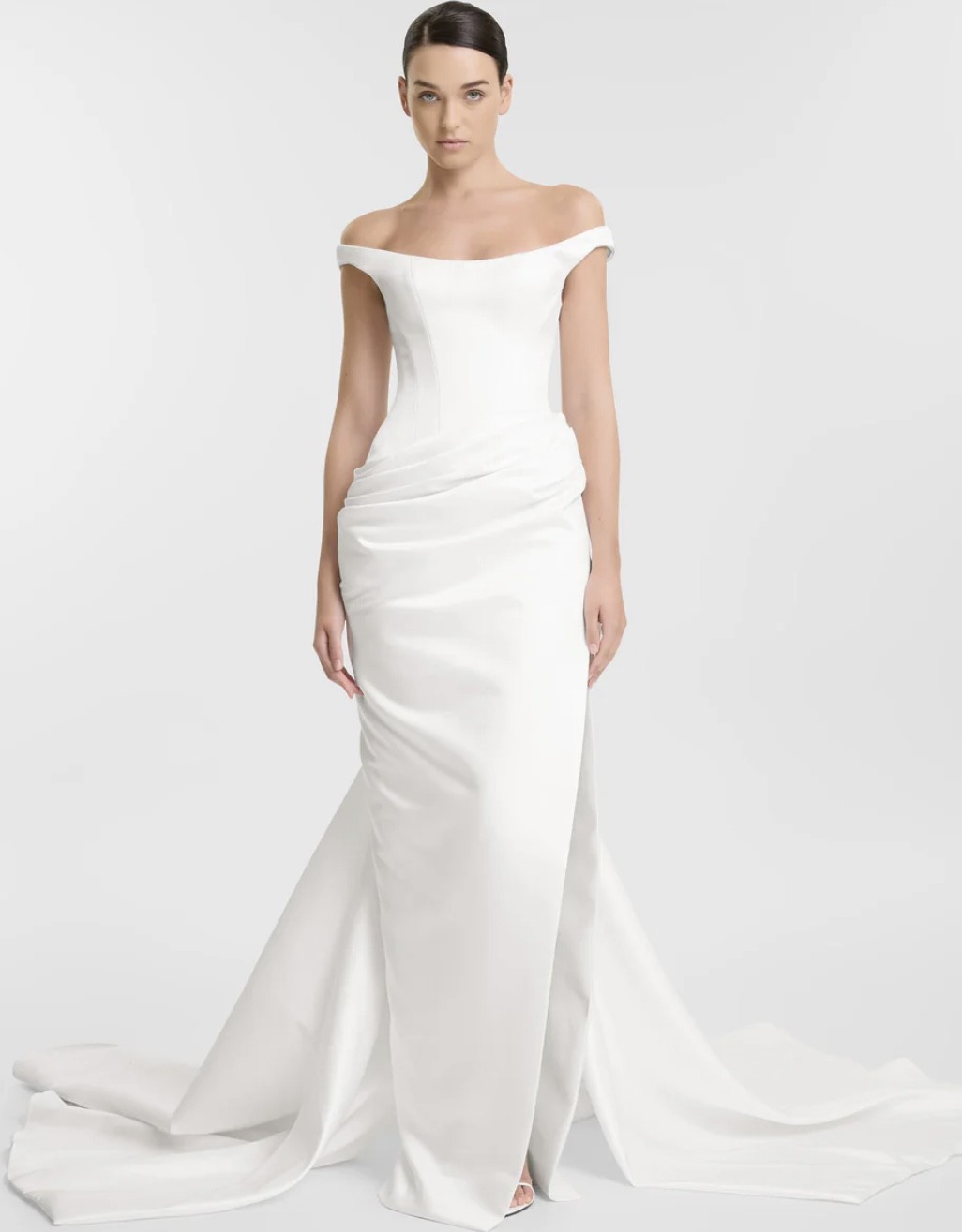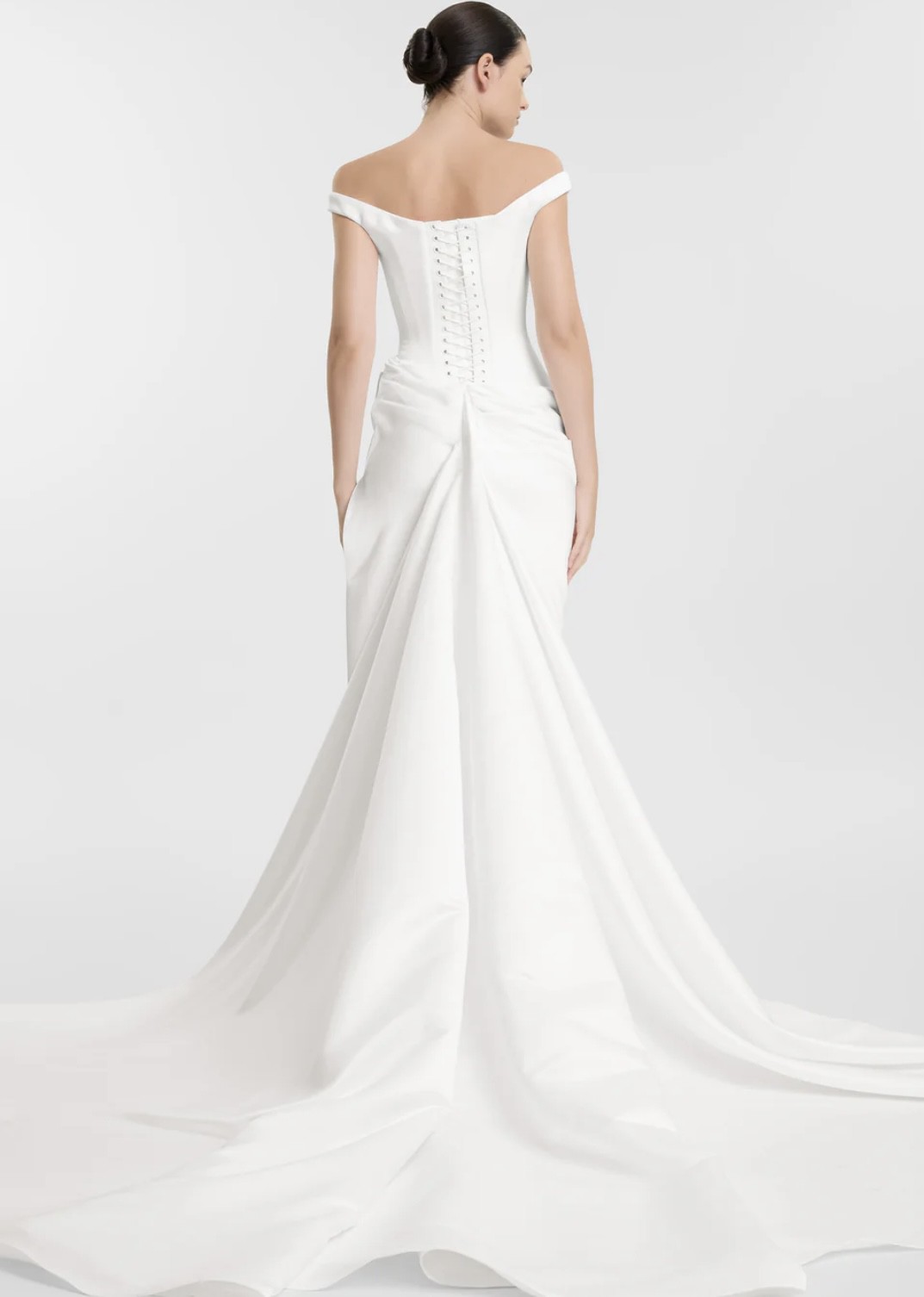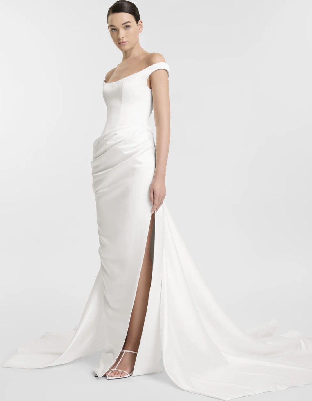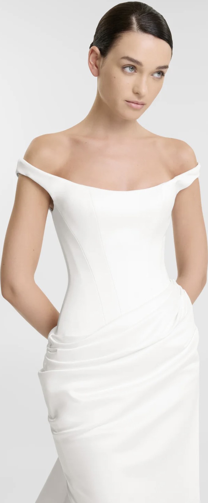 Old money aesthetic comes to life c/o Winton. A sculptural masterpiece that accentuates the curves and movement of the body, Winton features a smooth, structured bodice with off-shoulder straps. Its asymmetric skirt drapes effortlessly from the left waist and features a side split, the ultimate celebration of the female form. Crafted from a luminous duchess satin, Winton is your sartorial showstopper destined for cult-icon status.