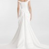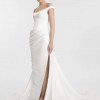 Fit: Asymmetric drop waist ballgown, featuring a draped detail on skirt, split on left side and long godet train. Structured off shoulder bodice with scoop neckline.
