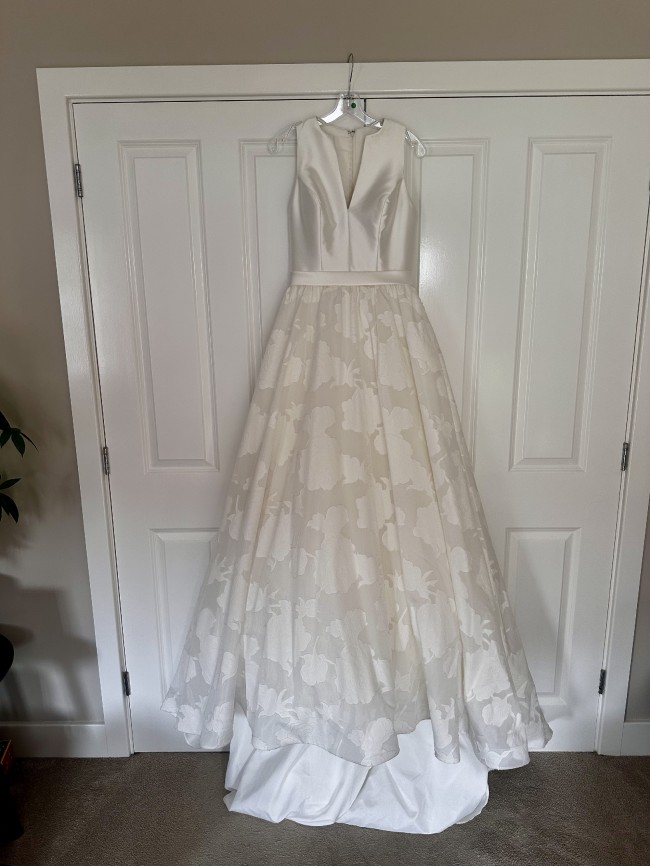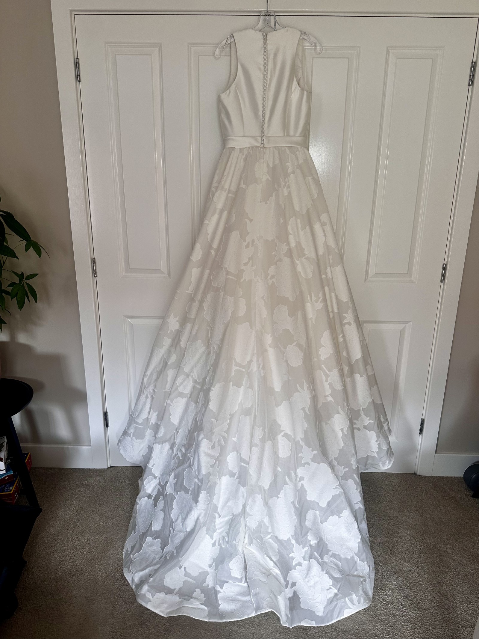 The gown is crafted in Organza Jacquard, giving it beautiful texture and movement while maintaining a structured, elegant shape.