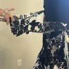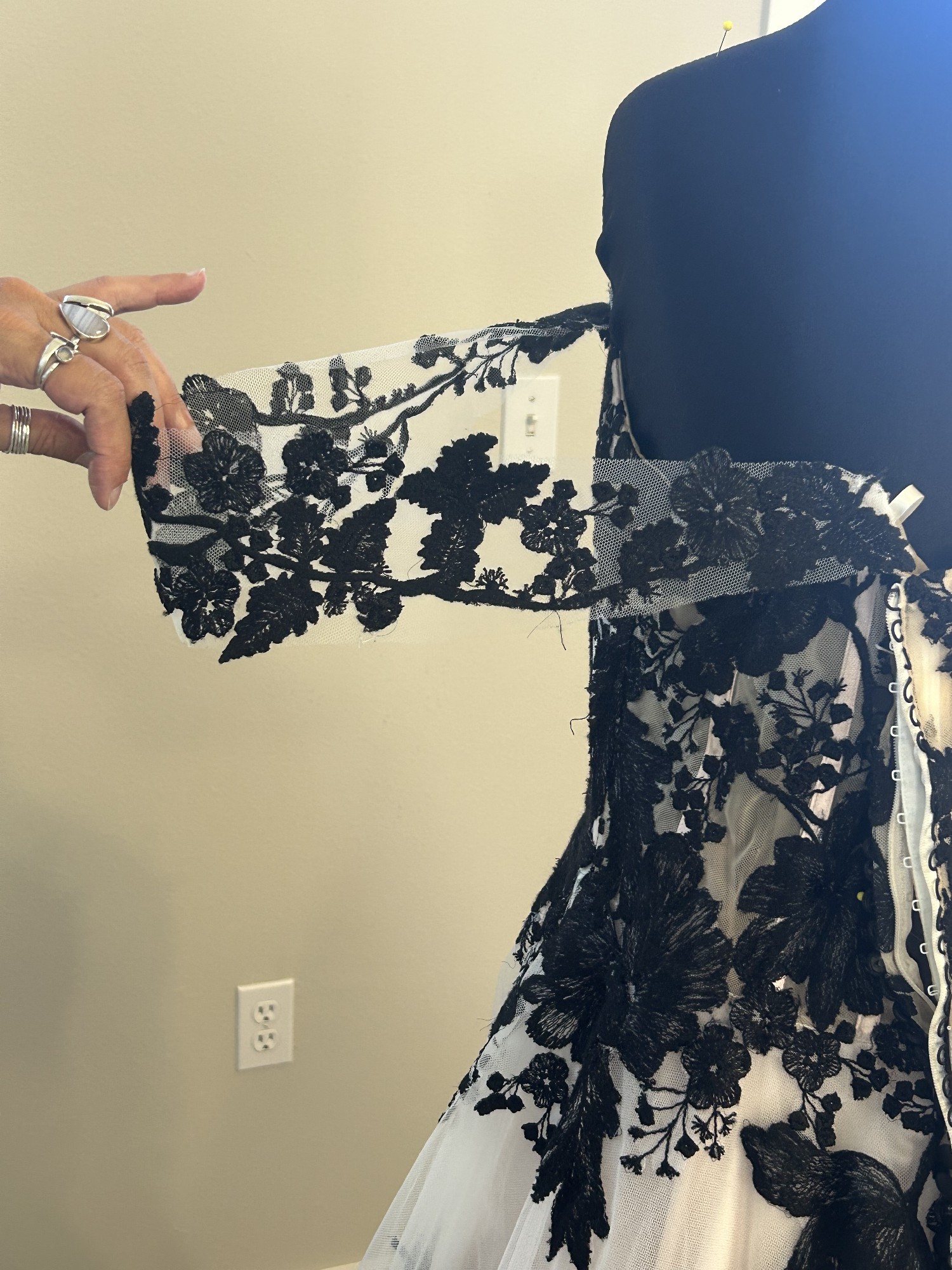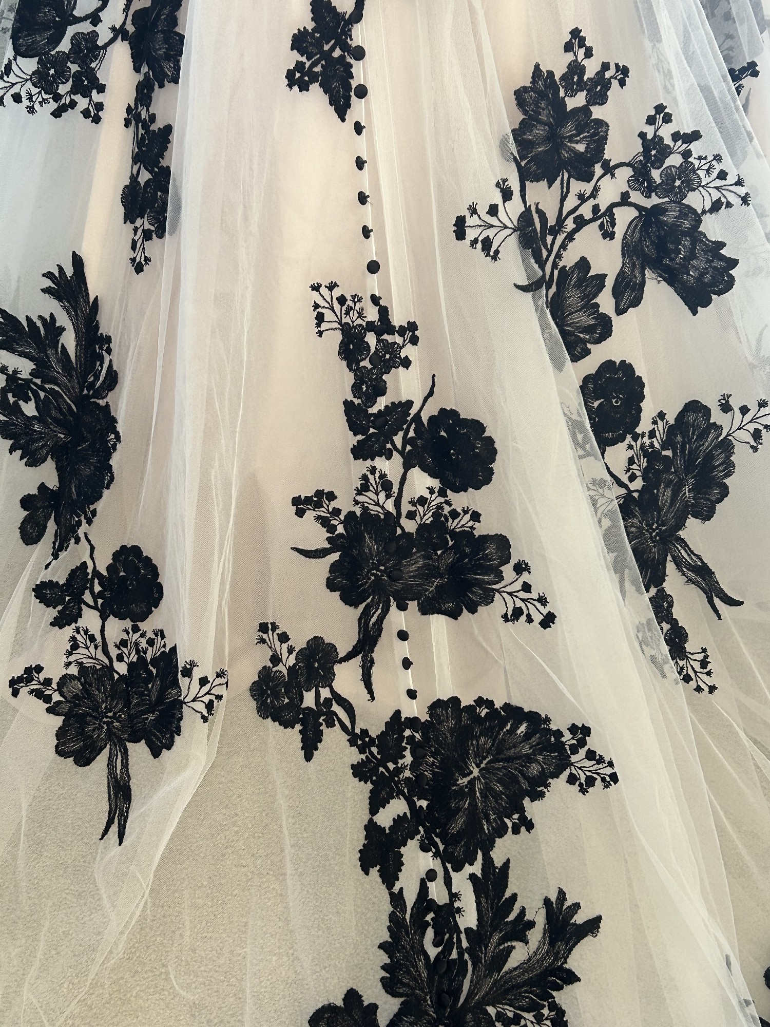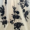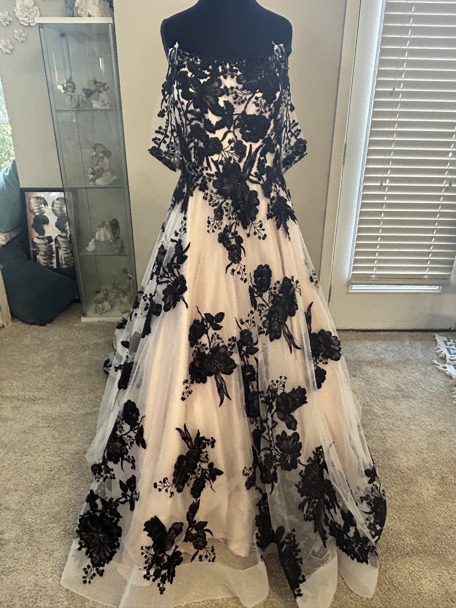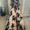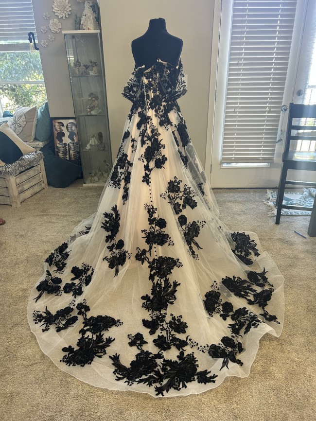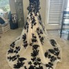Beautiful gown, ivory mesh with black lace over nude lining has detachable, drape, cap sleeves, beautiful black sat, and covered buttons all the way down the back of train the dress was a store sample. It’s in excellent condition no visible stains or tears