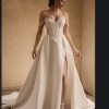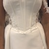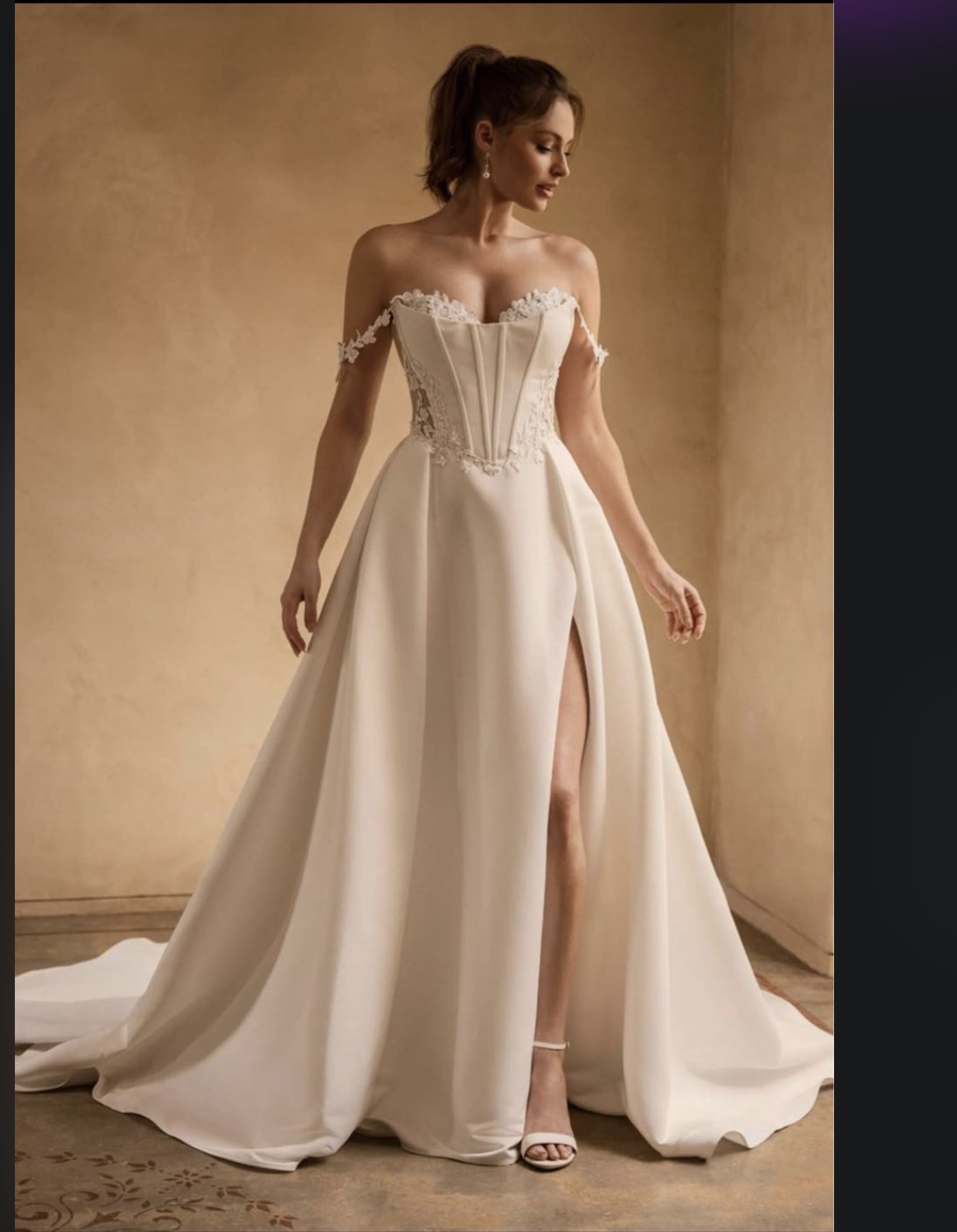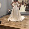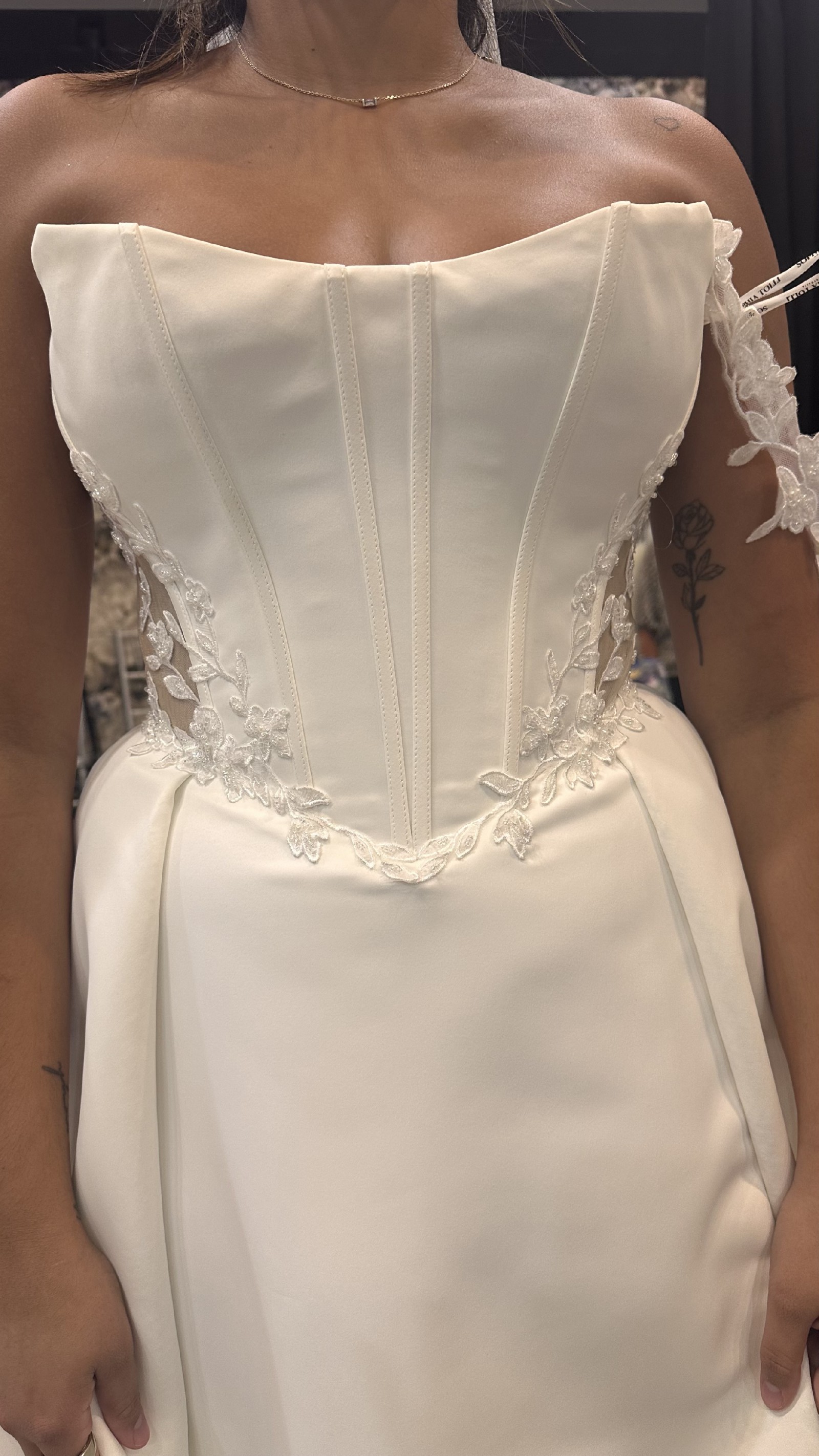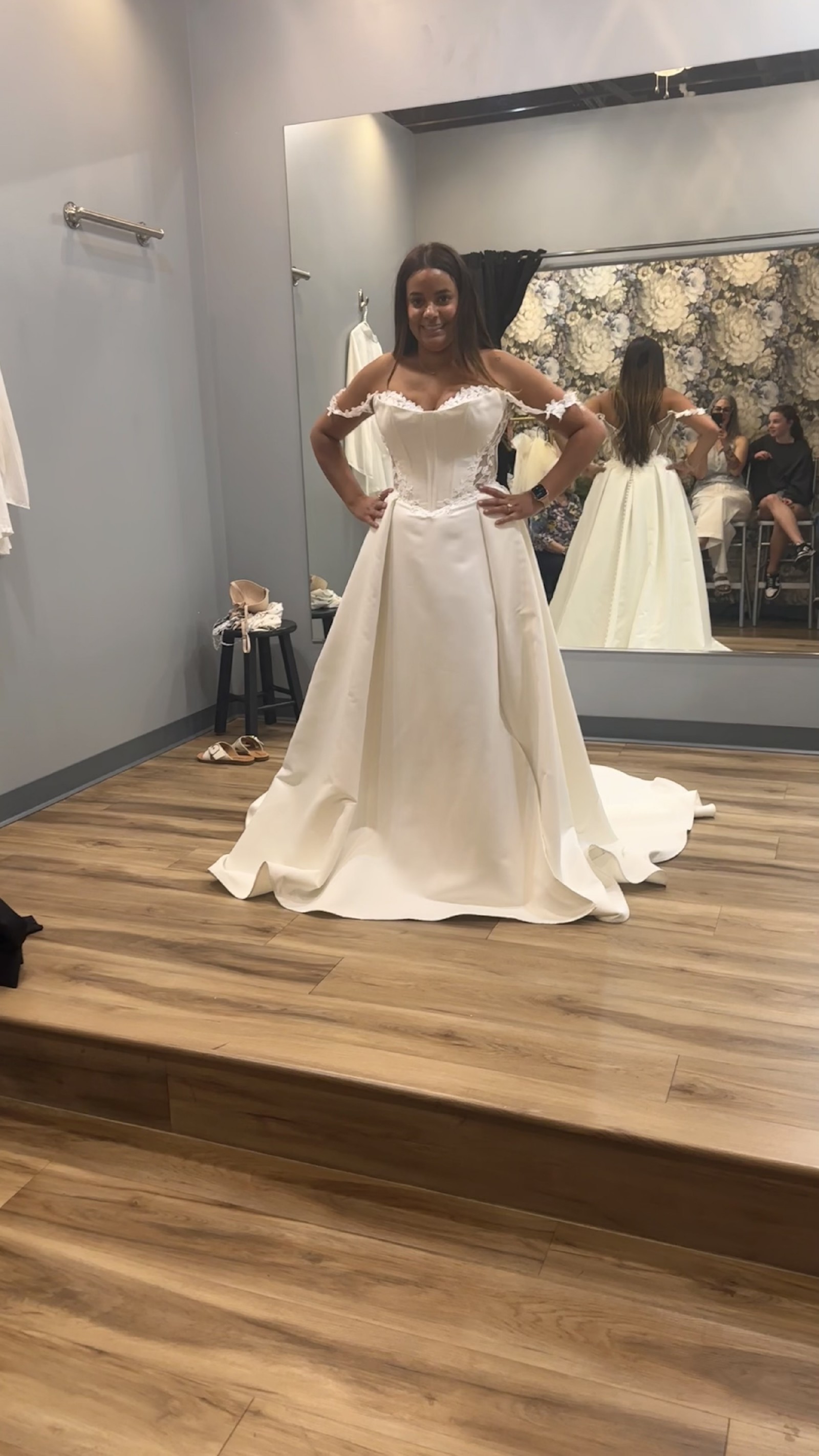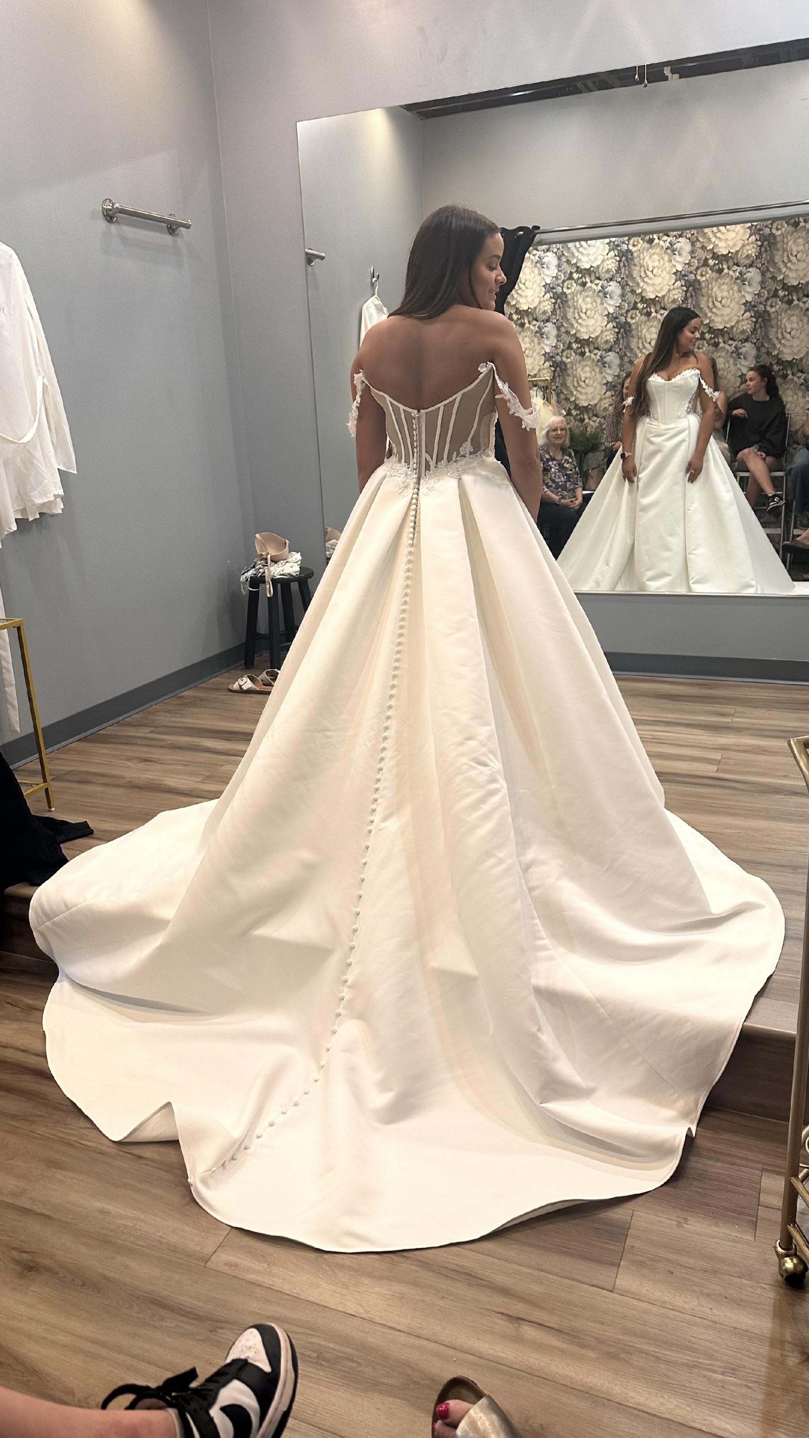 This dress is gorgeous! It’s satin with pretty appliqués on the bodice and comes with removable lace sleeves, so you can wear it two different ways. It also has great boning in the chest that gives you a really flattering shape, plus a basque waist and even pockets (so handy on your wedding day!). It was originally a floor sample but has never been worn for a wedding or altered. I’m usually a street size 6–8 (S/M), and this is size 10 fits me like a glove. I am 145lb for reference. In one of the pictures, the lace on the top looks tucked in — I had thought about removing it, but it’s still there and intact. I ended up eloping, so I never got to wear it, but it really is a dream dress and deserves a bride who’ll love it! Happy to send more pictures or videos if you’d like!