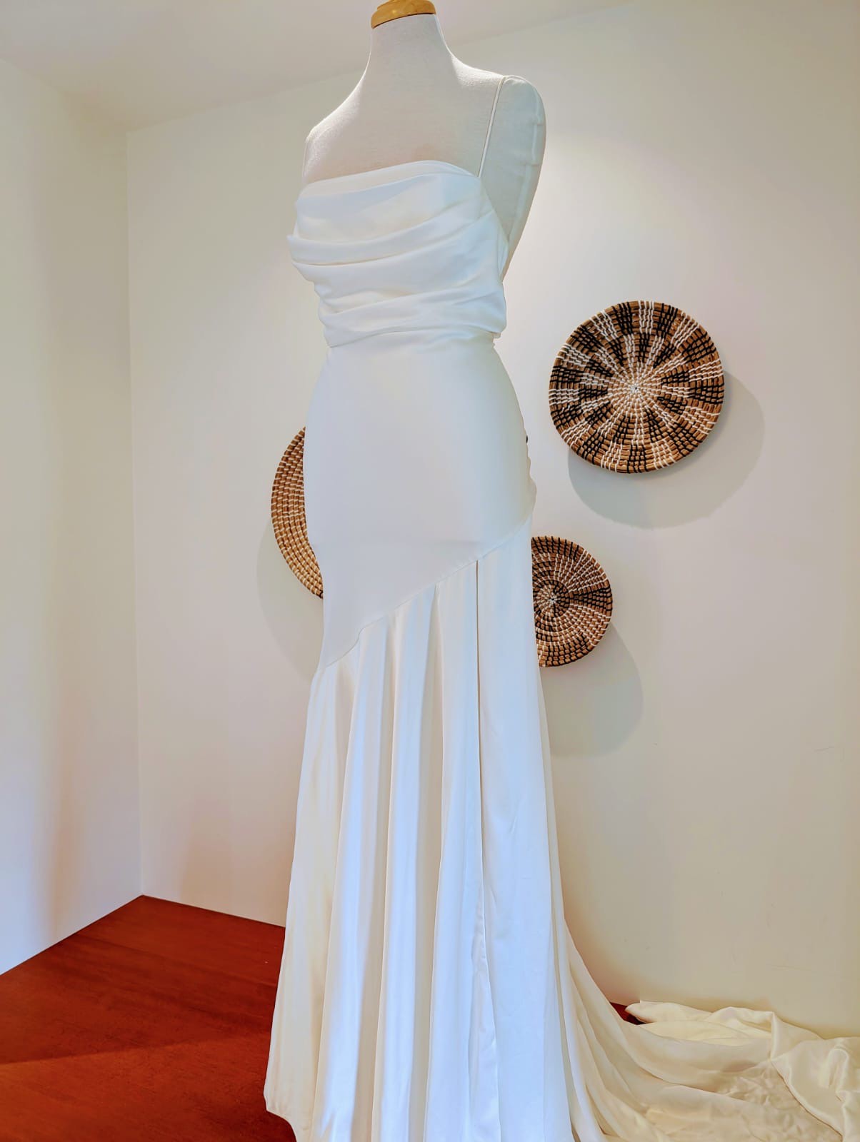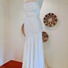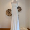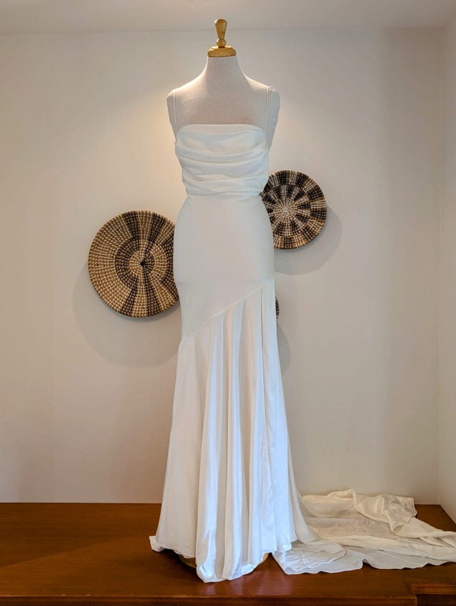 Valentina has an ivory pearlescent satin material with a front leg split. It has a