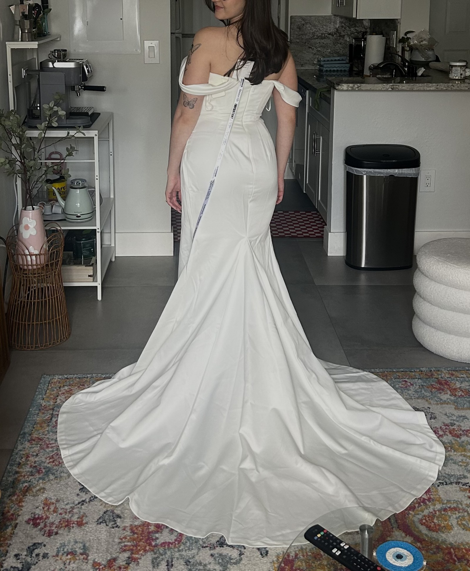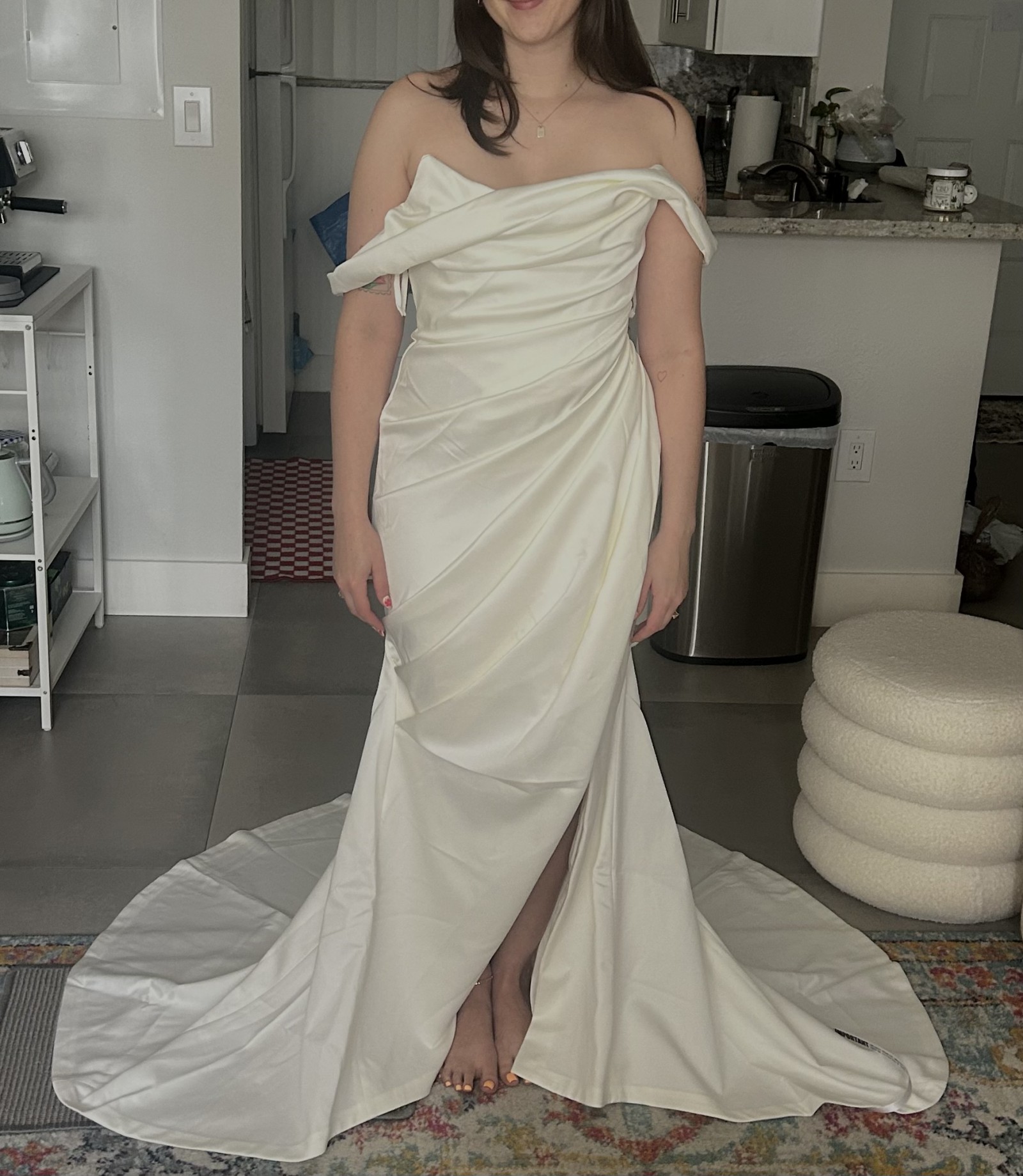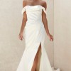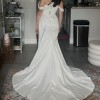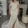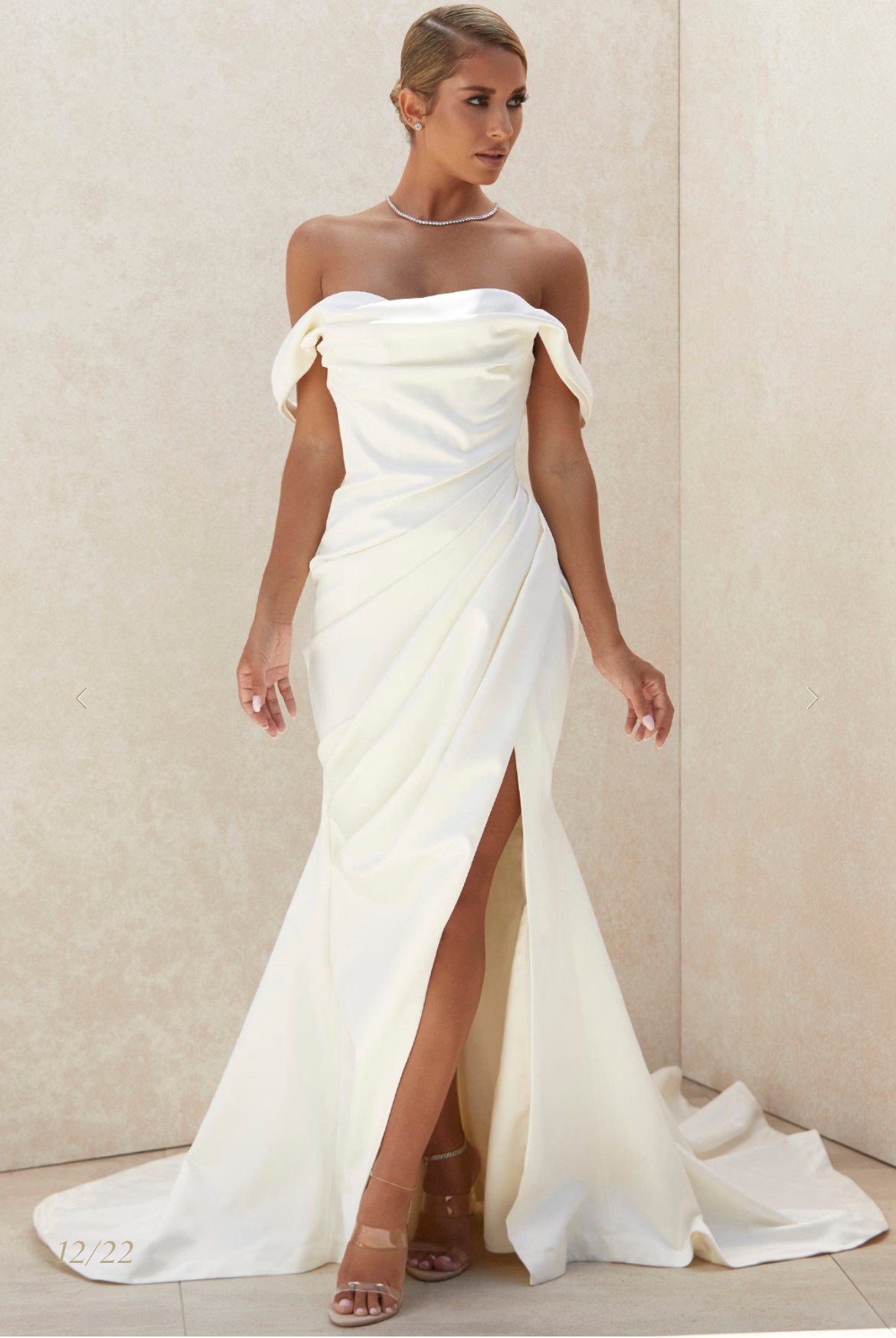 The most spectacular gown in our Debut collection, 'Delphine' is expertly crafted from our lustrous weighty Duchesse satin. It features incredible corsetry and draping to give second-to-none cinching and lift. The draped satin extends languidly from the bust around the shoulders to form sexy sleeves that can sit off shoulder or on or do like our designer intended with just one sitting sexily off shoulder. The clever draping extends down through the bodice and creates the most perfect hourglass silhouette. The leg baring front slit is super sexy as you walk down the aisle and Delphine finishes in a long langorous sweeping train for extra drama. Wear yours with the prettiest shoes to highlight your legs in this thigh slit style.