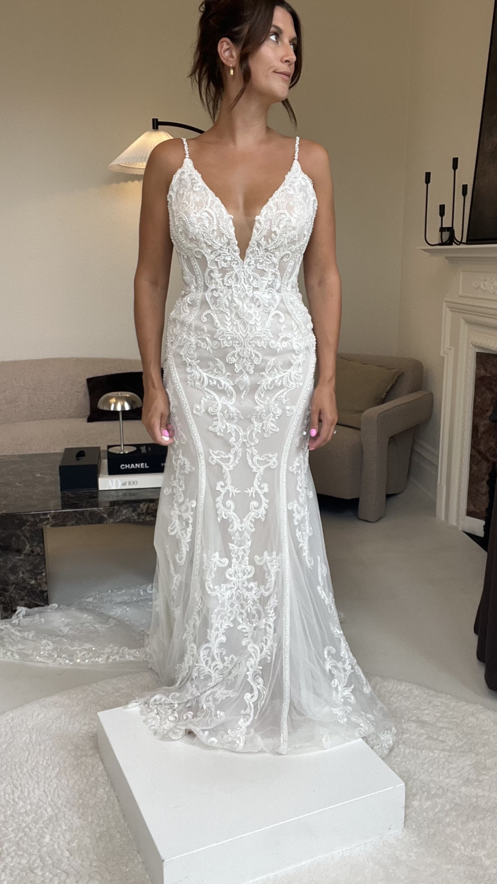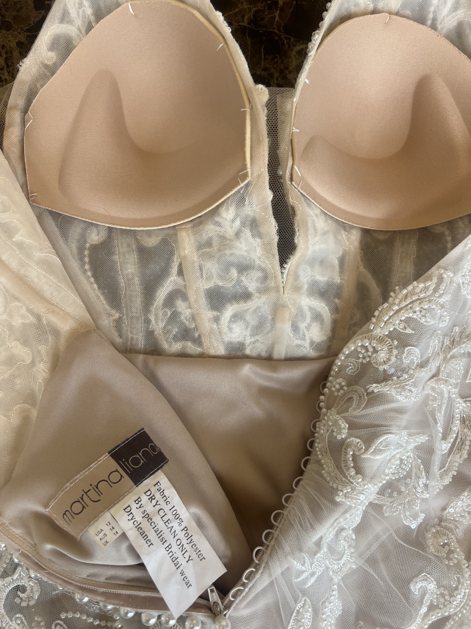 Martine Liana 1713 ivory lace blush lining beaded dress. In perfect condition no marks or wear. This is and unaltered sample from our bridal studio Belle Lueur Bridal based in The Lake District. All dresses are dry cleaned before sending.