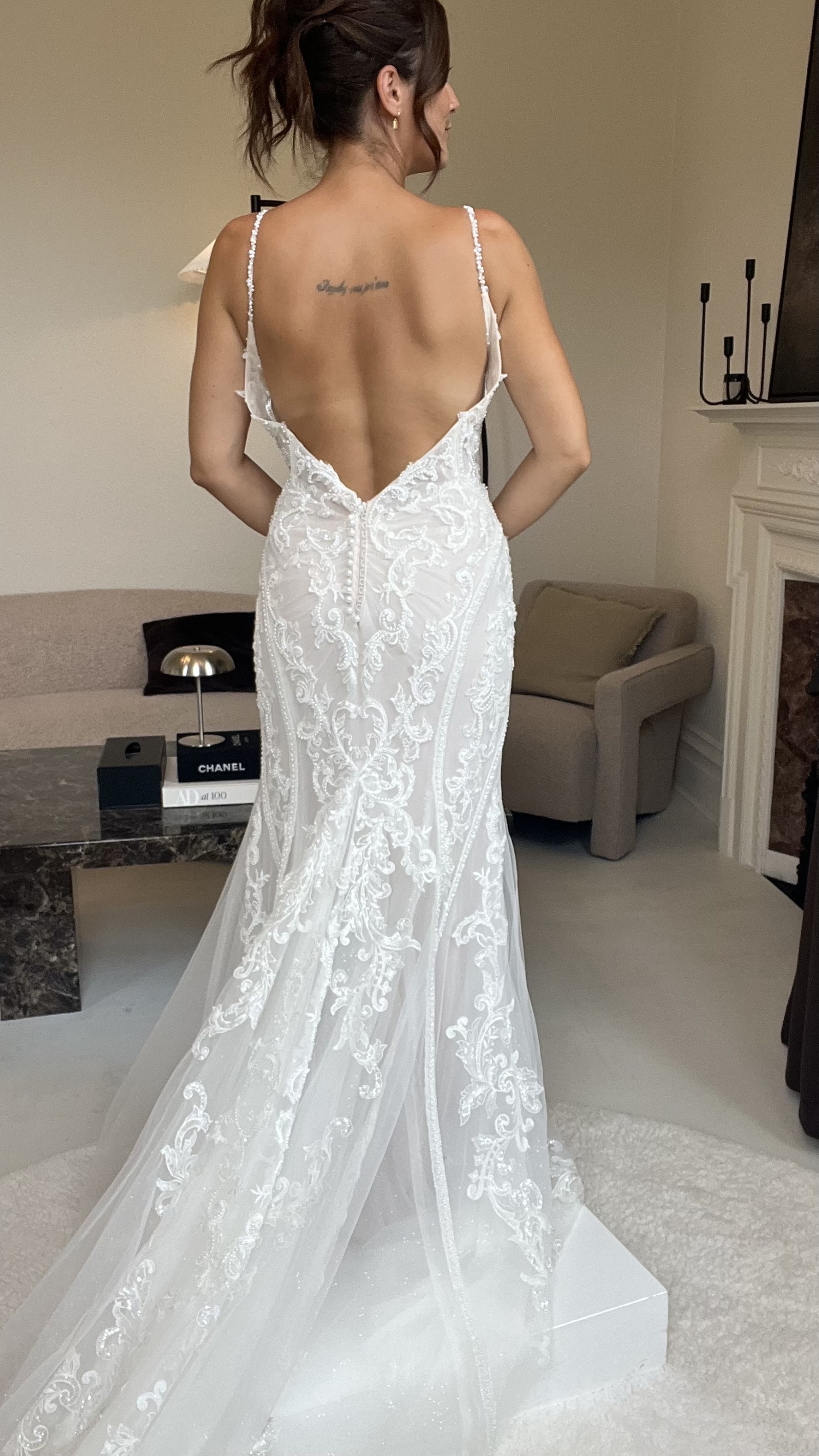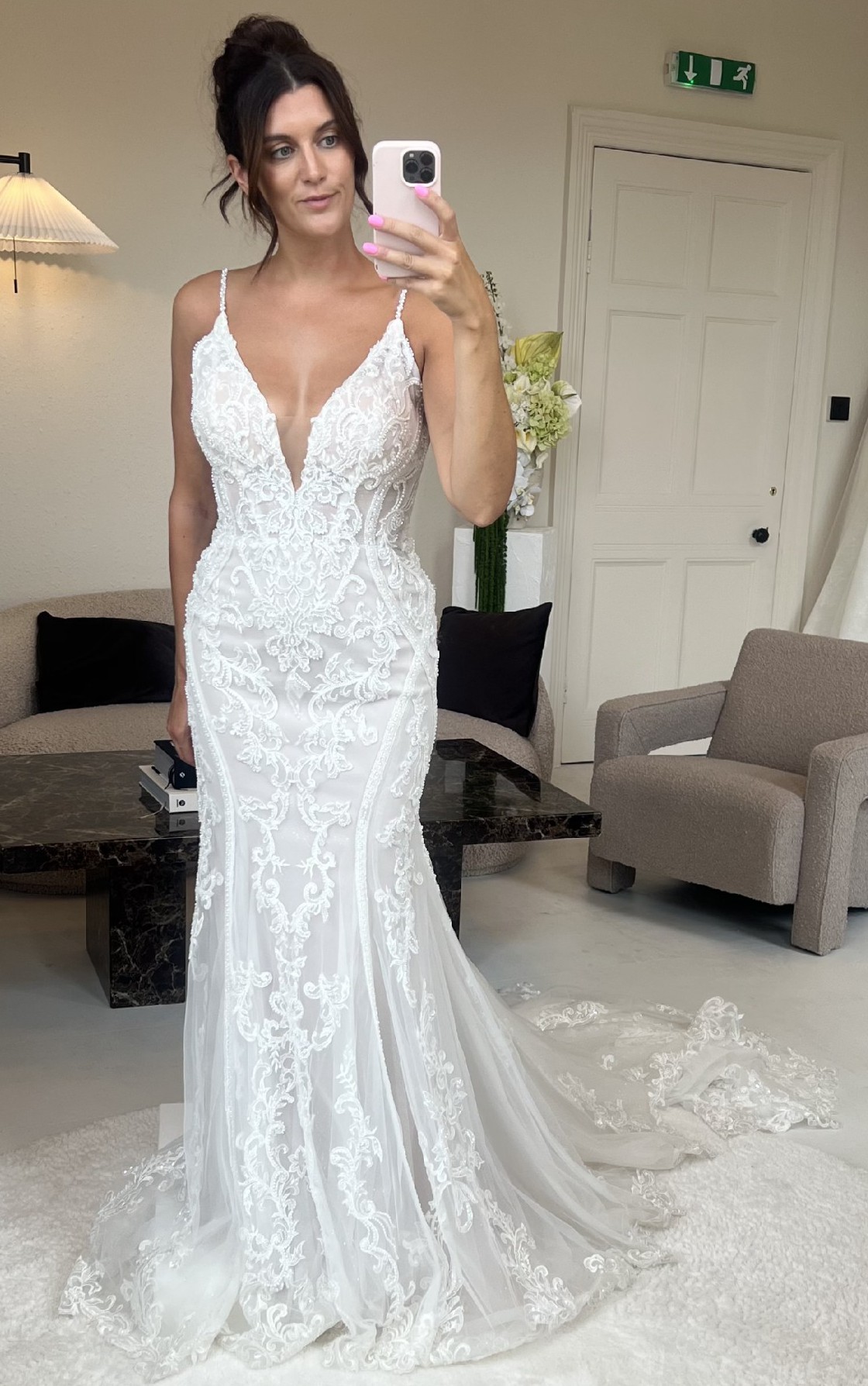 This can be taken in by two dress sizes all over - we work in cm's and not inches. We also have and in house seamstress so can advise on any alterations you plan to make first hand. Please provide accurate measurements as all dresses are non refundable. As the new season approaches we are making space for new dresses. If you have any questions at all please contact the bridal studio direct or send us a message.