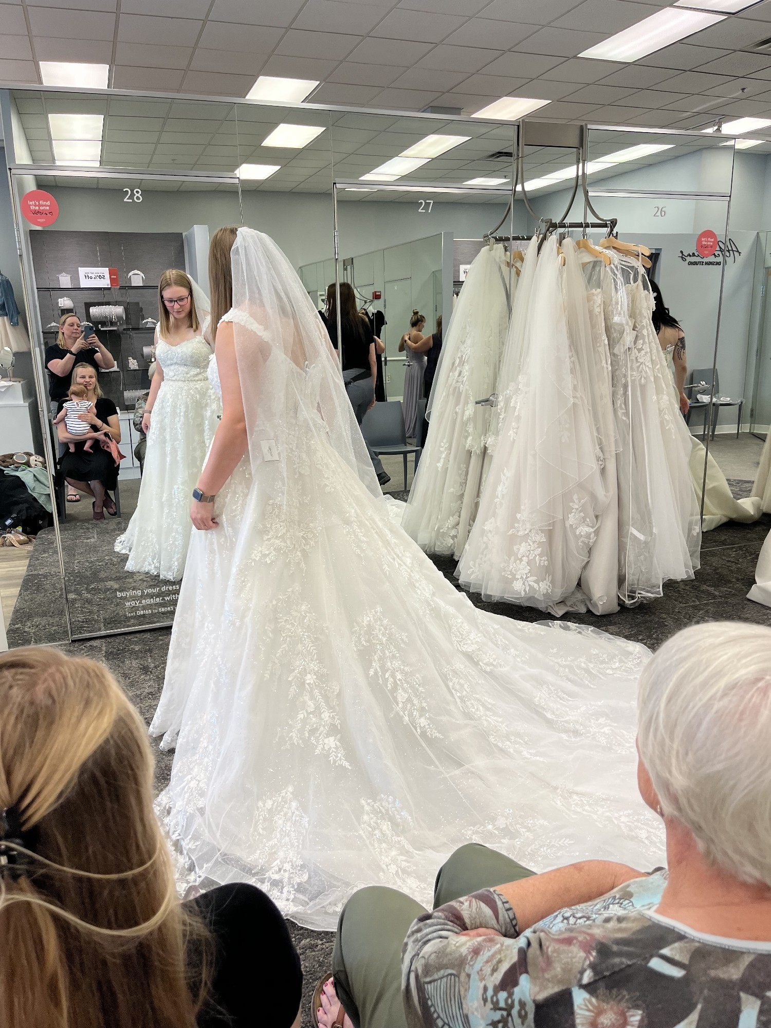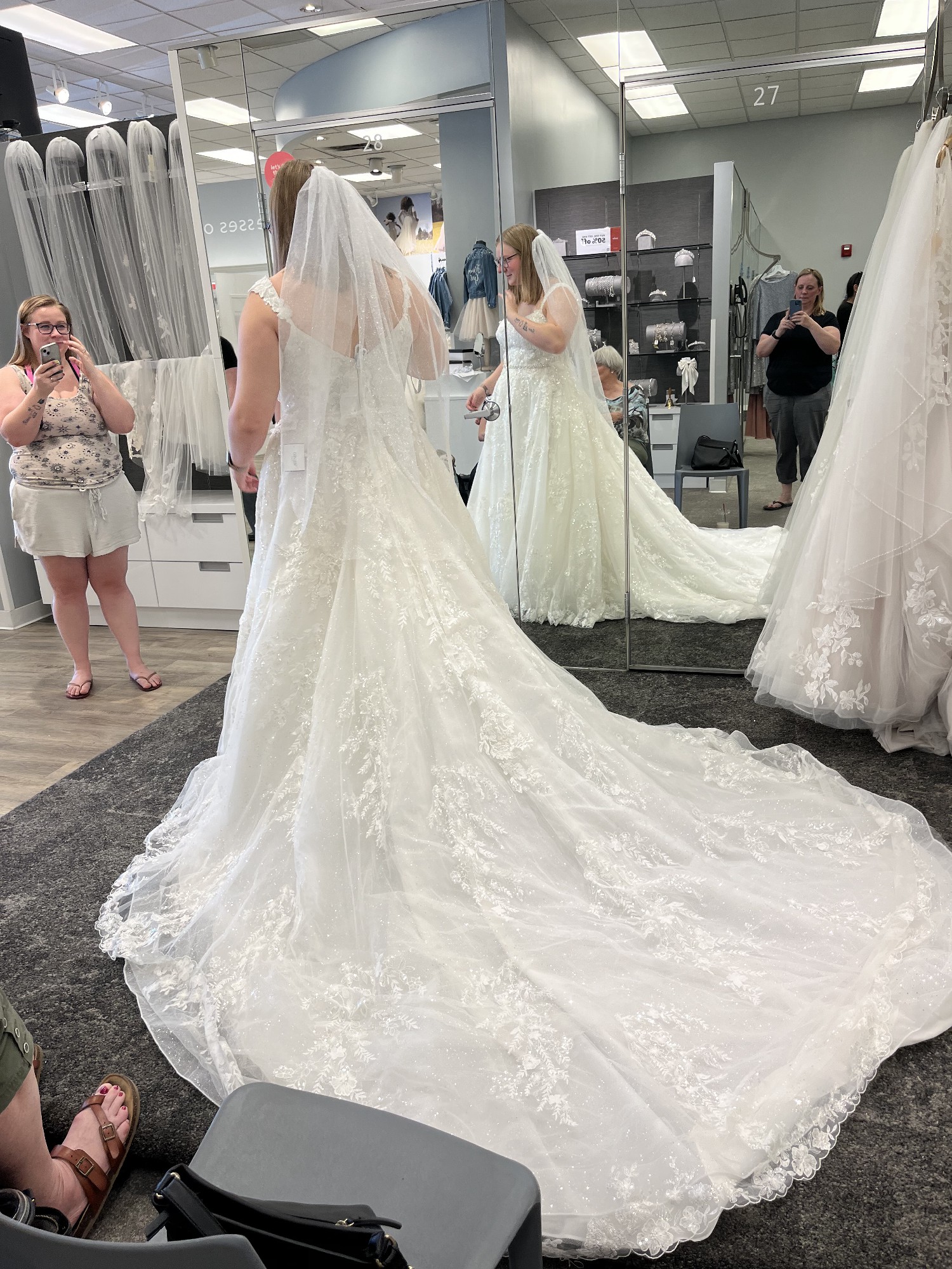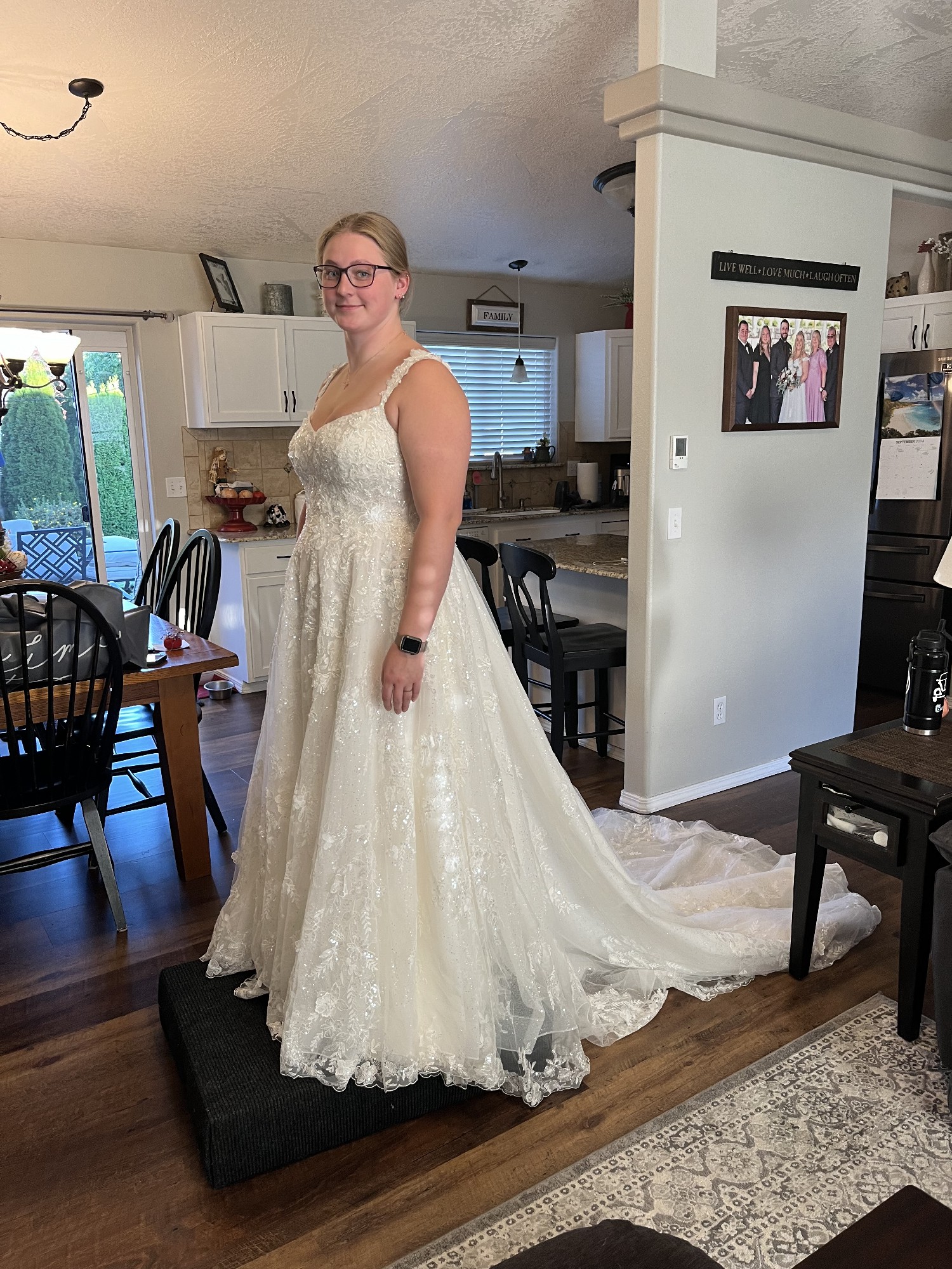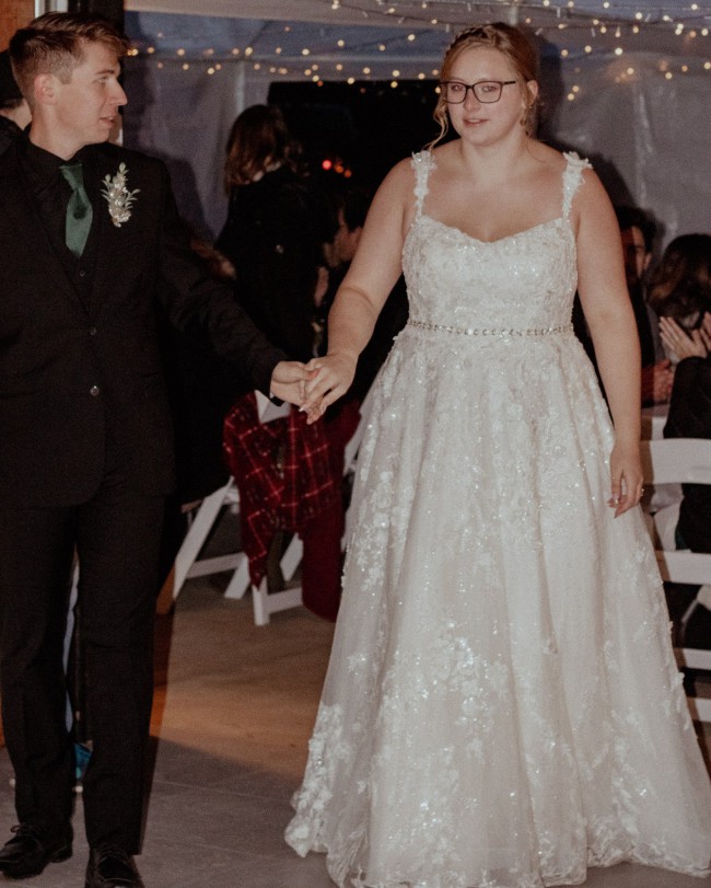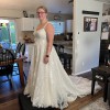 Completely unaltered dress like brand new! Worn once for the wedding, it has been professionally dry cleaned on 8/25. Size 12, again, completely unaltered. Long, beautiful and glittery. Surprisingly comfortable! You will look beautiful in this dress. Send me an offer.