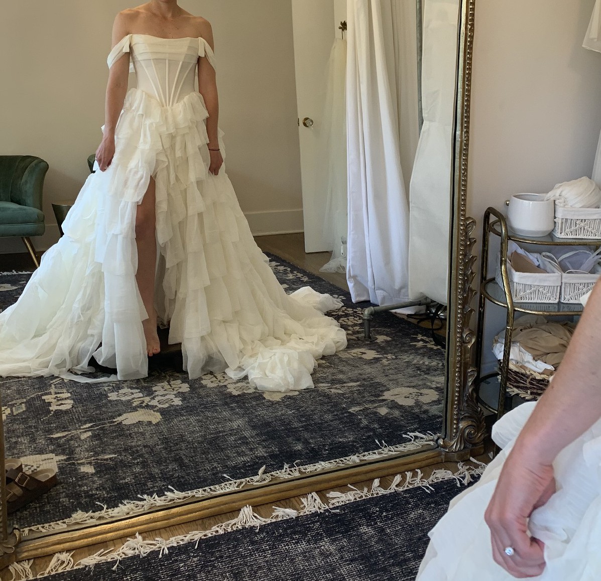 From Rue De Seine website: The Jacqueline Gown features a dramatic tiered skirt, nodding to 19th-century fashion reinvented for the modern romantic. Available in Off-White as well as blooming Blue Rose. Complemented by exposed boning and an over-the-bust drape, Jacqueline embodies the perfect combination of reimagined history with playful romance. A dramatic high slit in the skirt balances its adventurous volume while offering an opportunity for a bold shoe statement.