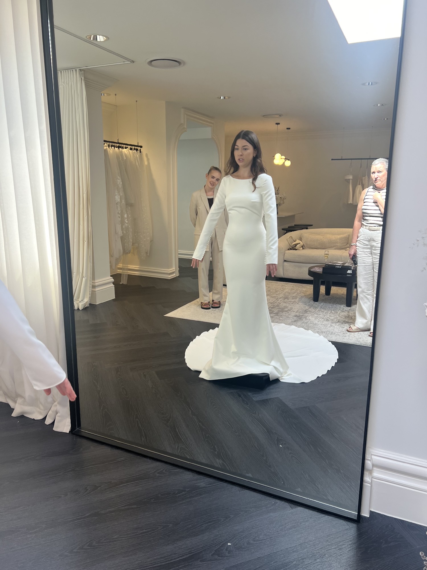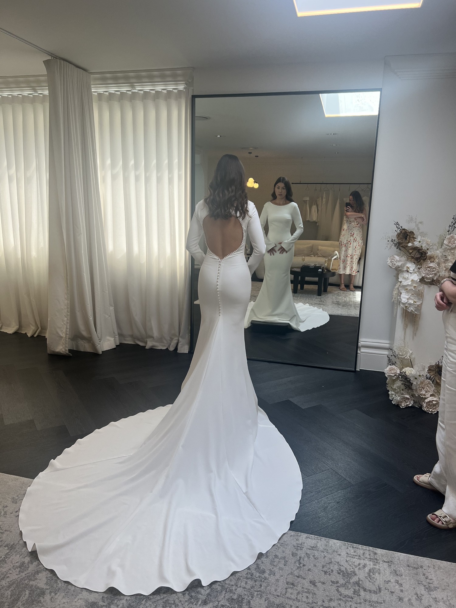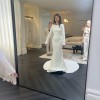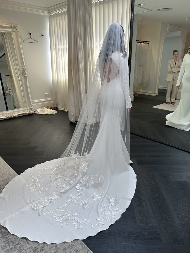 Vivienne is the definition of sophistication, combining MWL's iconic, supportive French Crepe with the most gorgeous pearl accents.This beauty has a boat neck, which, paired with a pearl-lined key-hole back presents a pure picture of bridal elegance and timelessness. Vivienne also features delicate pearl buttons on the back and sleeves, adding the perfect understated touch of charm and beauty.