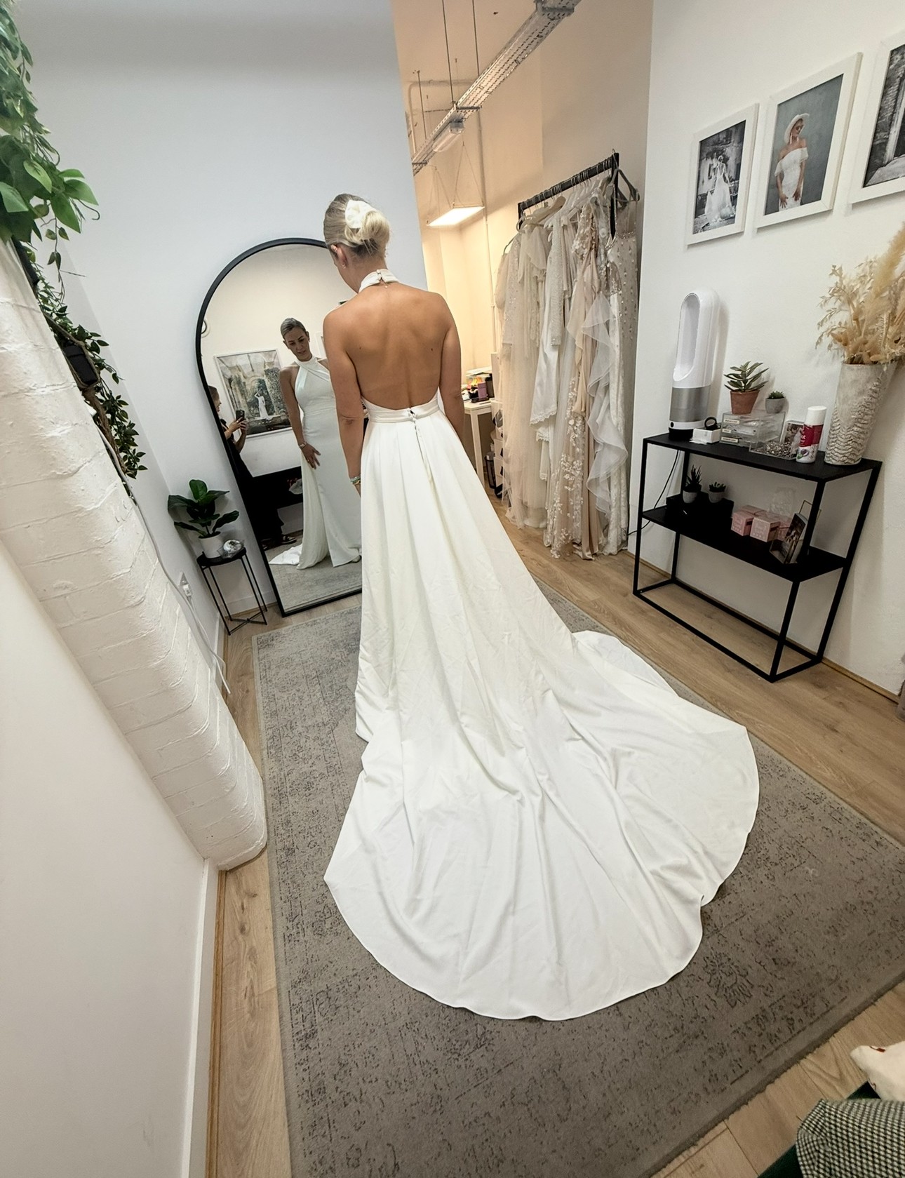 SEE BELOW FOR SIZING - split size dress 6/8/10 This Australian MWL Grayson dress and Overskirt was an absolute dream to wear ! It gives such a stunning silhouette and with the skirt gives you two dresses in one - I took the overskirt off after the ceremony and got so many compliments on the whole outfit. I’d also consider separating the dress and overskirt and selling separately. Msg me! Beautiful button detail down the back of the dress as pictured. Is currently being dry cleaned by a MWL approved laundry and is in perfect condition. My measurements: Hips 39” Waist 29” Bust 34-35’ cm and I wore a small heel (2 inches) and it grazed the floor perfectly