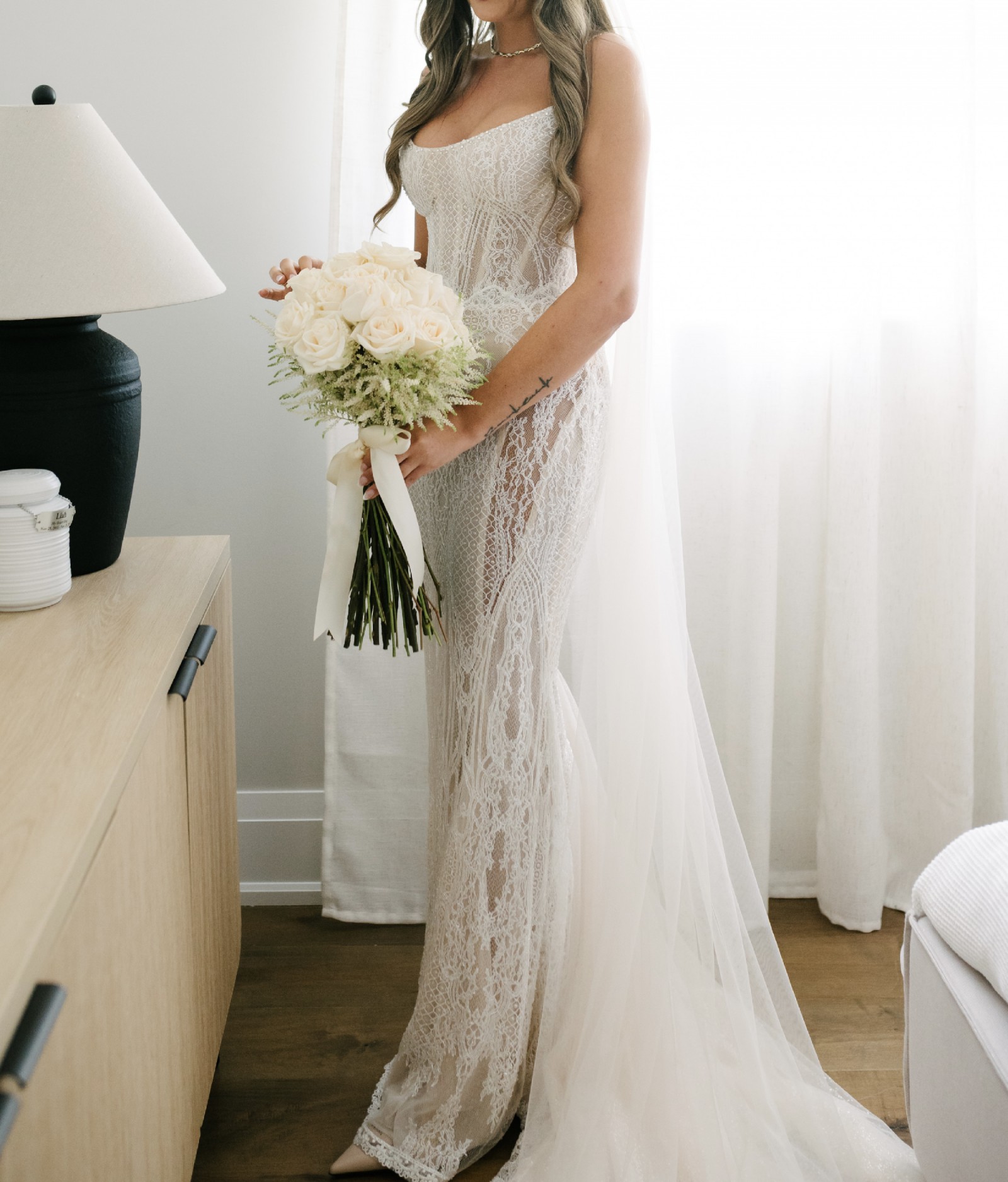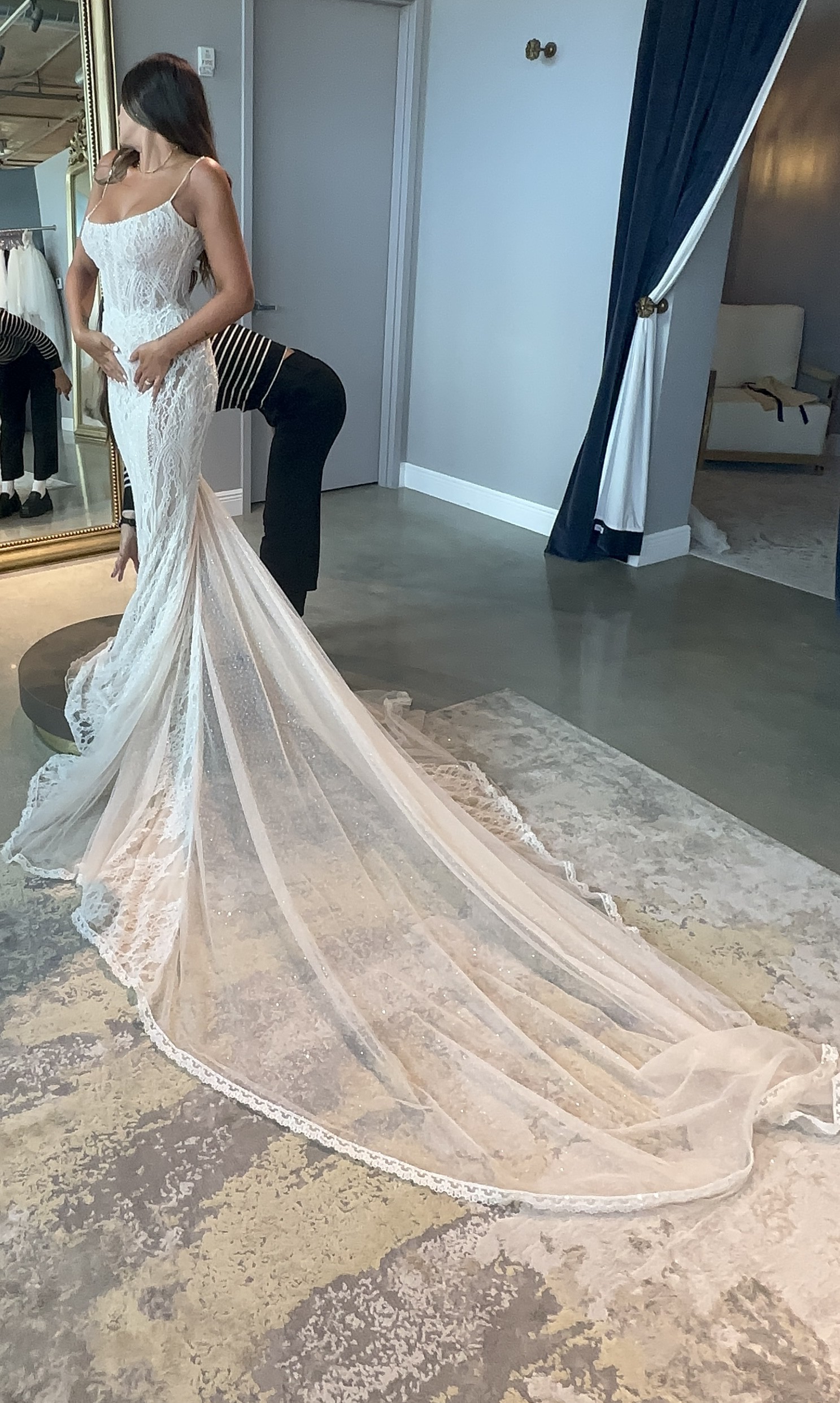 This stunning Elysee dress by Galia Lahav was the centerpiece of my dream wedding, and I could not have imagined a more breathtaking gown to walk down the aisle in. The mermaid silhouette hugs every curve beautifully, creating a timeless and elegant look that made me feel like royalty. The sweetheart neckline adds a touch of romance, while the intricate lace detailing brings a delicate, vintage vibe to the design.