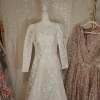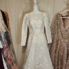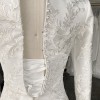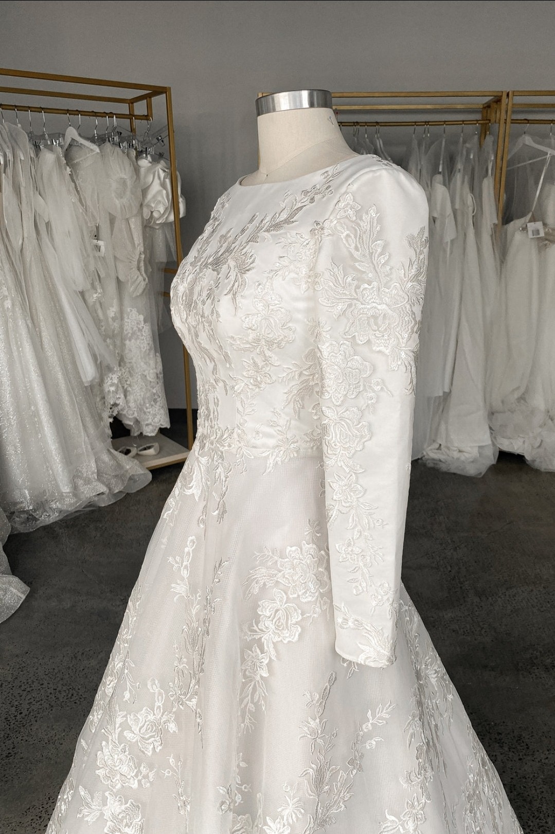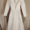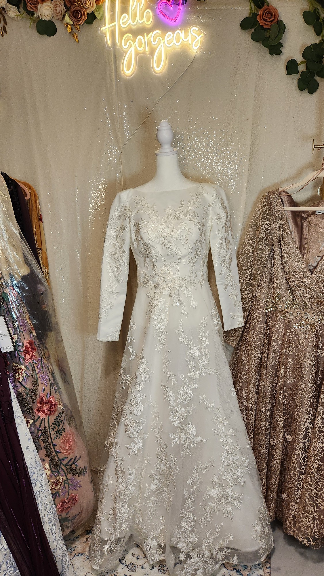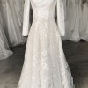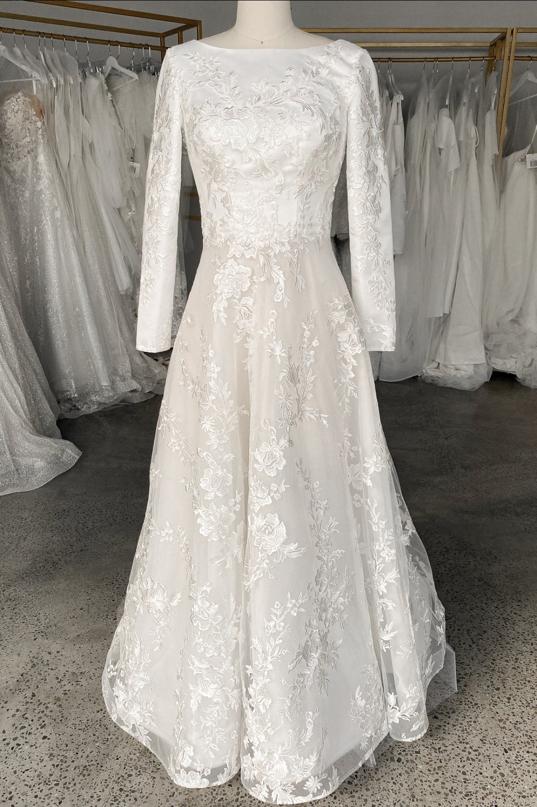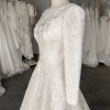 This breathtaking gown features a classic silhouette with a modern twist: a fitted bodice with a flattering boat neckline and long sleeves, adorned with delicate floral embroidery that cascades into the skirt. The A-line cut flows gracefully, offering both comfort and movement, while the light ivory hue creates a soft, luminous glow.