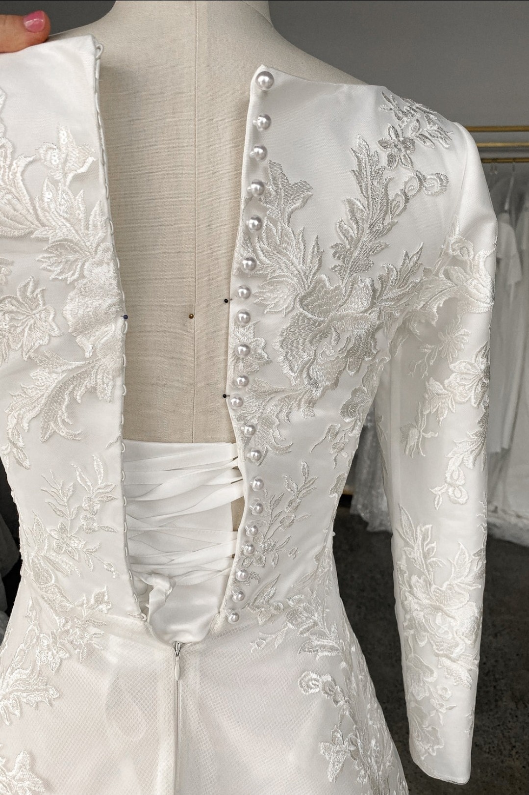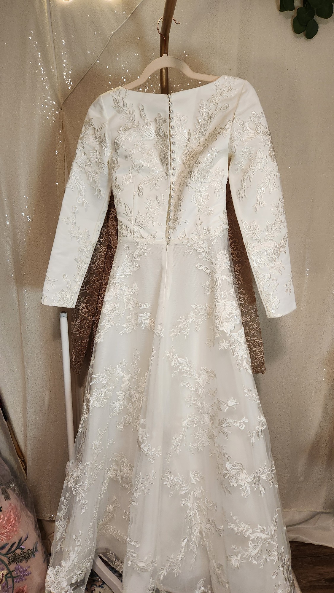 From the back, pearl buttons trail down over the intricate lace, concealing a hidden corset-style closure that ensures the perfect fit. Every inch of this gown is crafted with artistry – shimmering floral embroidery dances over airy layers of tulle, catching the light in the most romantic way.