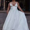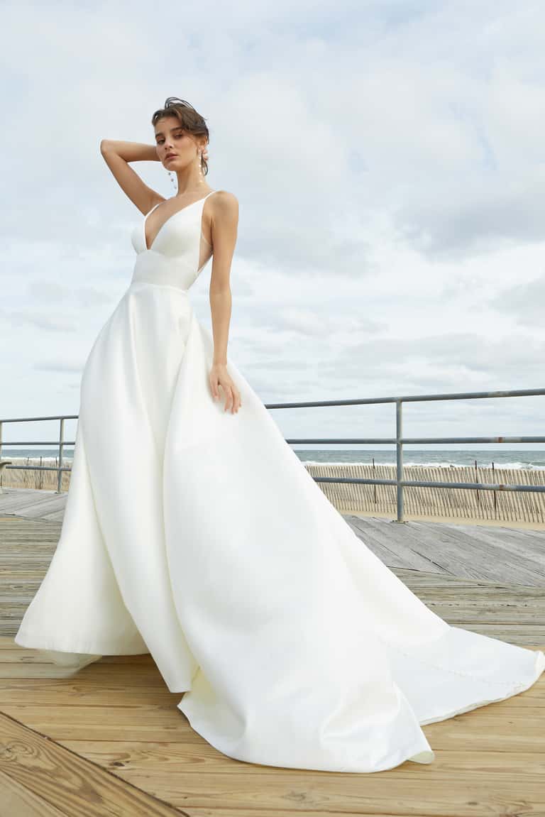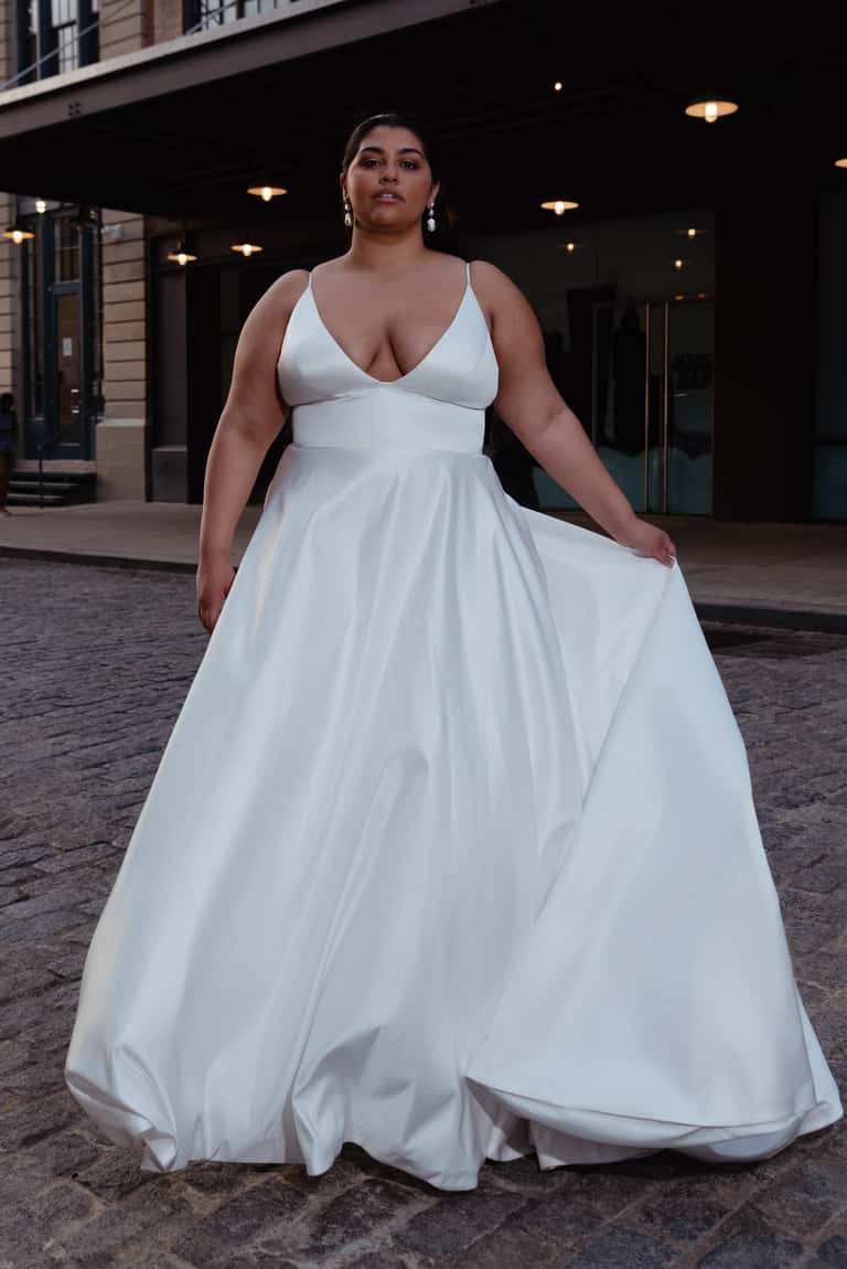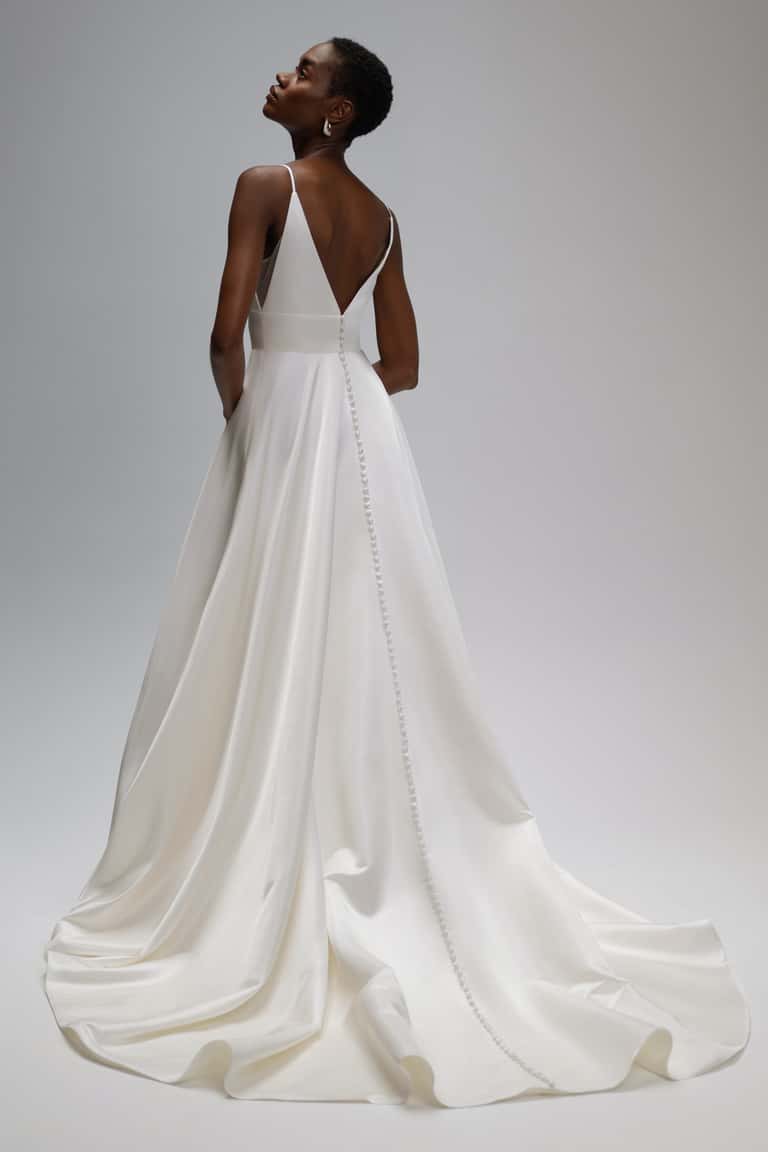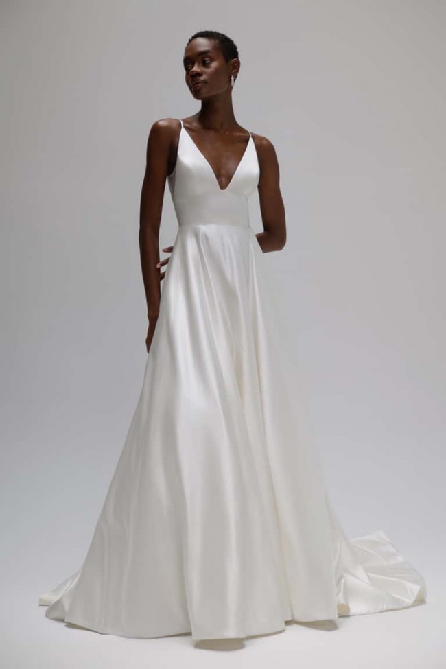NEW with tag Jenny Yoo Dylan gown. Never worn or altered. Comes with original garment bag Picture of the tag (3) and of the dress against the brown door (6) are the actual dress. The Dylan gown, cut in our lustrous new satin taffeta, is fit for the modern woman who secretly wishes to feel like a princess. The clean architectural lines of the bodice, with her plunging V neck and side illusion panels offer a sultry balance to the romance of the full flowing A line skirt. Covered buttons to the hem add a timeless feel, but side seam pockets ensure a playful attitude! Details: - Jenny Yoo Collection Satin Taffeta fabric Spaghetti straps Notched V neck Cummerbund waist Circle cut skirt Side seam pockets Covered buttons to hem