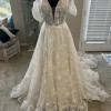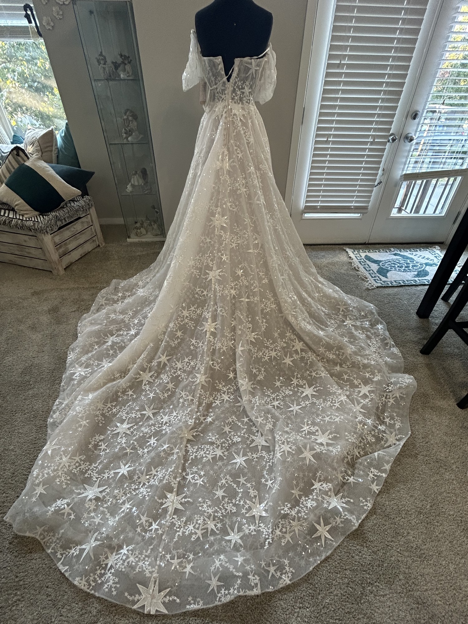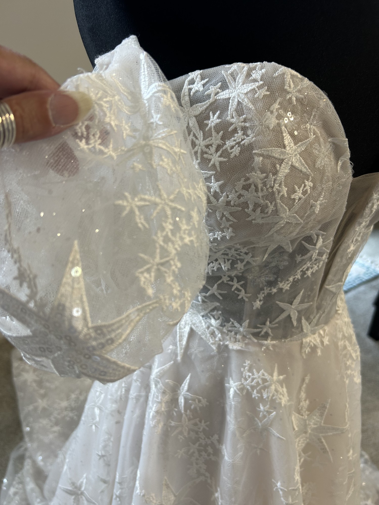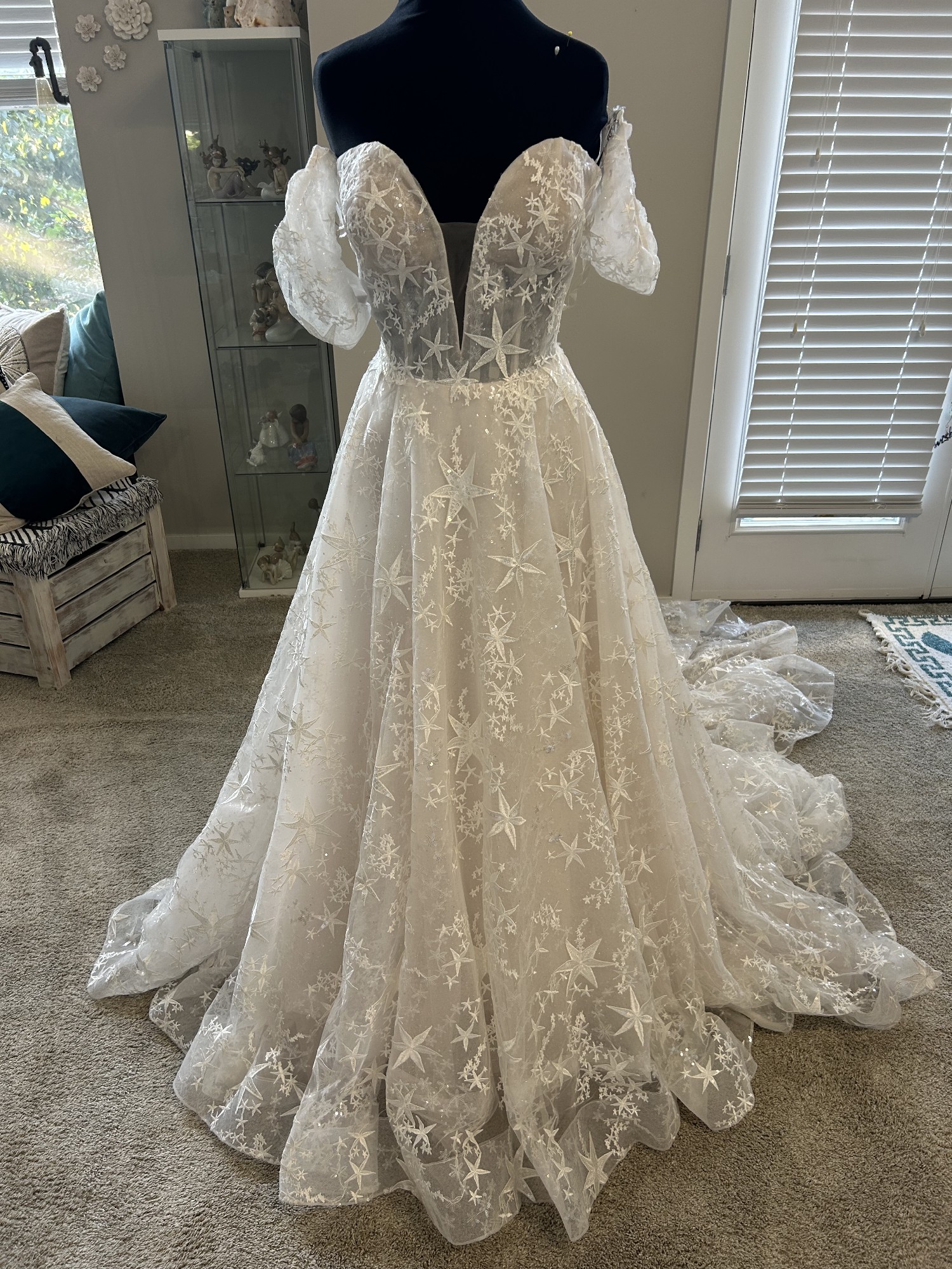 Unique allure dress the lace has stars all over it and sparkle tool underneath and sparkle on the cases deep sweetheart front mid back unlined bodice. Has removable cap, sleeves .excellent condition would recommend dry cleaning as it was a store sample and tried on by others no visible imperfections or stains