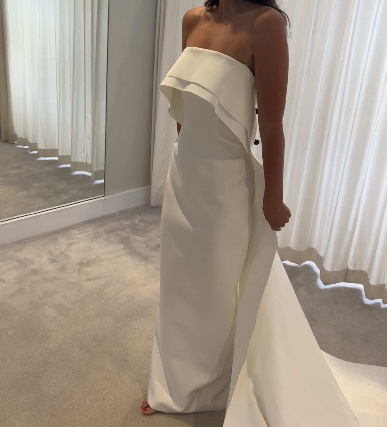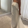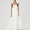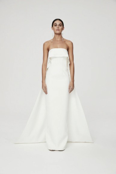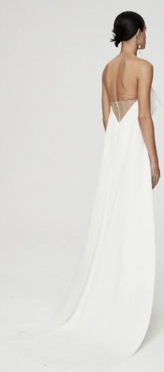 The Rachel Gilbert Emmett Gown features a simple, elegant strapless silhouette with a dramatic cape at the back. A mesh V insert creates the illusion of a backless design, adding a subtle touch of allure.