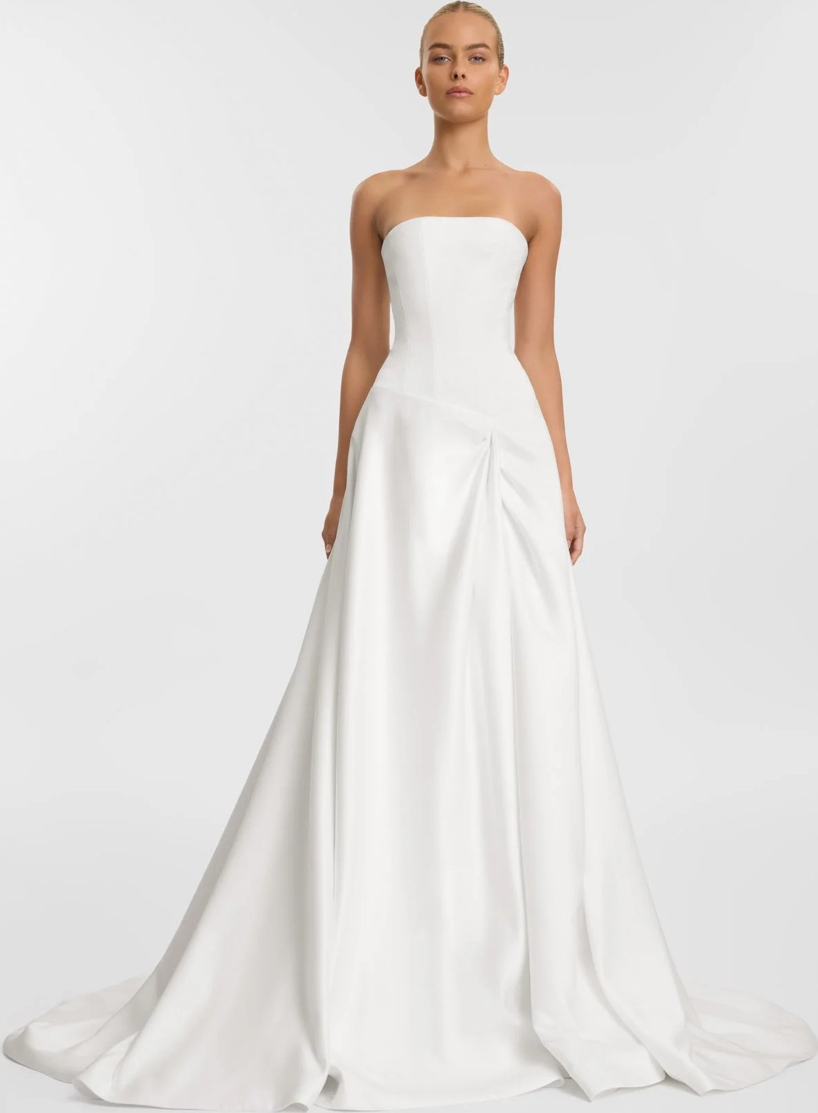 The strapless design offers a touch of allure while ensuring comfort and confidence throughout your special day. Crafted from luxurious satin, this gown presents a soft sheen that catches the light beautifully, enhancing the overall romantic feel. The mid back adds a touch of modest detail, ensuring the dress remains classic while allowing for a hint of unexpected charm.