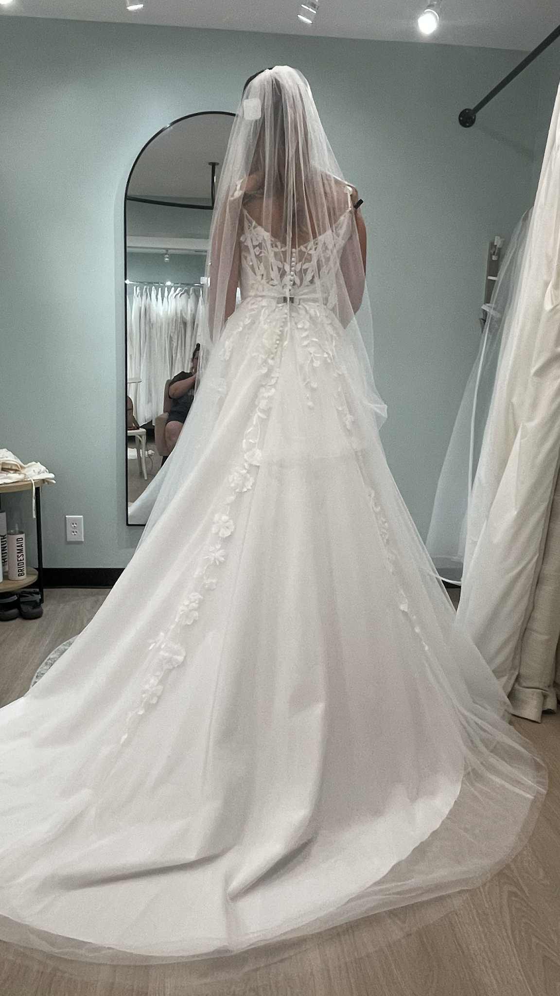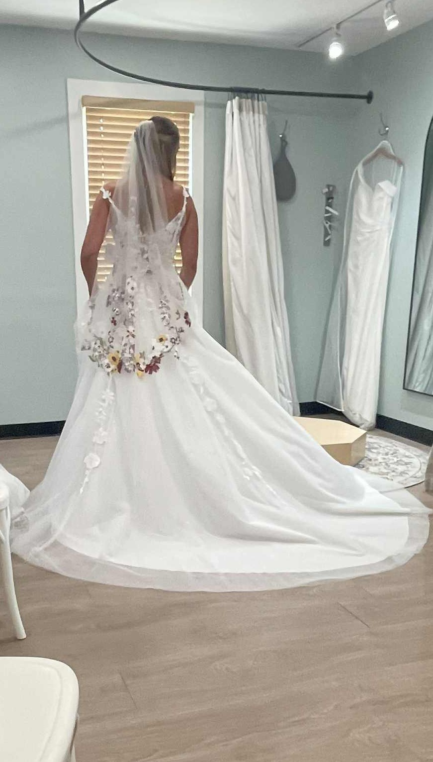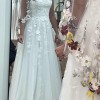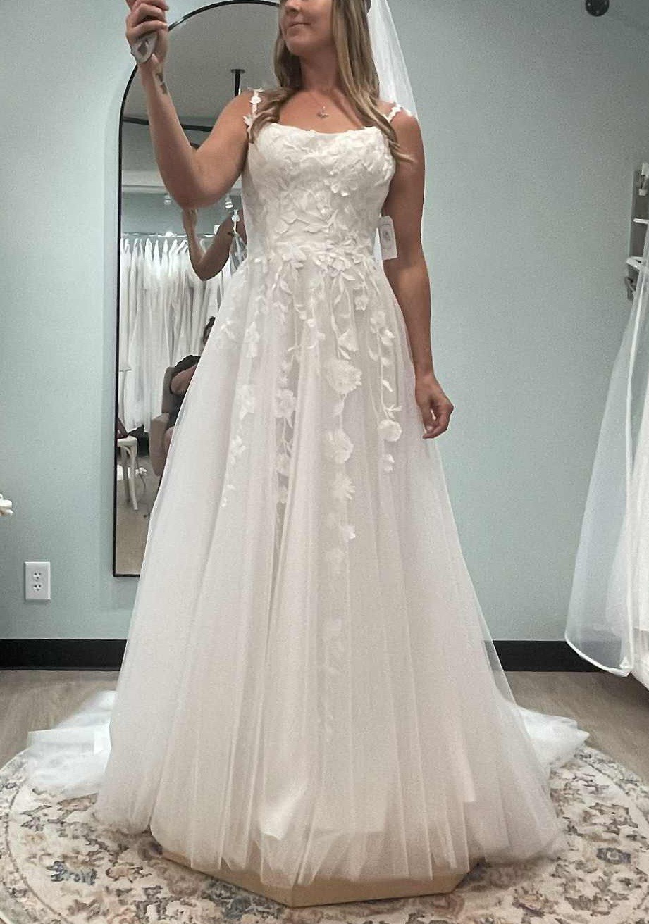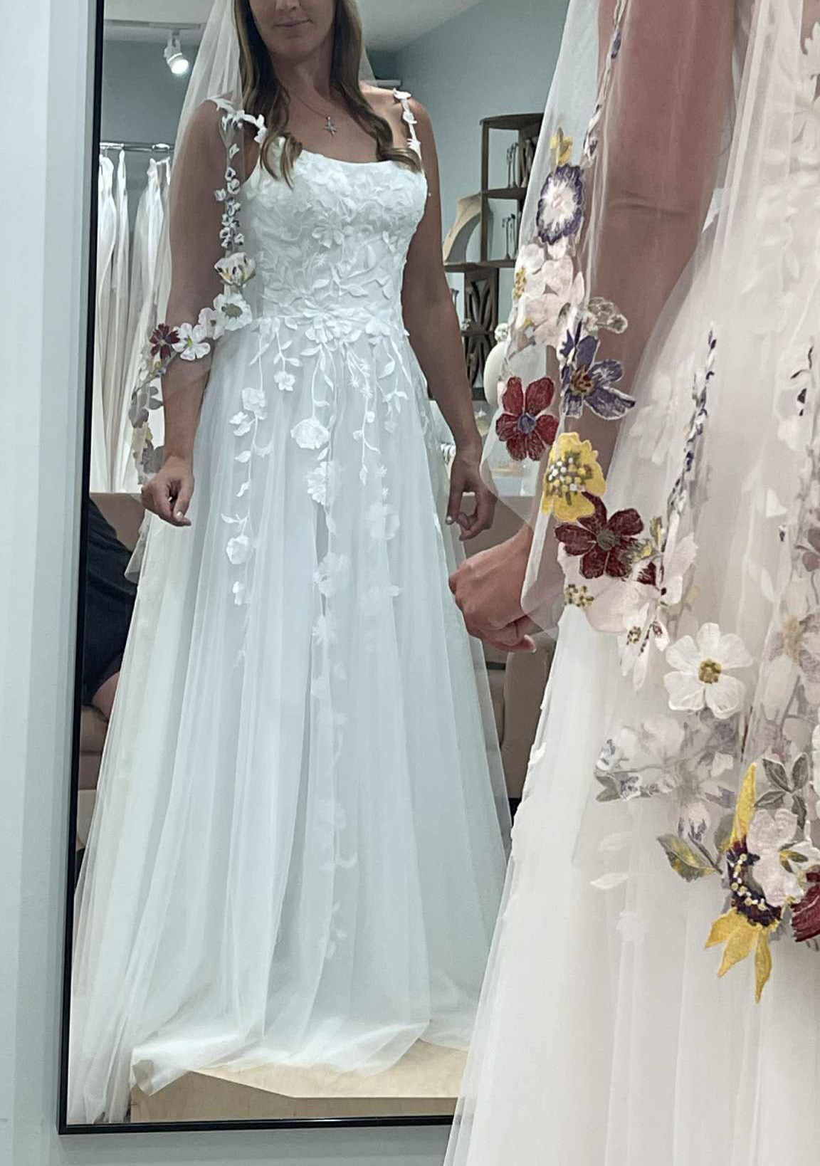 Beautiful dress still in gown bag. Has bonning. Has zipper and buttons down the back. Beautiful floral applique.