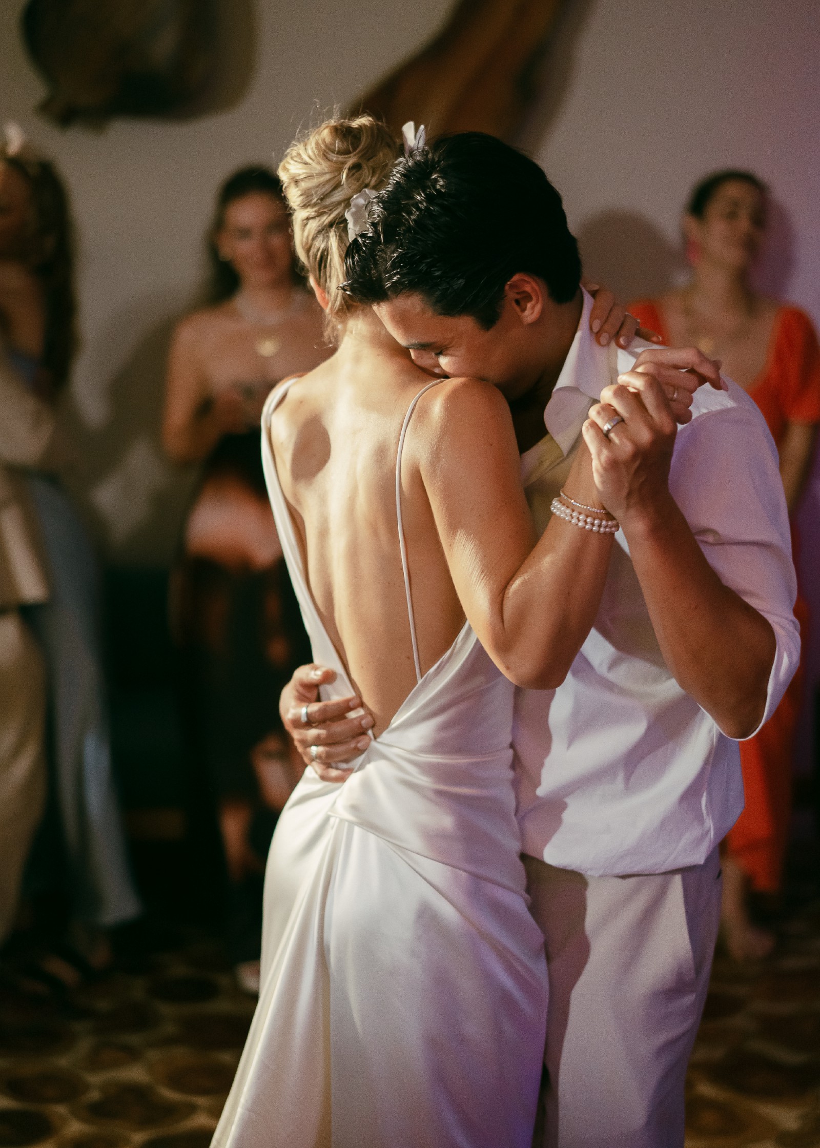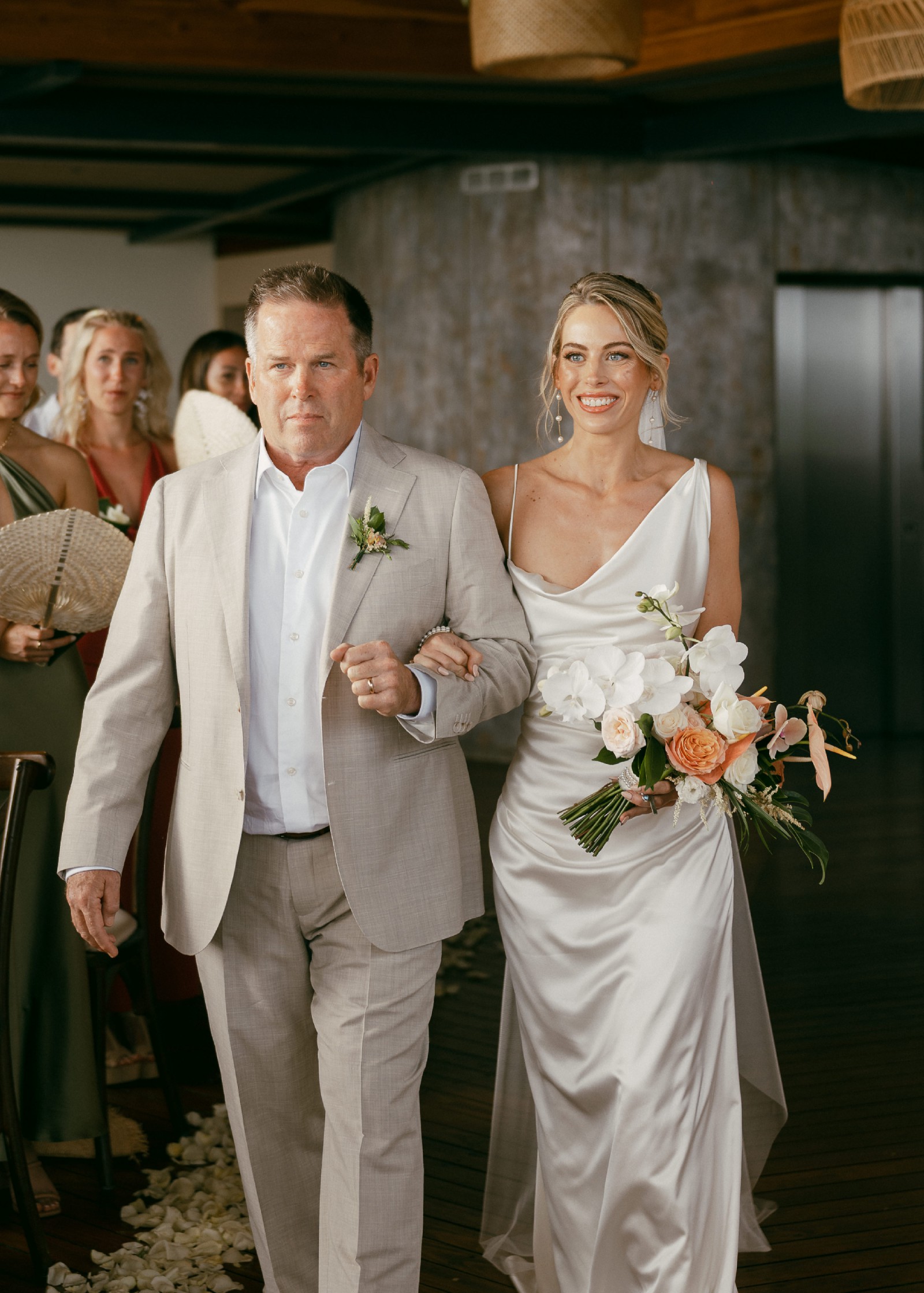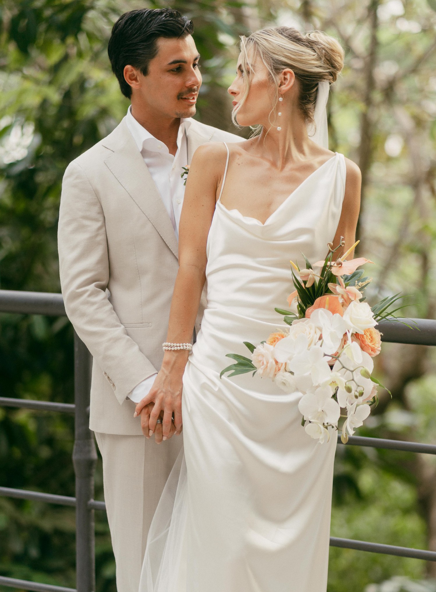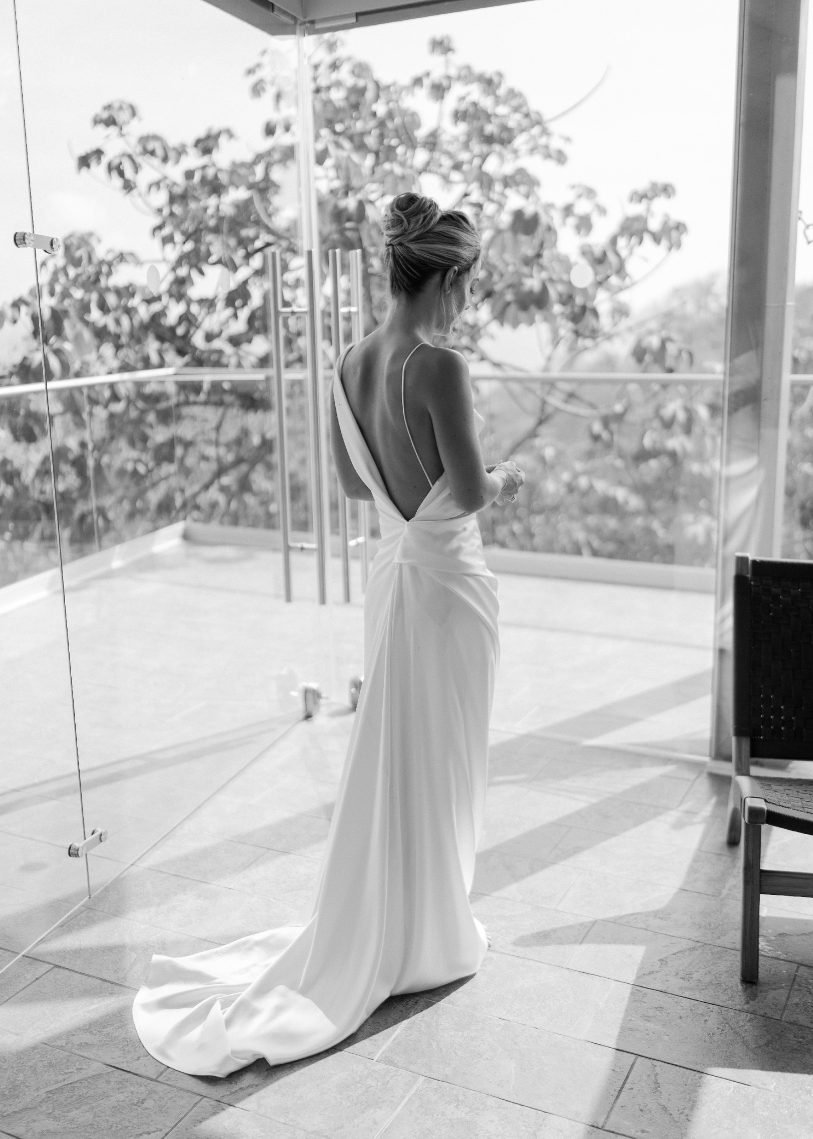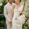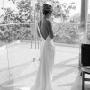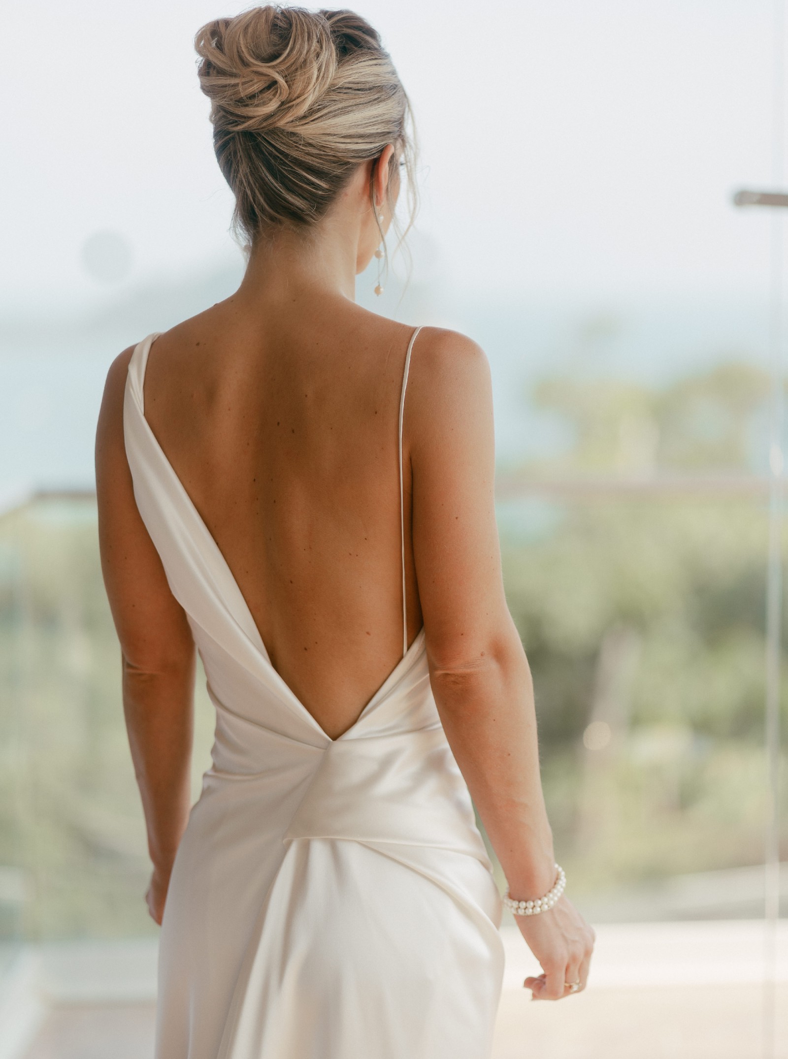 First seen on the red carpet, the Minerva is a backless floor length gown creating a sensual silhouette. With a twisted asymmetric neckline this non-corseted gown drapes across the body, to pool in a train behind the bride. This Minerva is the ivory silk material.