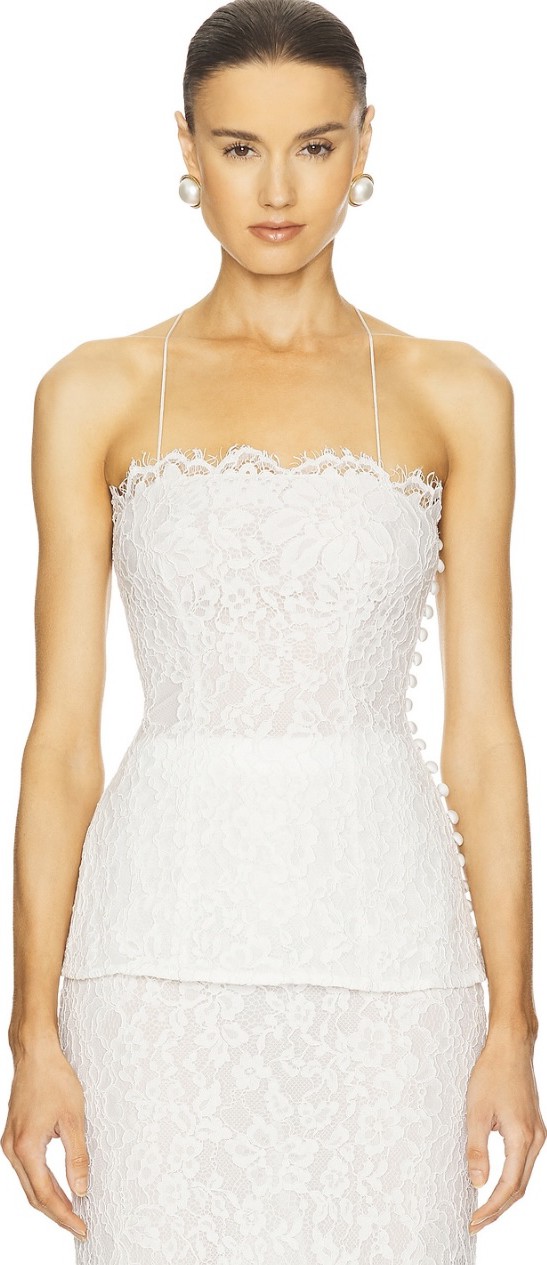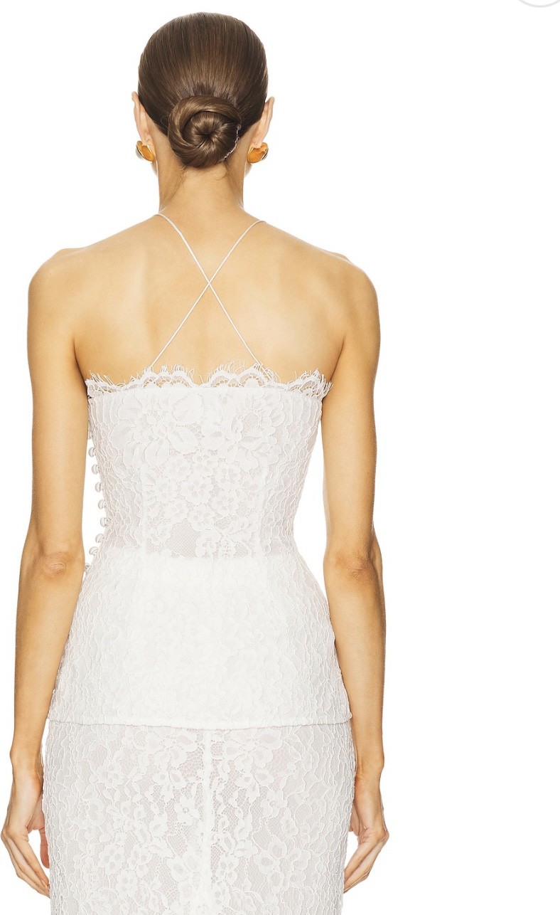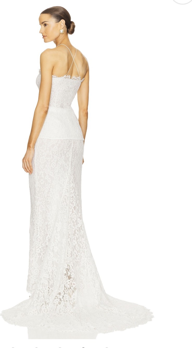 Lace two-piece which has been worn once. I have added a discreet button so the skirt can be bustled. Please message me for pictures of it on. The length was perfect on me with flats. My measurements are Bust 84.5cm Waist 68cm Hips 96cm Waist to floor 116cm Height 5ft10cm