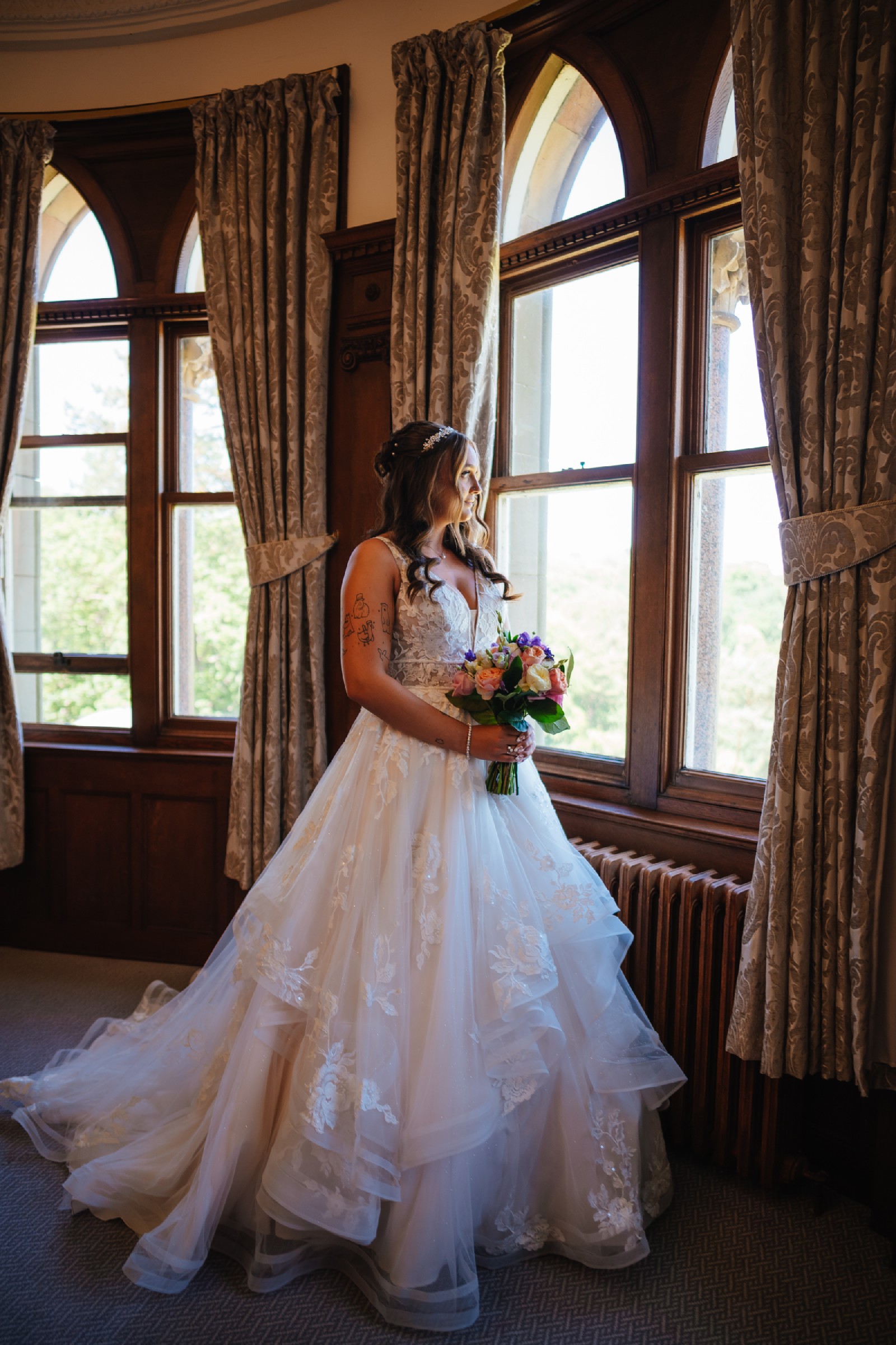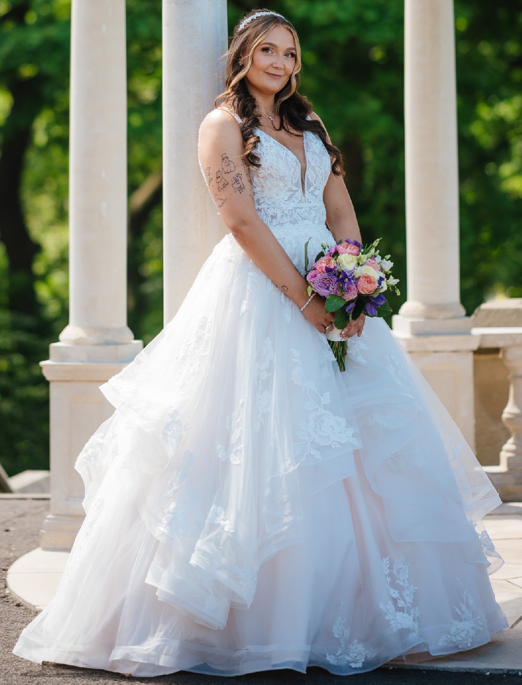 The intricate beading and delicate embroidery details add a touch of sparkle, while the ruffles at the skirt create a dreamy, romantic feel as you walk down the aisle. The V-back design adds a bit of allure, ensuring that you’ll turn heads from every angle. With straps that provide both support and style, this dress is comfortable to wear while still being utterly breathtaking.