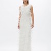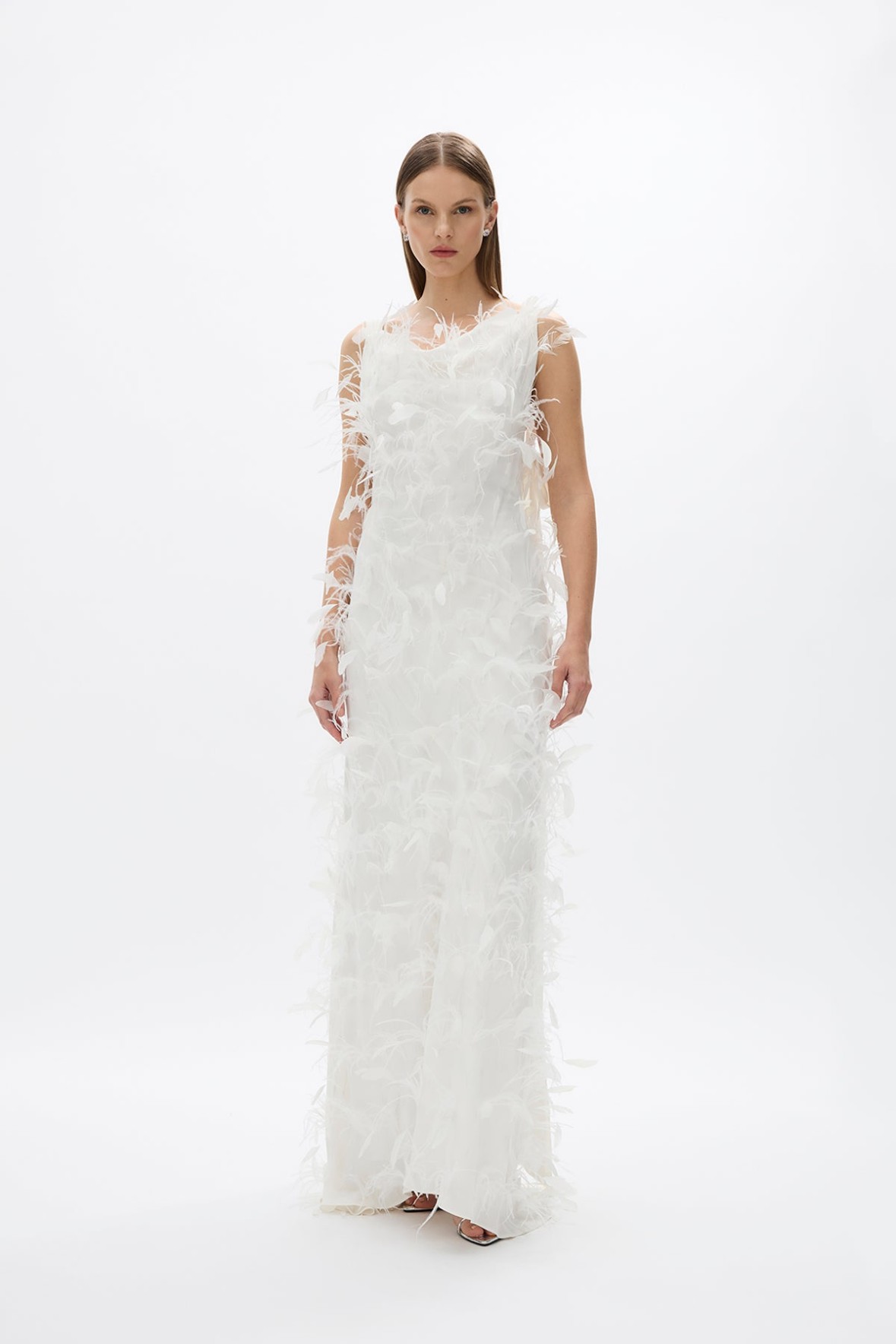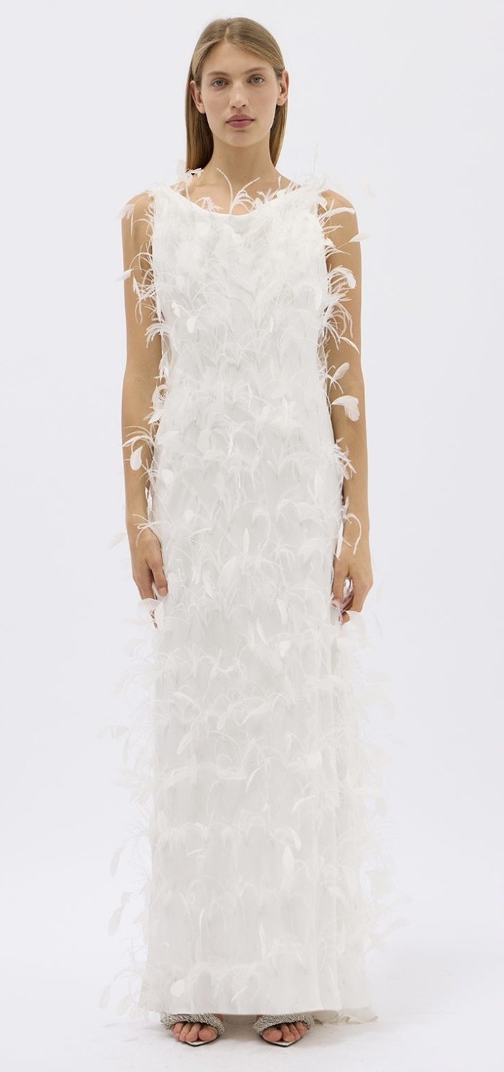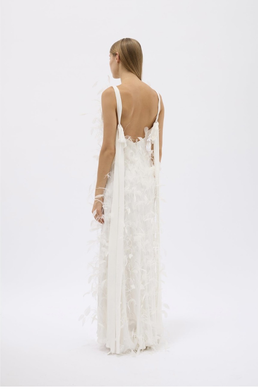 All eyes will be on you wearing the Sutton, a gown that promises poetic motion and elegance in equal measure. The slim-fitting shape is offset with a trail of wispy feathers whilst the floor-length contributes to the classic factor.
