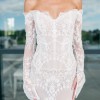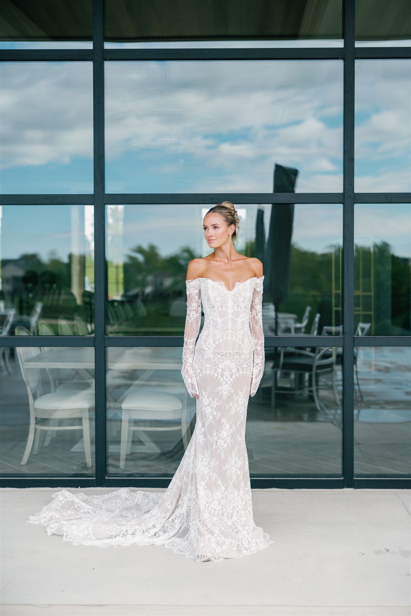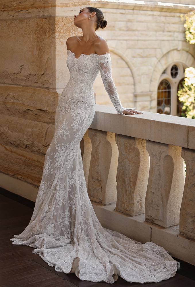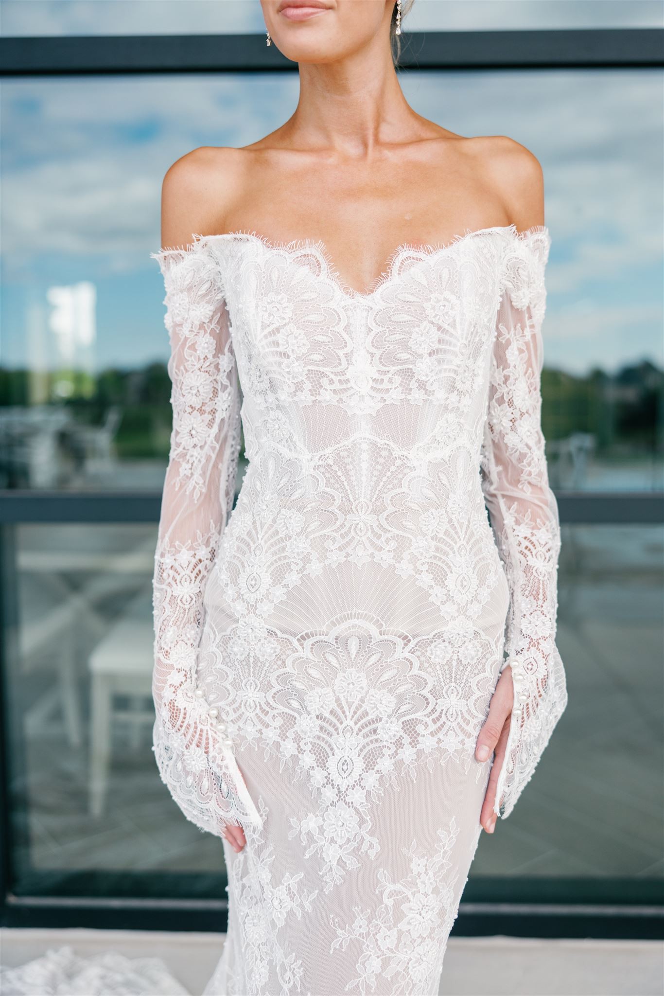 Beaded lace fit and flare gown. Gorgeous details!
