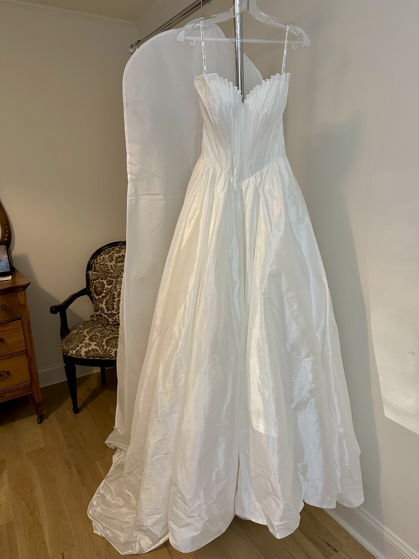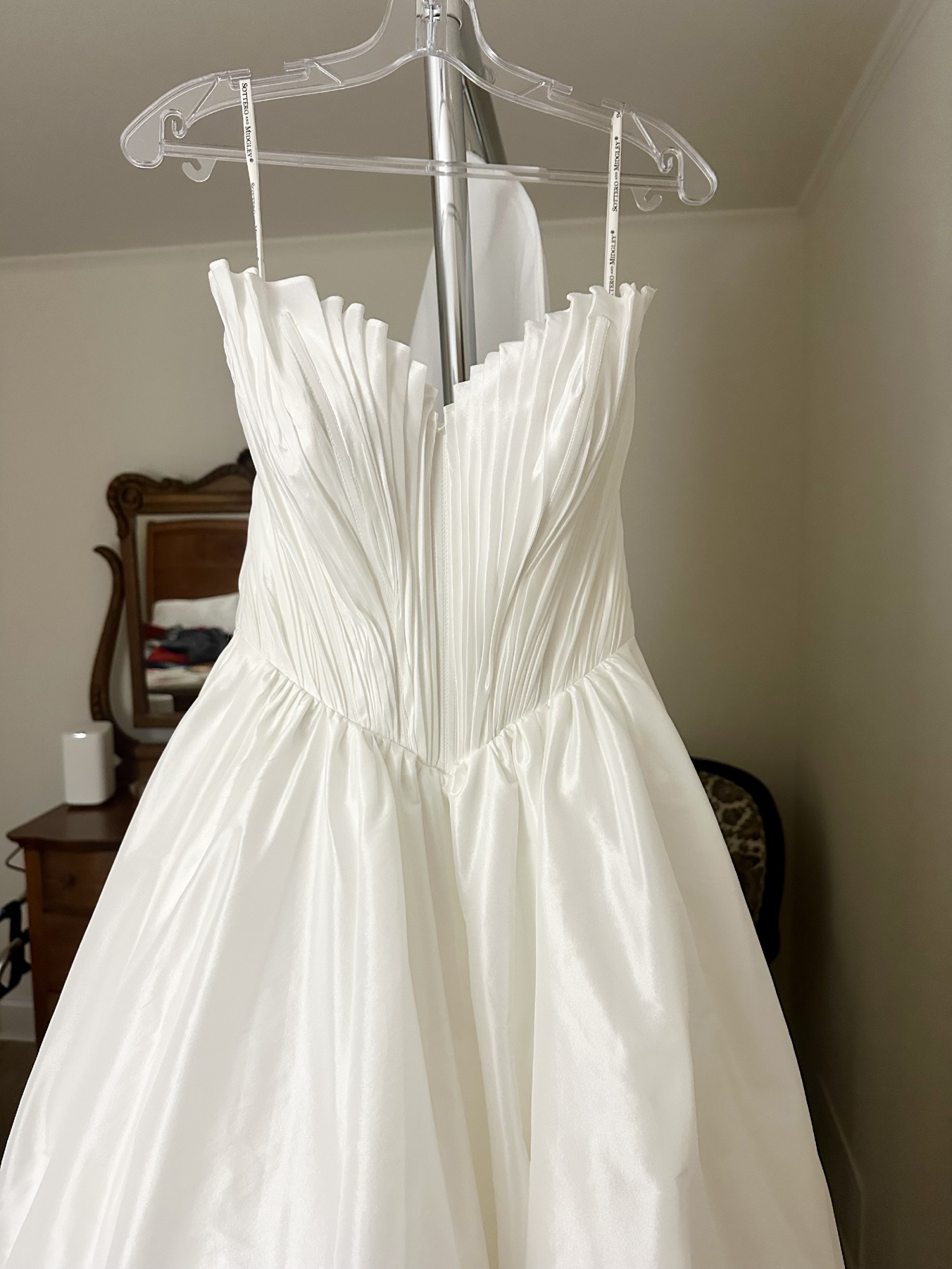 Sottero and Midgley Wedding Gown, Style: Lafayette, Size 4, Ivory, Bordeaux taffeta, Ruched Bordeaux taffeta with exposed boning and topstitching detail, Strapless sweetheart neckline with soft ruffle accent, V-back, Zipper closure over inner shapewear corset with covered buttons trailing to hem, Side slit, Bubble hem train, Pockets.