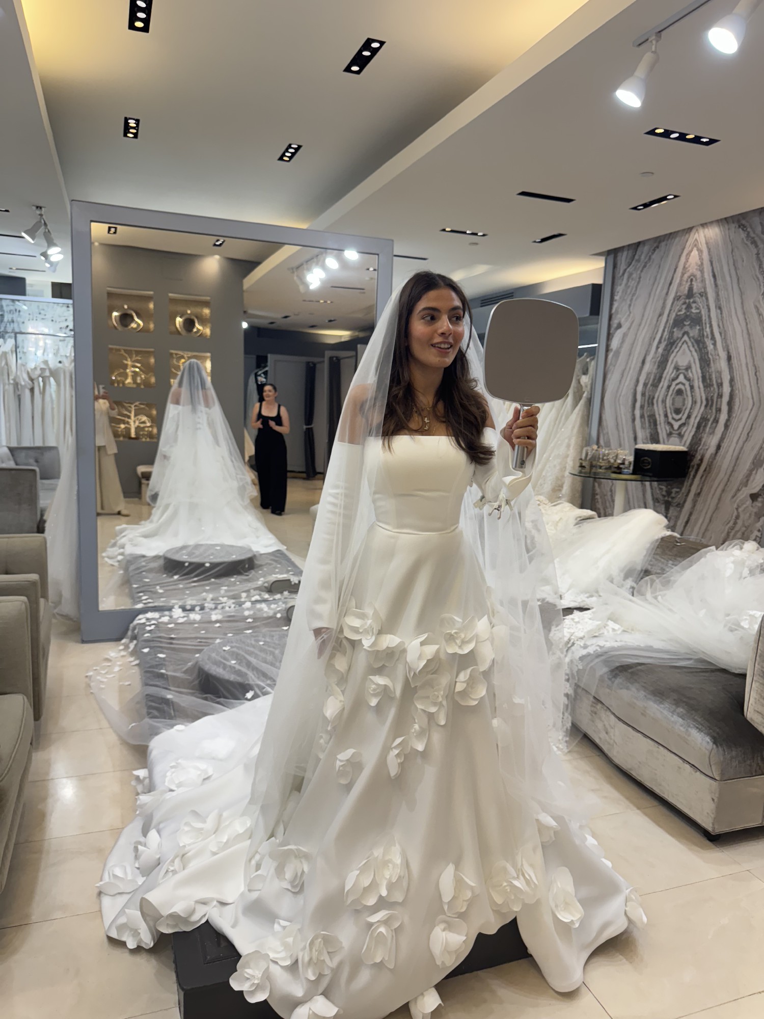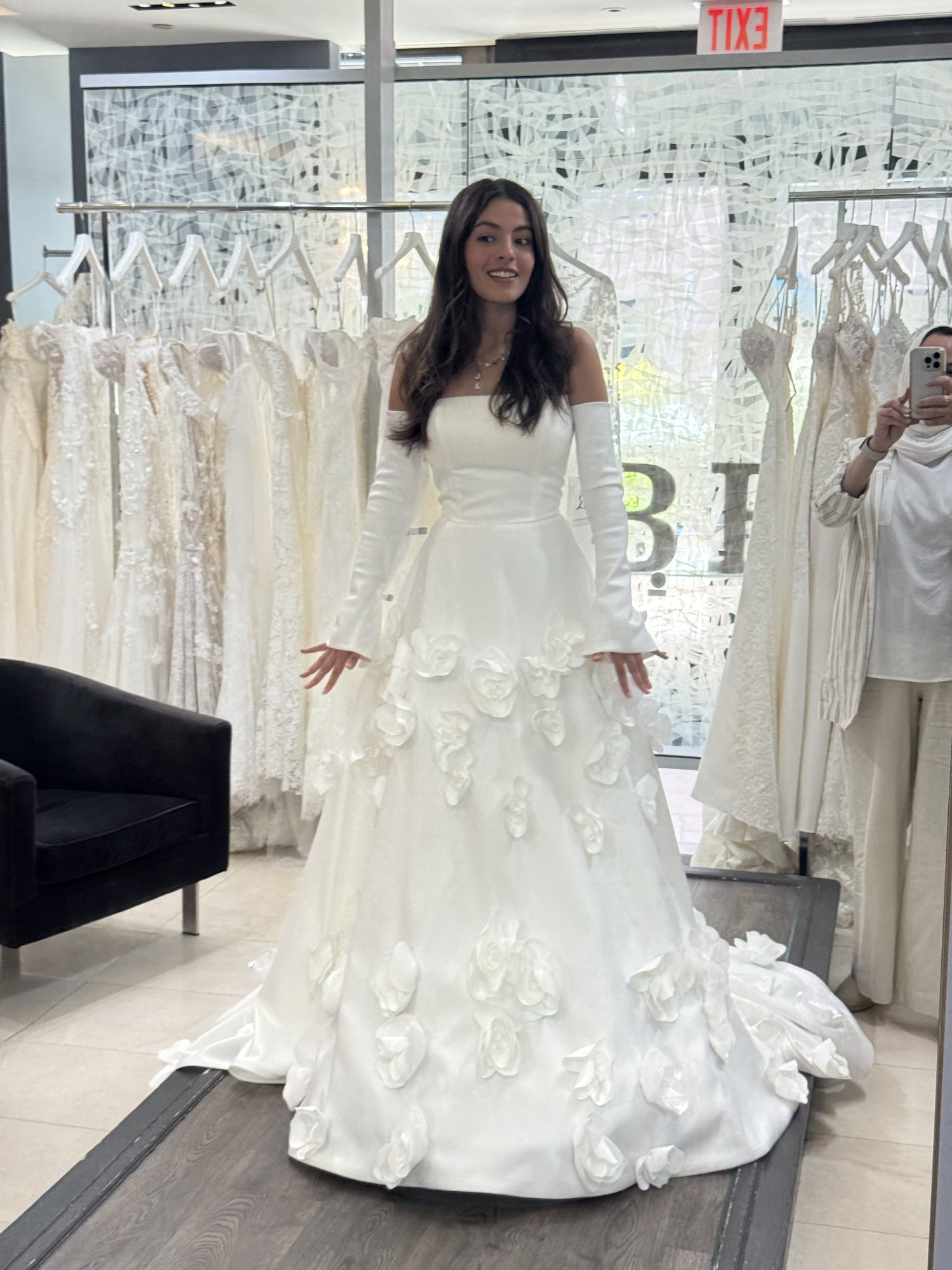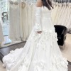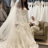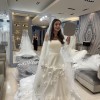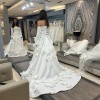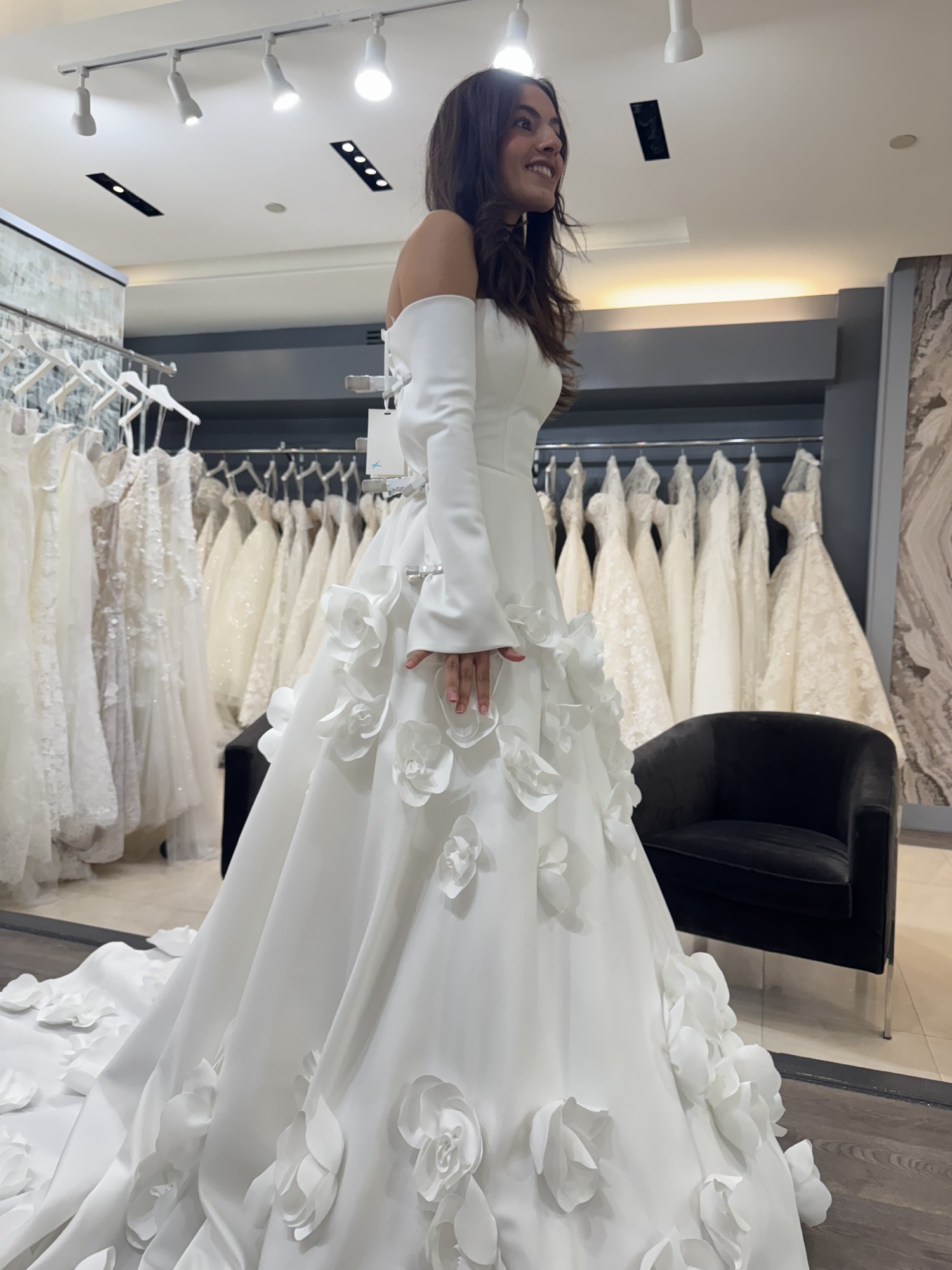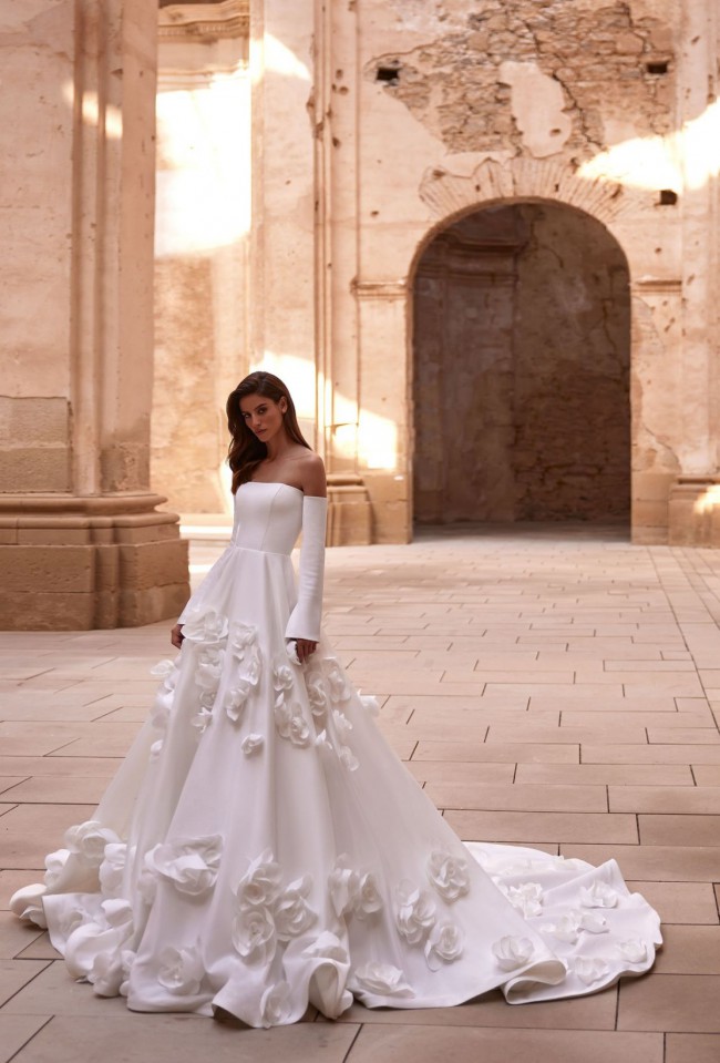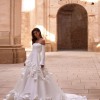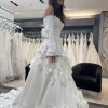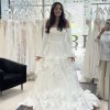Unaltered Marcelina Milla Nova A-line dress with flower embellishments. I bought it 2 days ago from sample sale, and it has never been worn. It is a size 12 but can be altered significantly due to fabric. Dress has minor stain, but can be cleaned