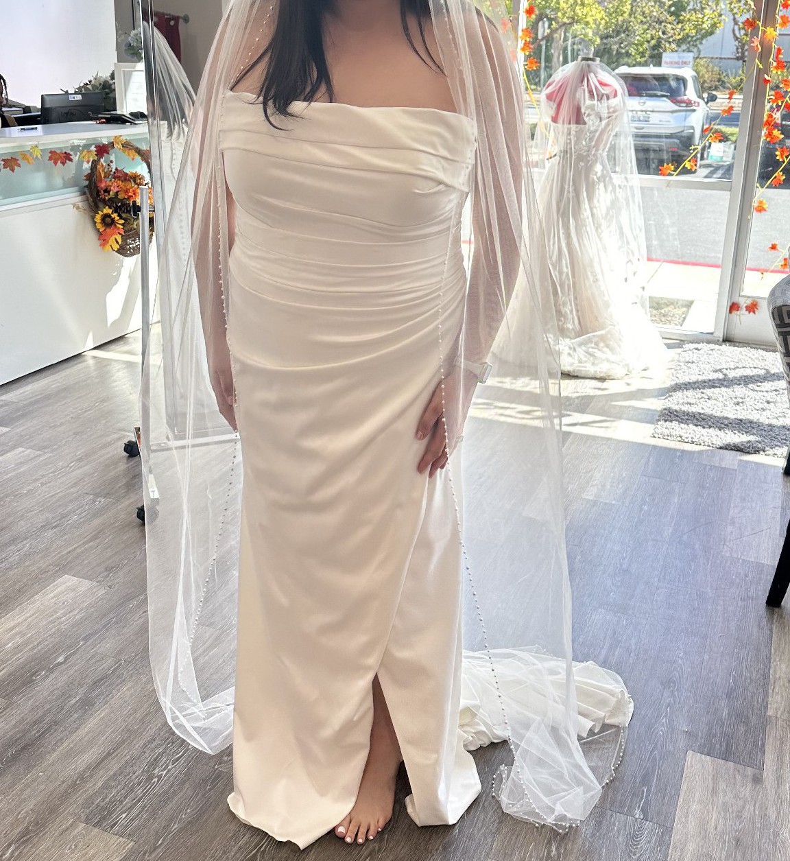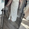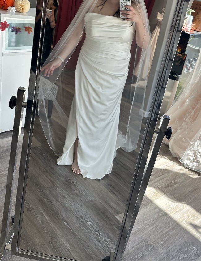 Luxurious stretch satin, tucked and ruched in all the right places and artfully draped off the shoulder, makes our Jade gown absolutely perfect for the glamorous and classic bride. Designed for the Spring 2023 Wedding Dress collection, you'll love her effortless vibes, whether you're planning a destination wedding or fabulous formal reception. Finished with a thigh-high slit, zipper in the back with buttons. This dress has never been worn or altered and has been kept in a garment bag.