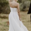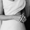 Three scalloped layers cascade into a delicate train that dances beautifully as you walk. The luxury organza — sheer, iridescent, and light as air — falls like a dream, catching movement and light in the most delicate way. It creates a romantic, almost magical quality without ever overwhelming the clean, contemporary silhouette.