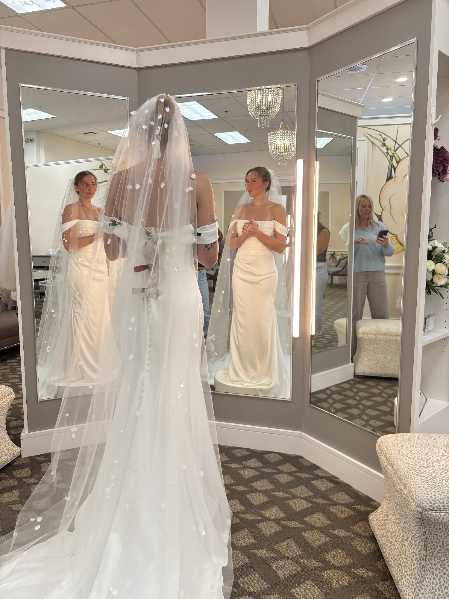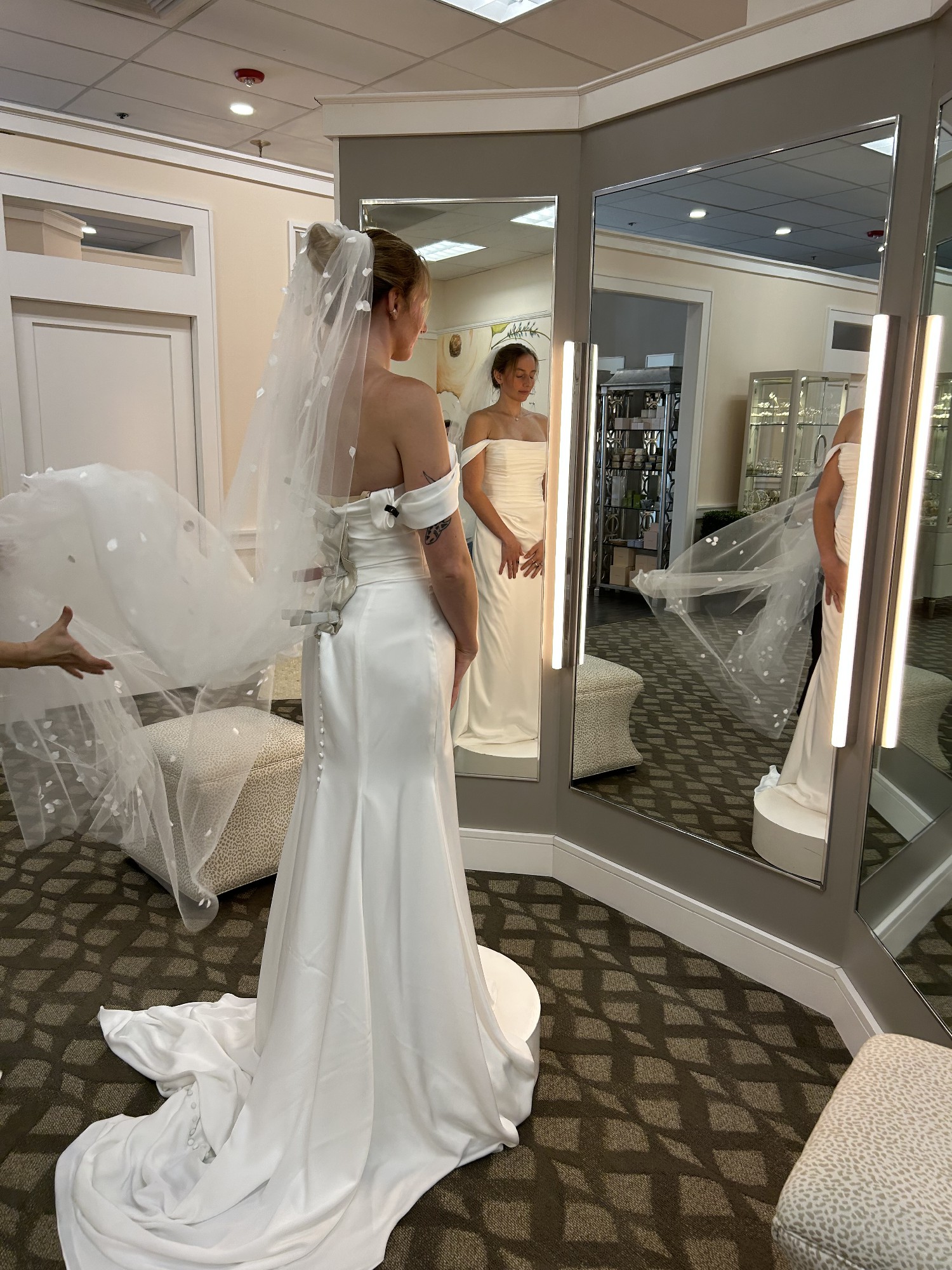 Unworn, unaltered, brand new charmeuse dress. Long train that can be bustled as needed. Dress size 10.