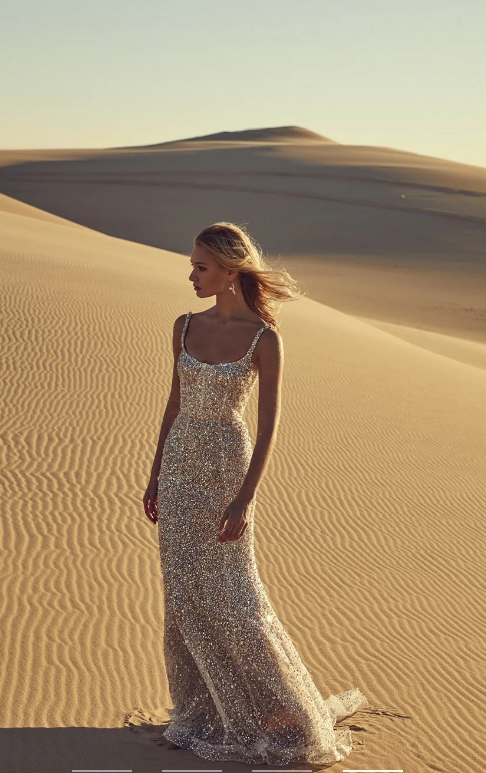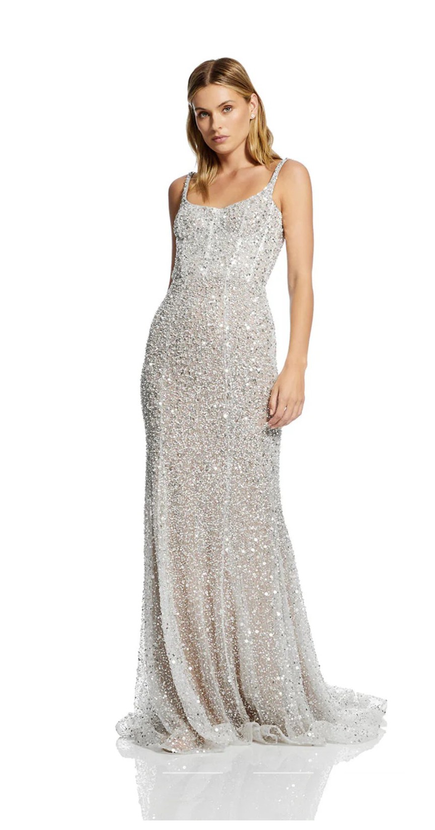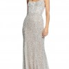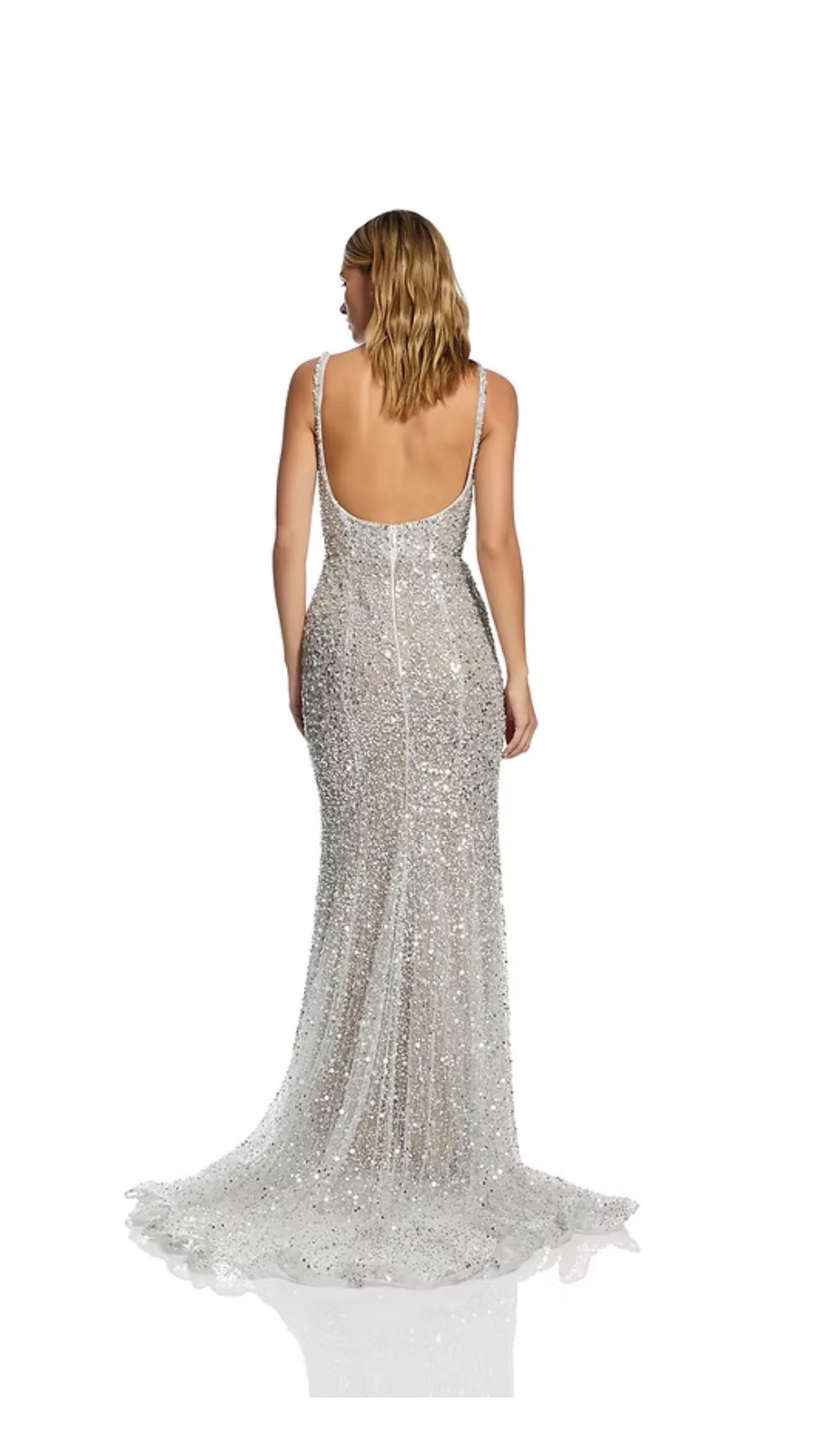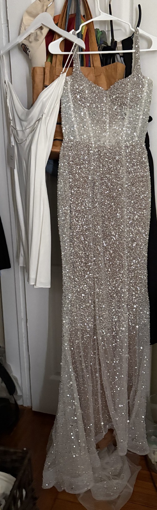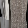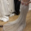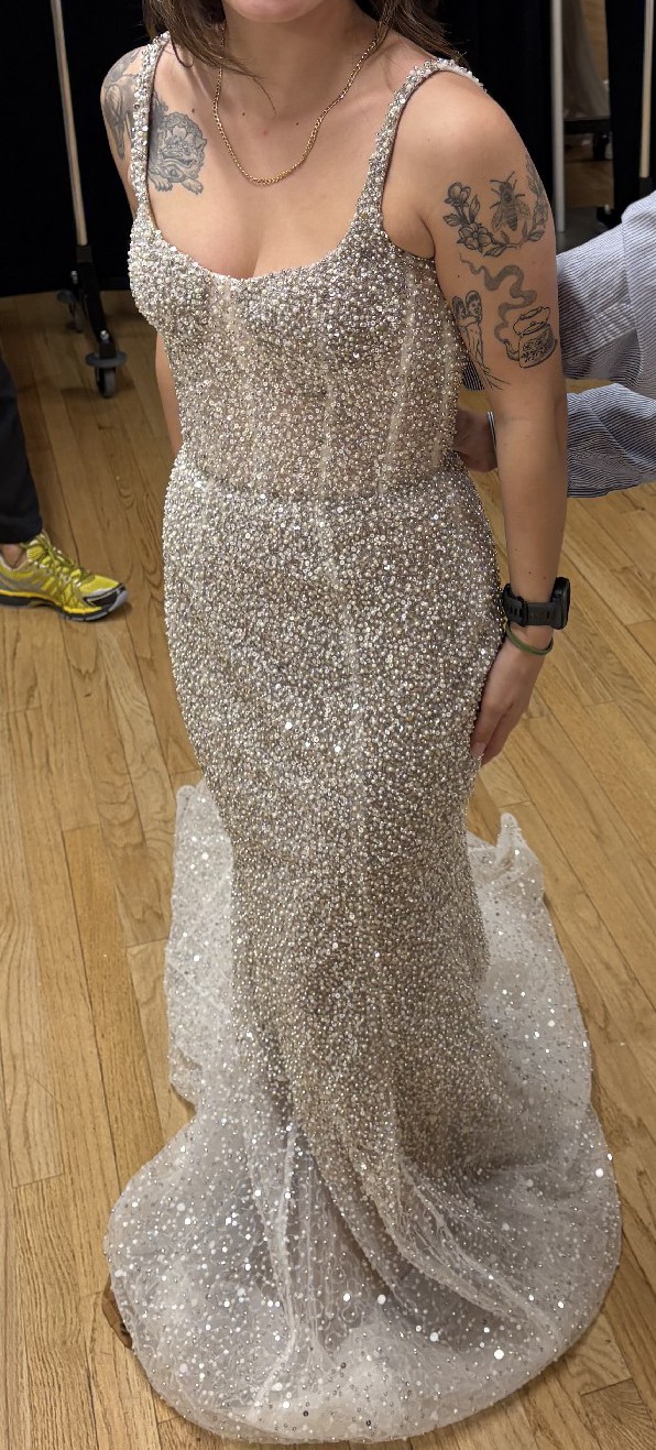 This elegant lightweight silver sequin maxi dress is perfect for a wedding, rehearsal dinner, reception look, or gala. Originally purchased at a sample sale without a zipper but otherwise in perfect condition with a garment bag included. Selling only because I found another dress for my big day ๐