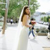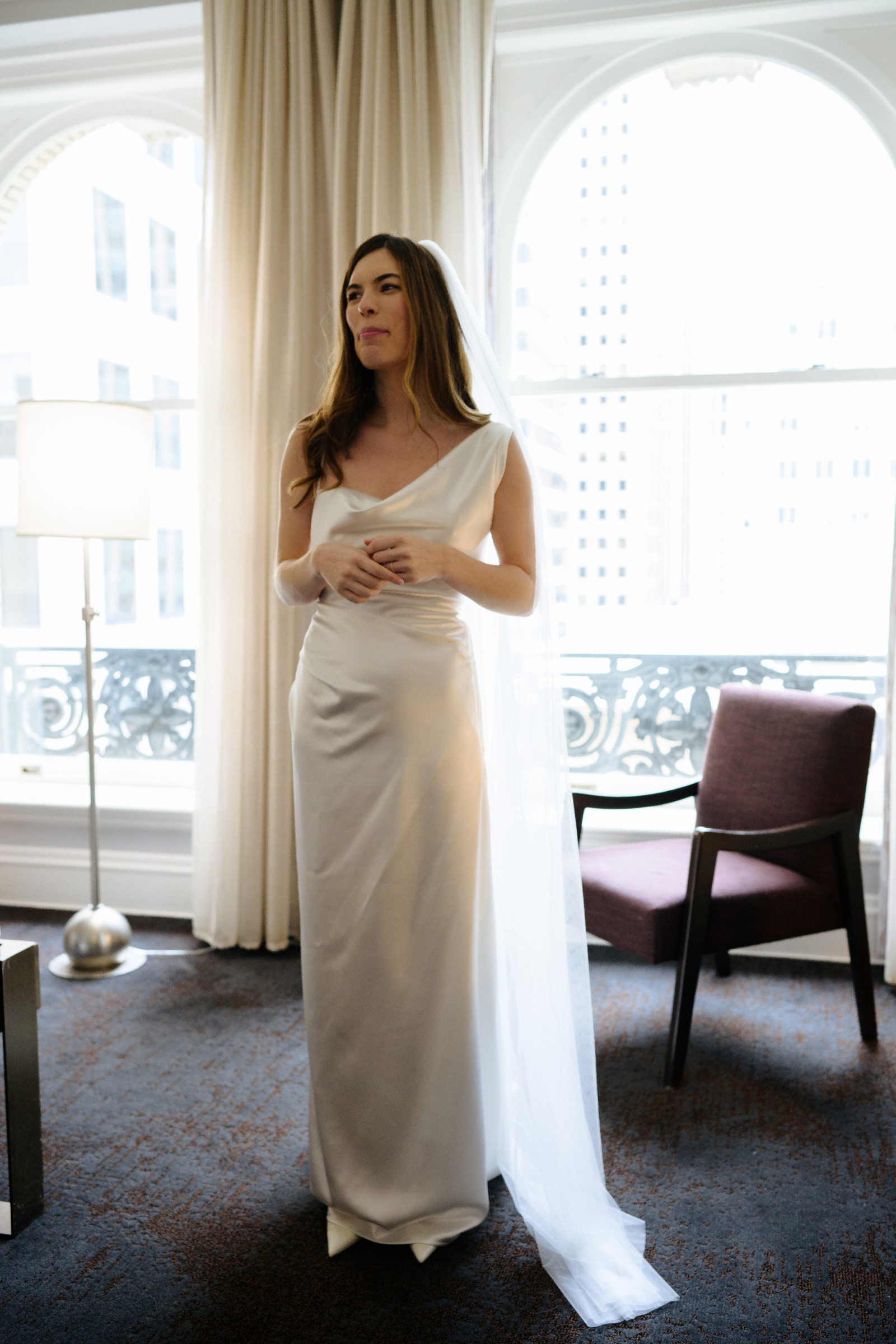 Vivienne Westwood Minerva gown in beautiful, pearl white, silk satin. Asymmetrical straps/bodice -- can adjust thicker strap, to create "off the shoulder" look or a more dramatic cowl neck. Backless with asymmetrical gathering over the right hip.