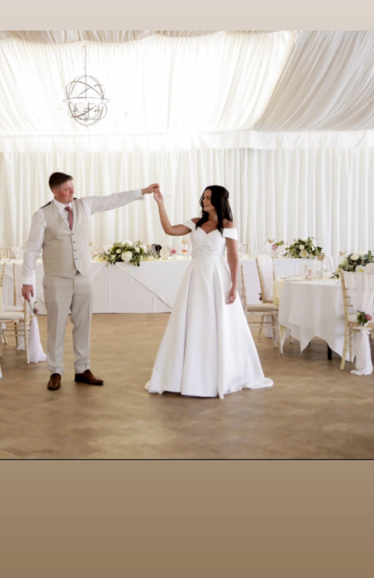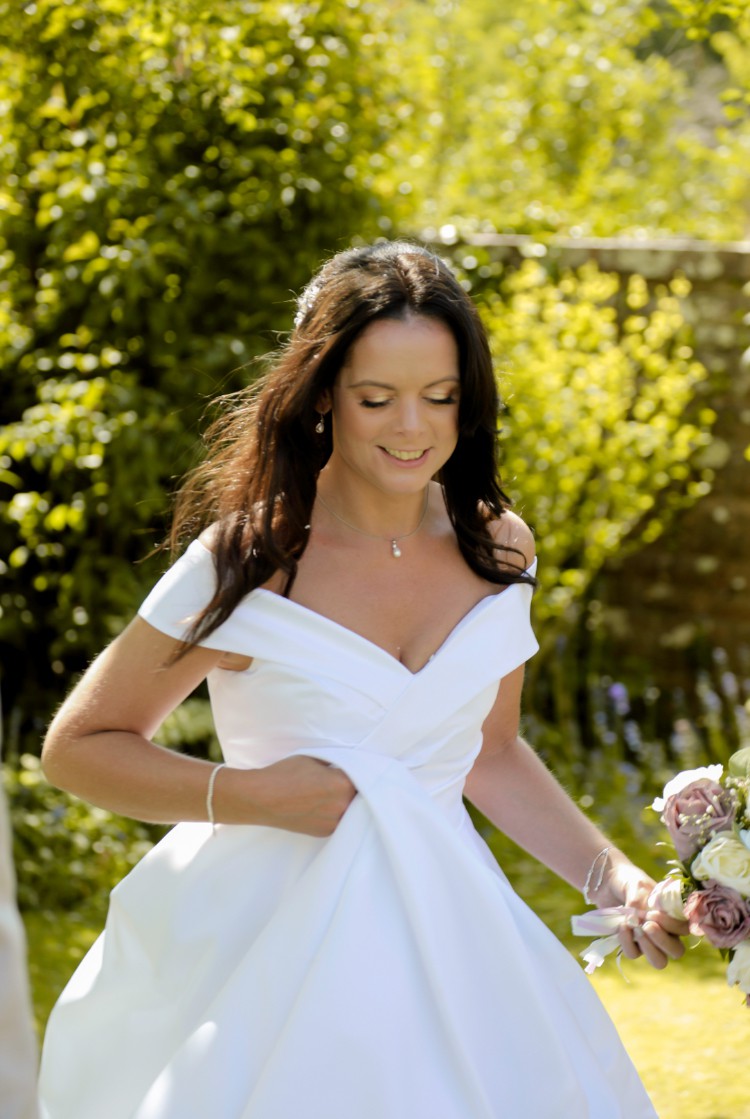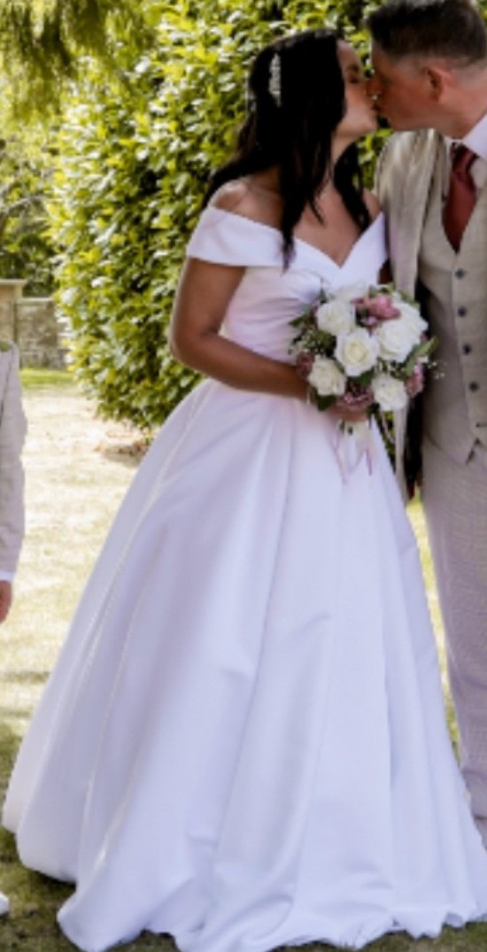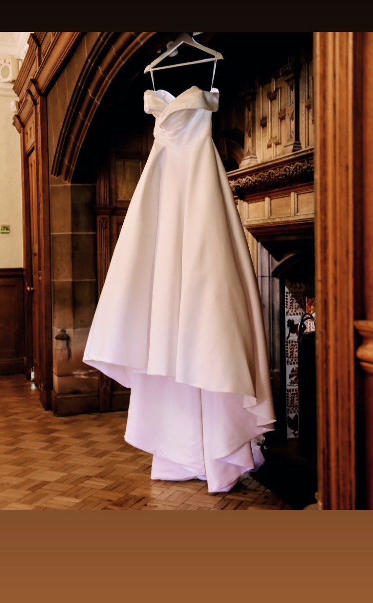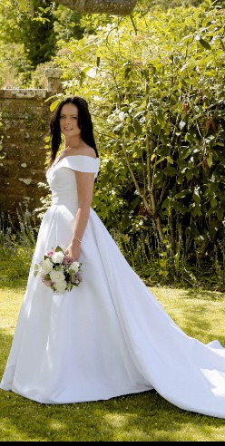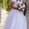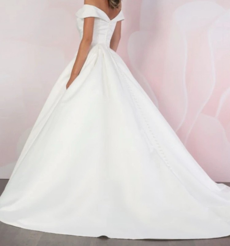This enchanting Emma Bridals gown, model BL384 TLH3025, was the perfect choice for my special day. An elegant A-line silhouette gracefully flows, making every step feel effortless and romantic. The off-the-shoulder neckline adds a touch of timeless beauty, framing my shoulders in a way that felt both sophisticated and whimsical.