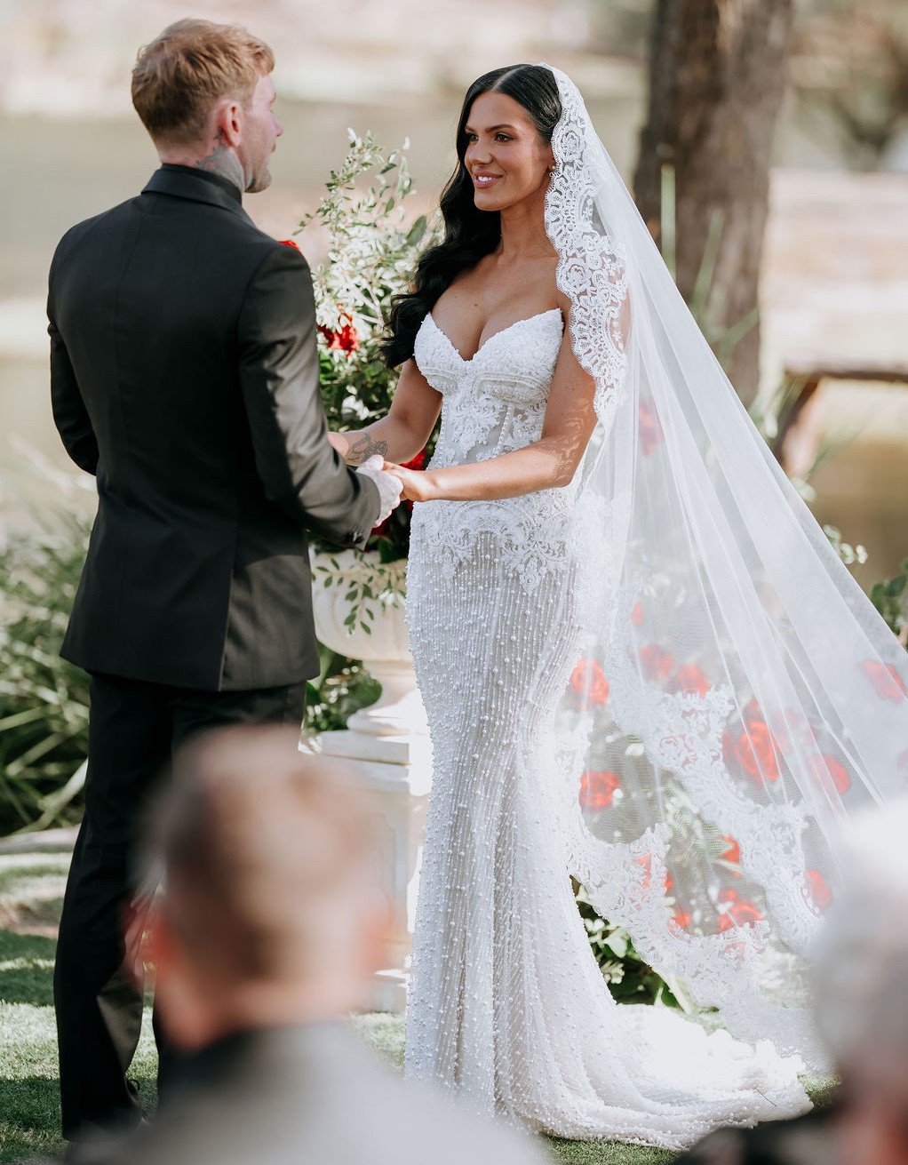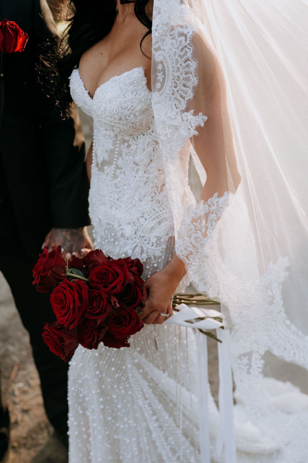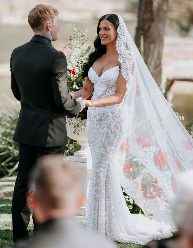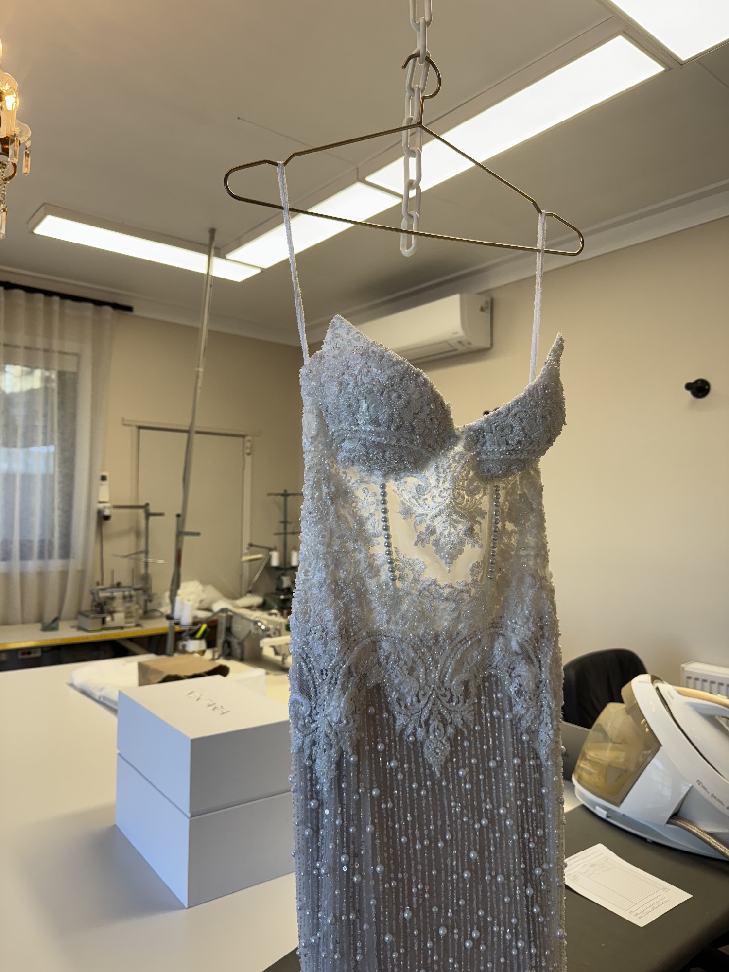 Custom made Paige Nektaria gown covered in pearls and custom french beaded lace made in march 2025 - Worn for 5 hours and professionally dry cleaned will come with an unworn custom pearl veil.