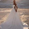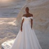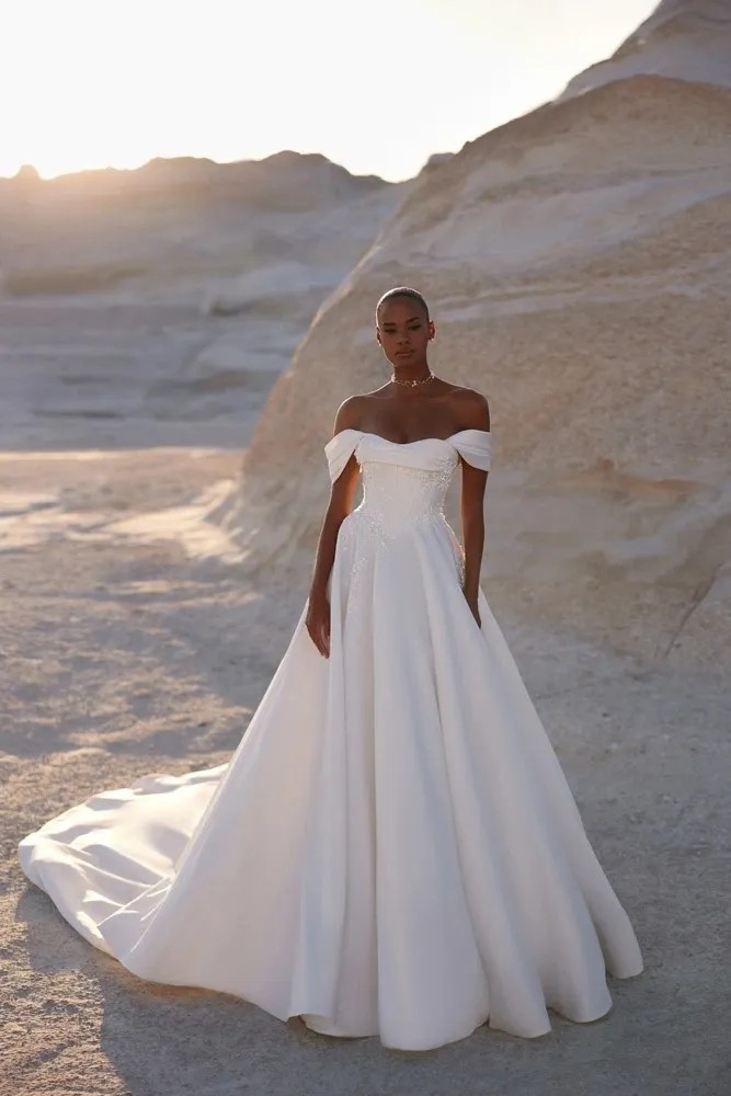 Chabli by Eva Lendel is a delicate bridal gown with off-the-shoulders neckline and soft drapery overlaying the top of the corset. The basque waistline creates a flawless silhouette and the floral embroidery adorning the corset on the sides and descending to the skirt adds a touch of natural femininity.