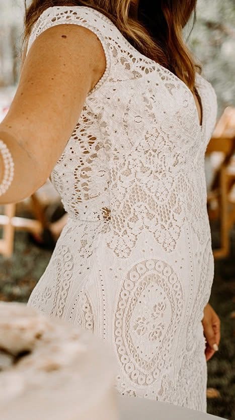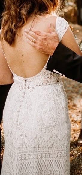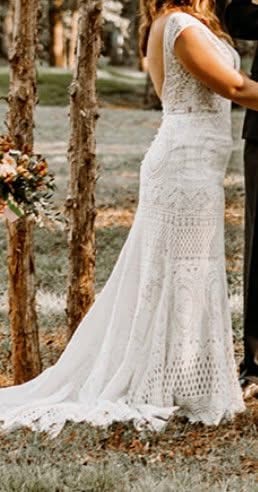 I've included photos from the wedding day and photos of the dress's current condition. It's a size 6S and there were slight alterations to the waist and sleeves, but the dress is backless, so the fit is more flexible.