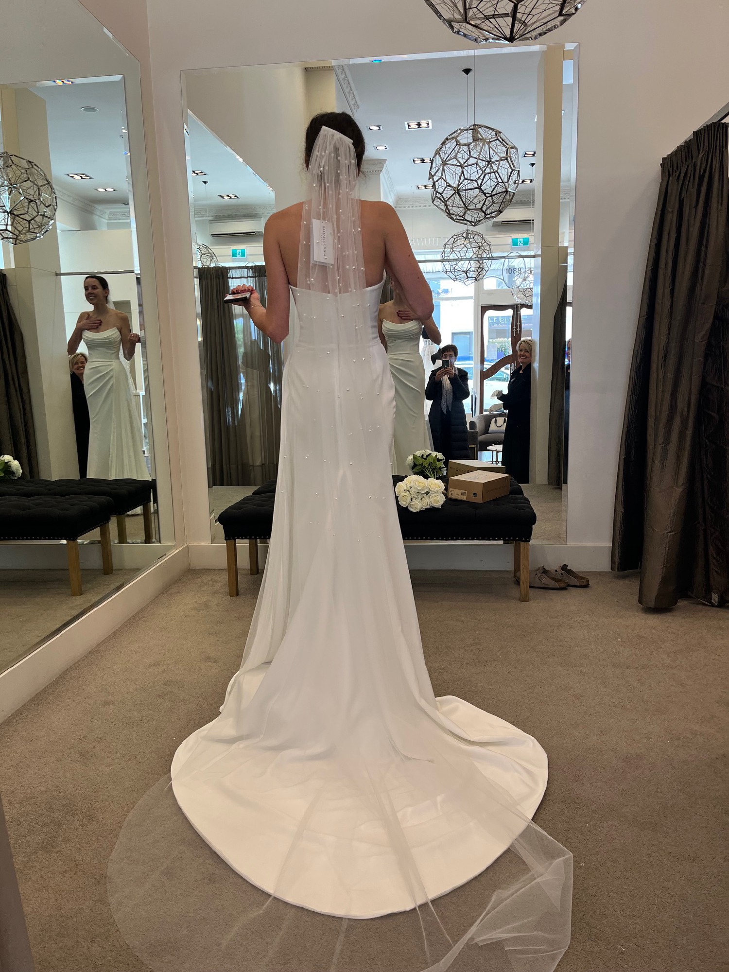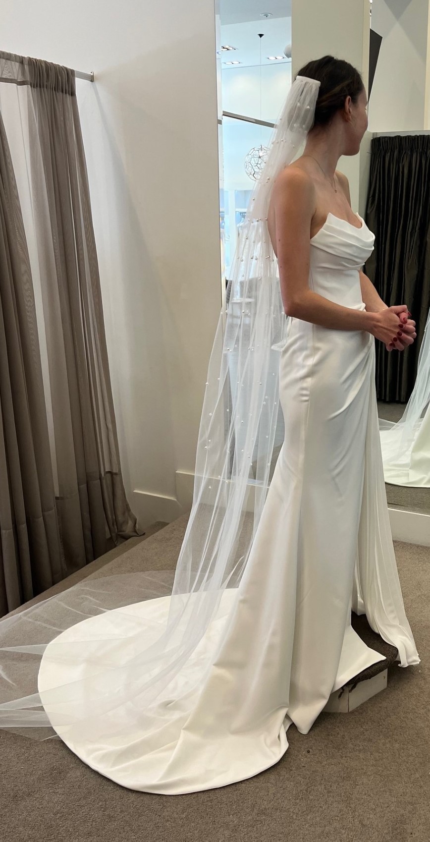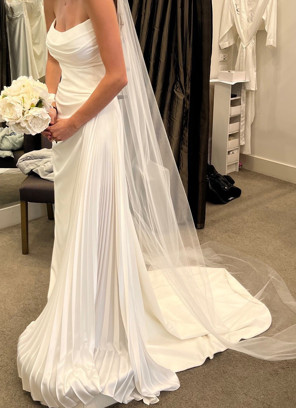 Brand new Size 6 - tried on once at collection - this has NOT been ALTERED so the length is totally flexible.
