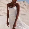 Delicate, detailed dress with a softly draped neckline. The skirt features an eye-catching slit on the left side and an amazing, pleated skirt