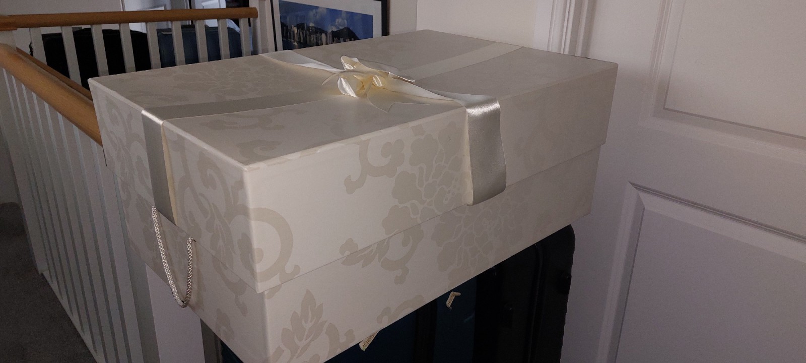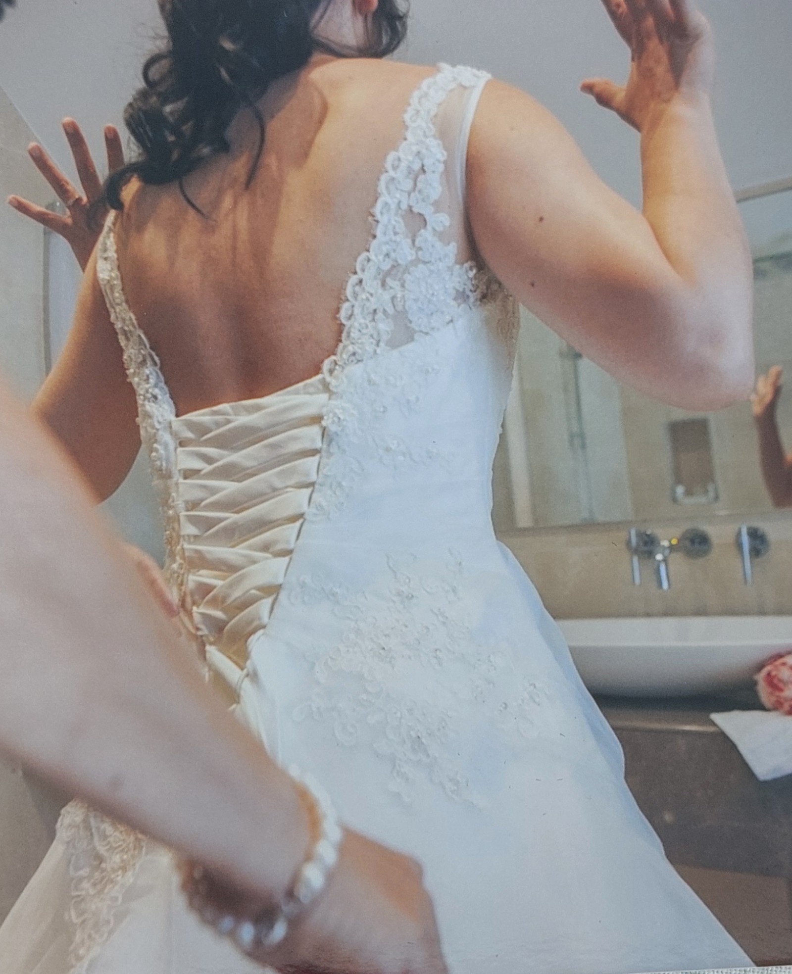 The wedding dress has been dry cleaned and stored in a beautiful box. It has only been worn on my wedding day in 2017. It is in good condition.