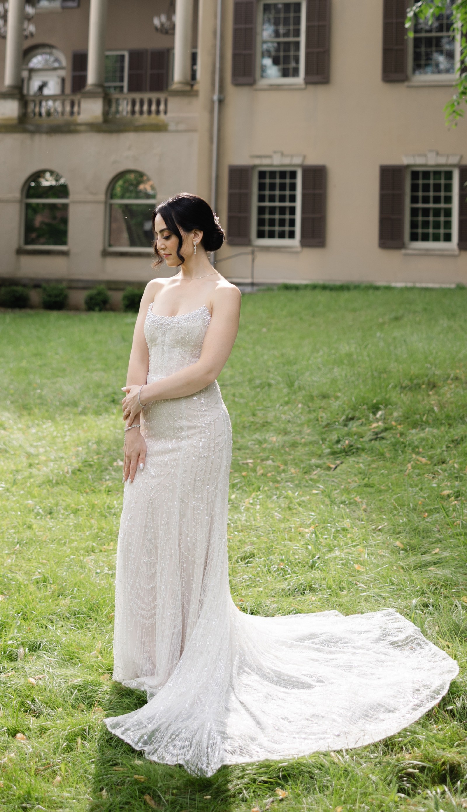 This dress is soft yet glam elegance that stuns, shift and sparkles in the light. Detachable Watteau train & optional spaghetti straps included. Worn once, professionally dry-cleaned. Made to order early Spring 2025.
