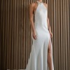 The Harlyn gown is proof that “less is more”. Cut in our lustrous luxe satin, this slinky slip of a gown is elevated by a chic draped turtle neck. A slit and a sheer illusion back detail both lend sultry peeks of skin.